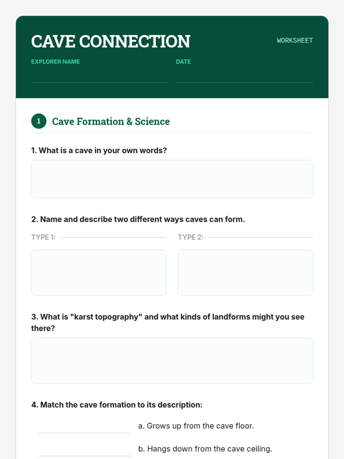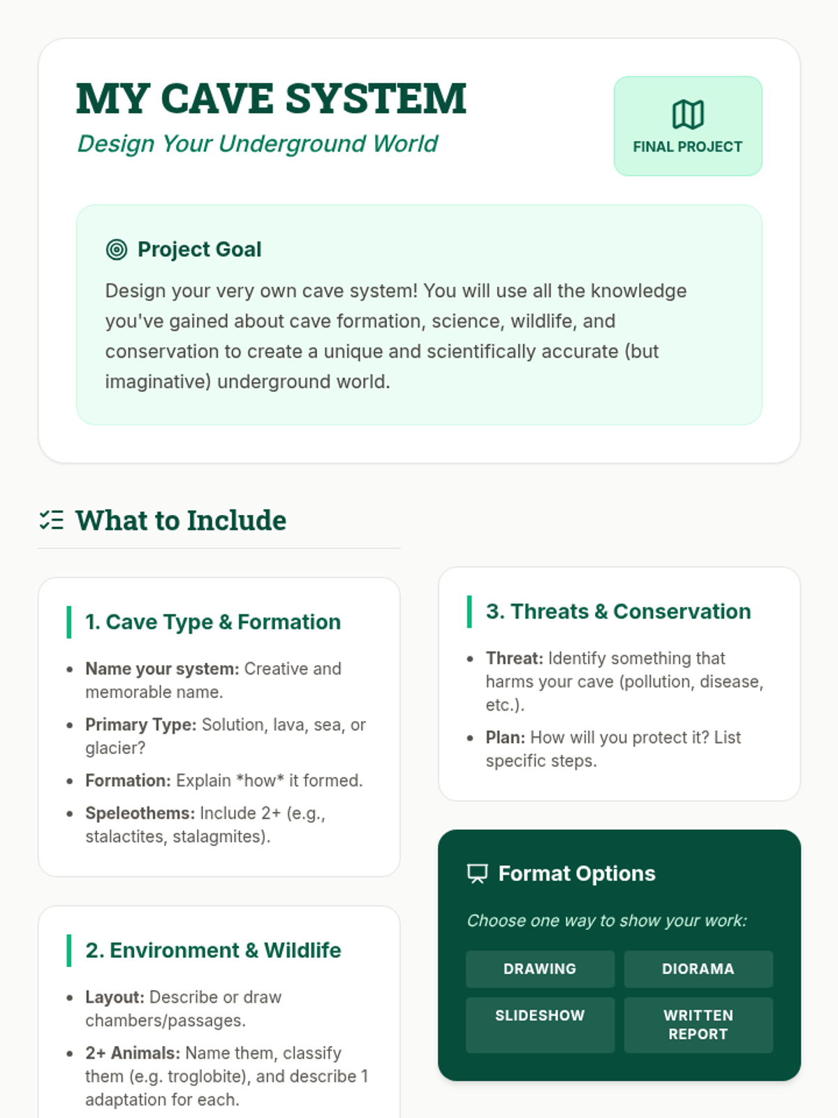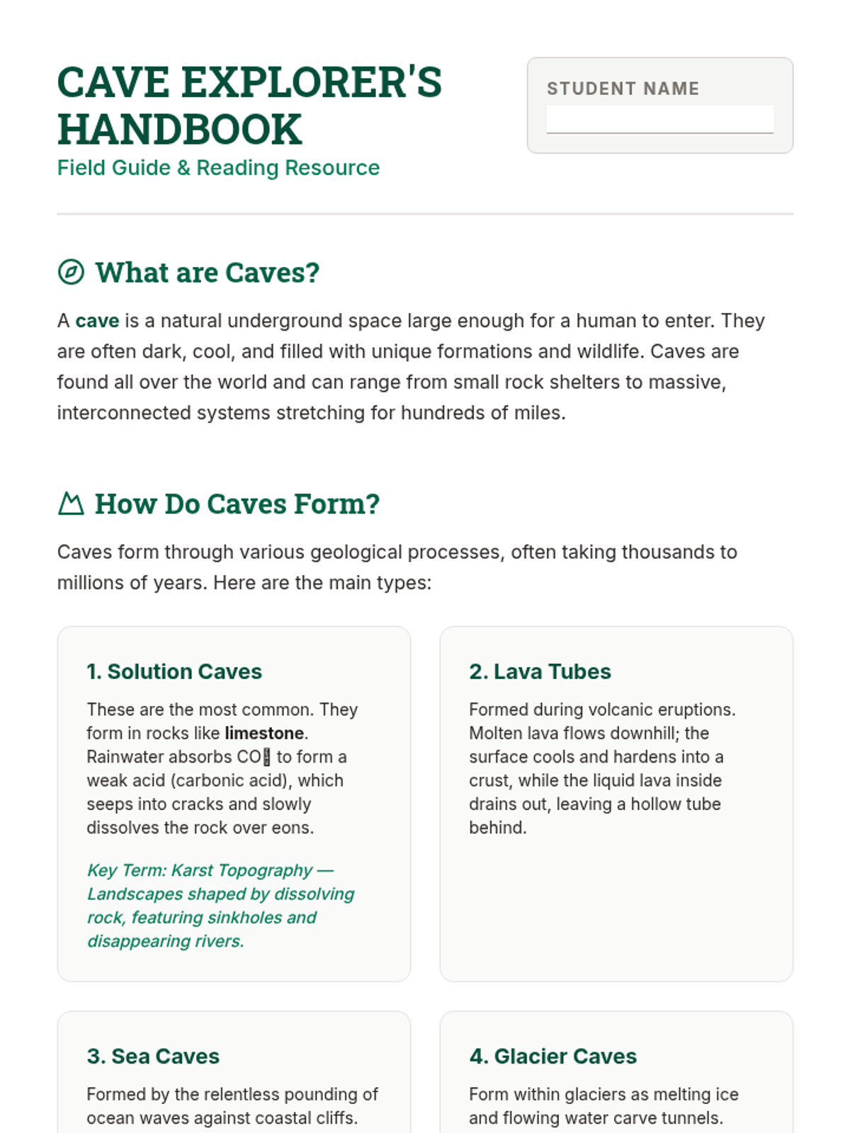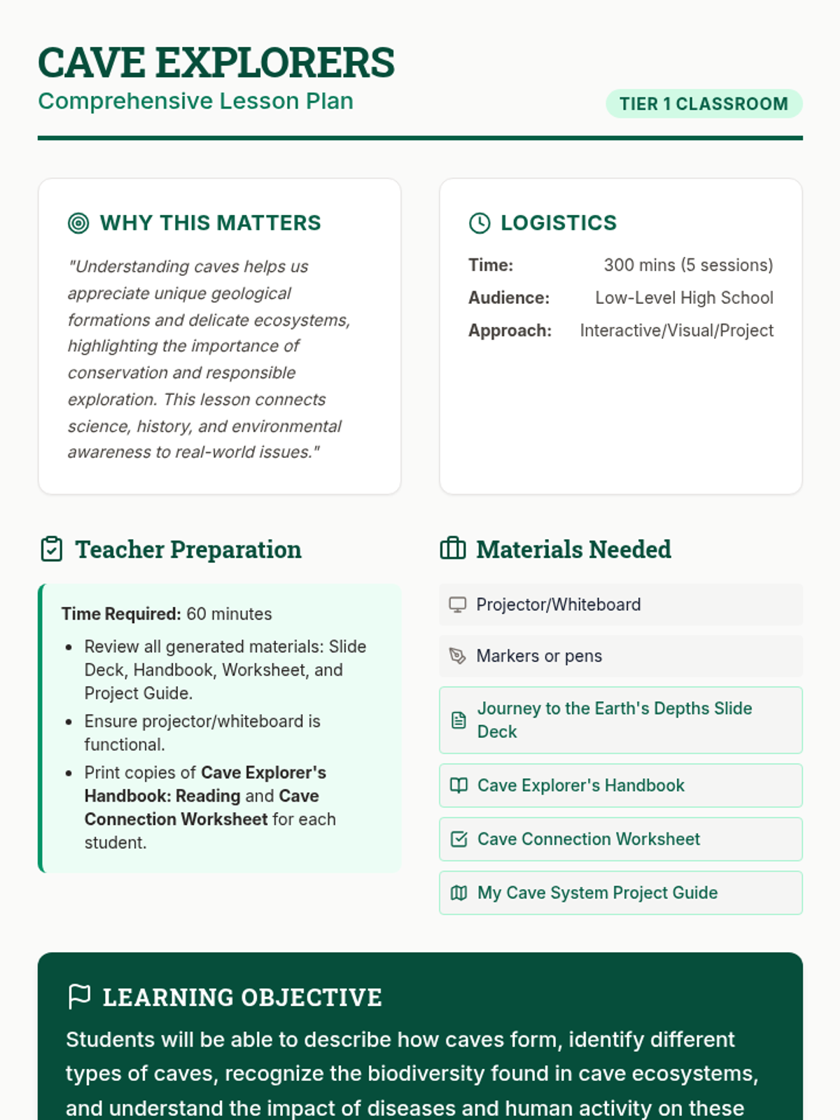 A comprehensive 5-session unit exploring cave formation, biodiversity, and conservation, designed for low-level high school students. Students will learn about different types of caves, the unique creatures that inhabit them, and the environmental threats facing these fragile ecosystems.