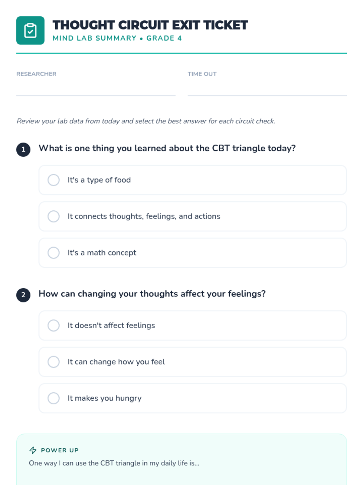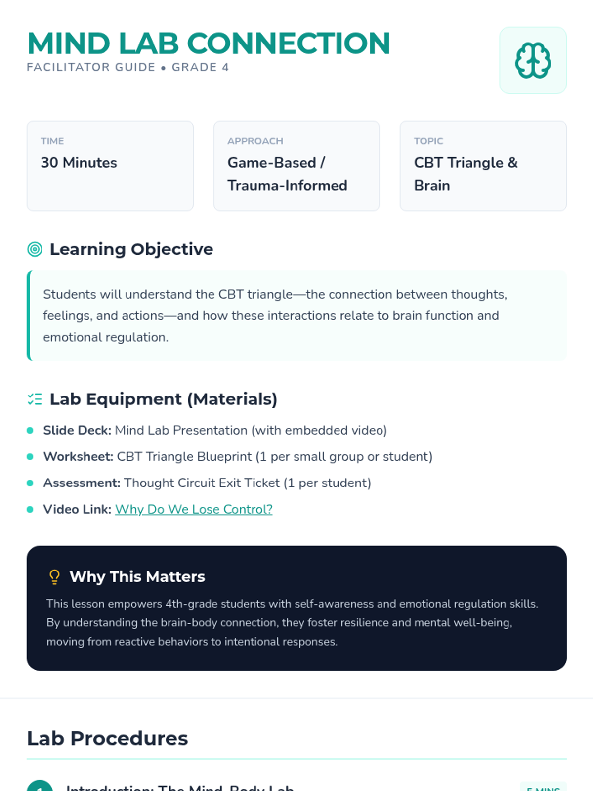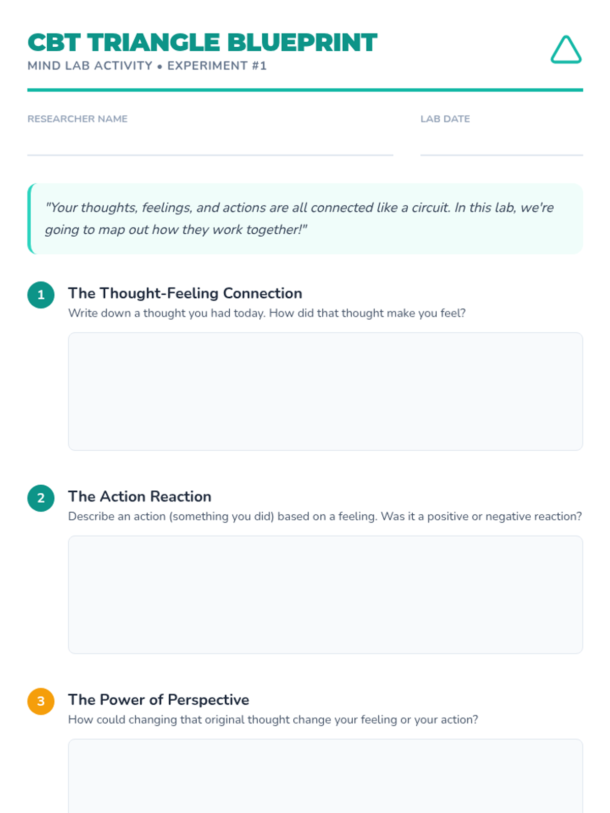 This lesson introduces 4th-grade students to the CBT triangle, which connects thoughts, feelings, and behaviors, and its relationship with brain function. Through engaging activities, students will learn how their thoughts can influence their emotions and actions.