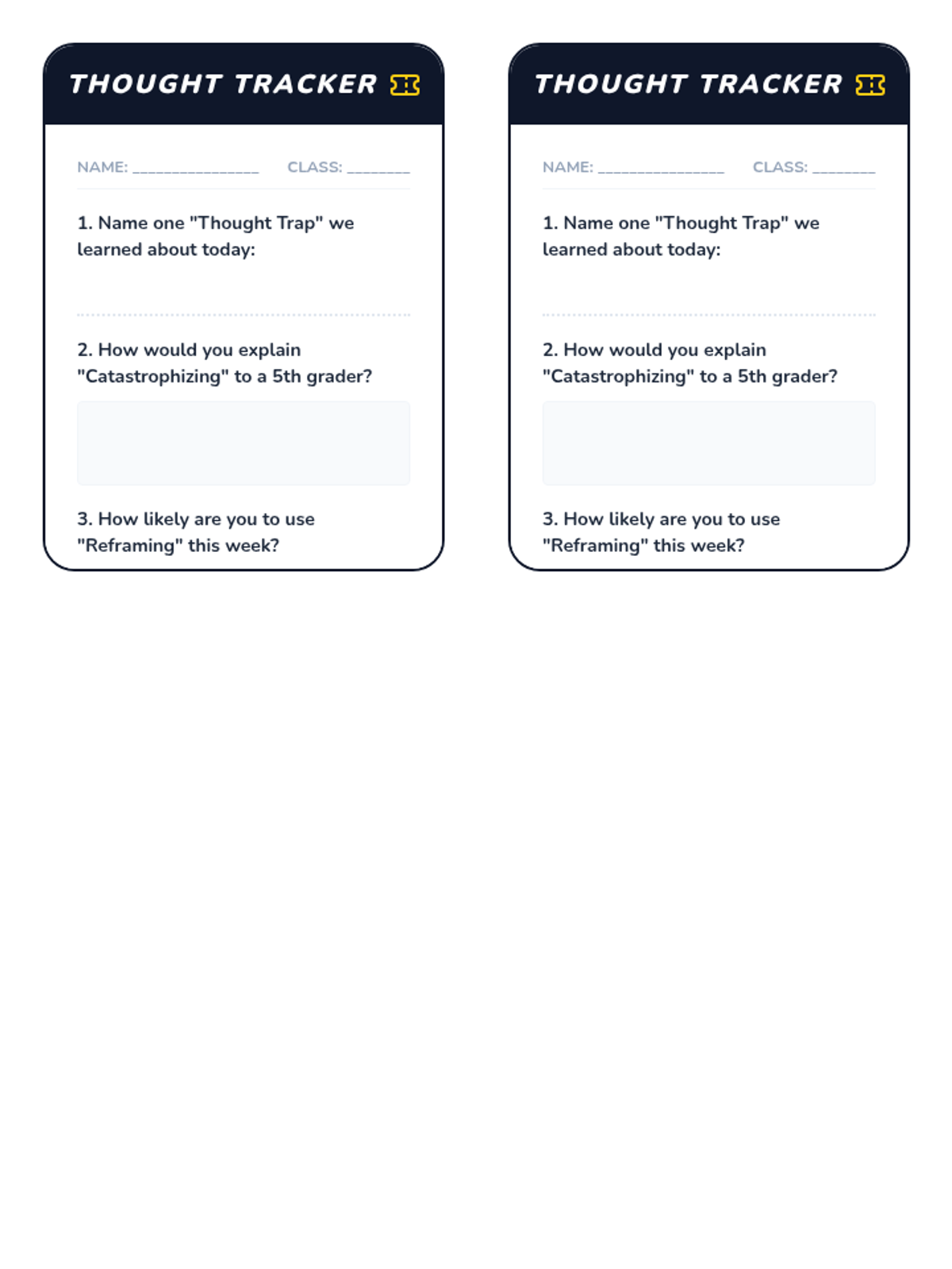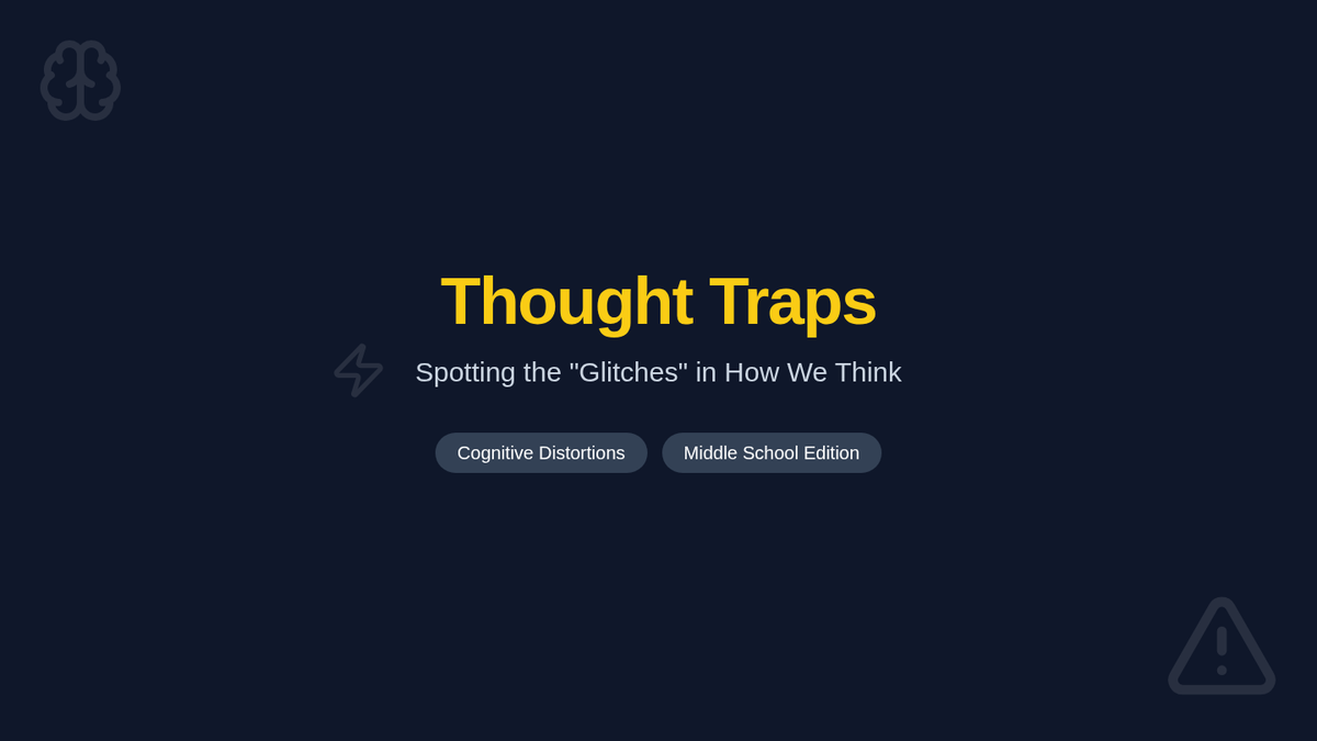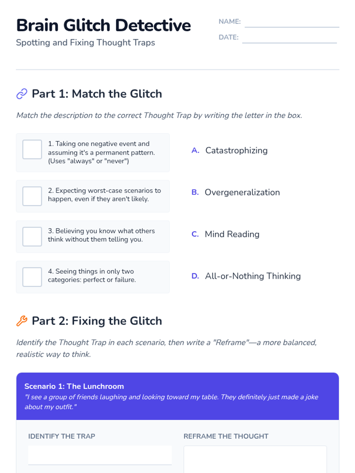 A lesson helping middle schoolers identify and challenge common cognitive distortions using the 'Thought Traps' framework. Students will learn to recognize patterns like catastrophizing and mind reading and practice reframing them.