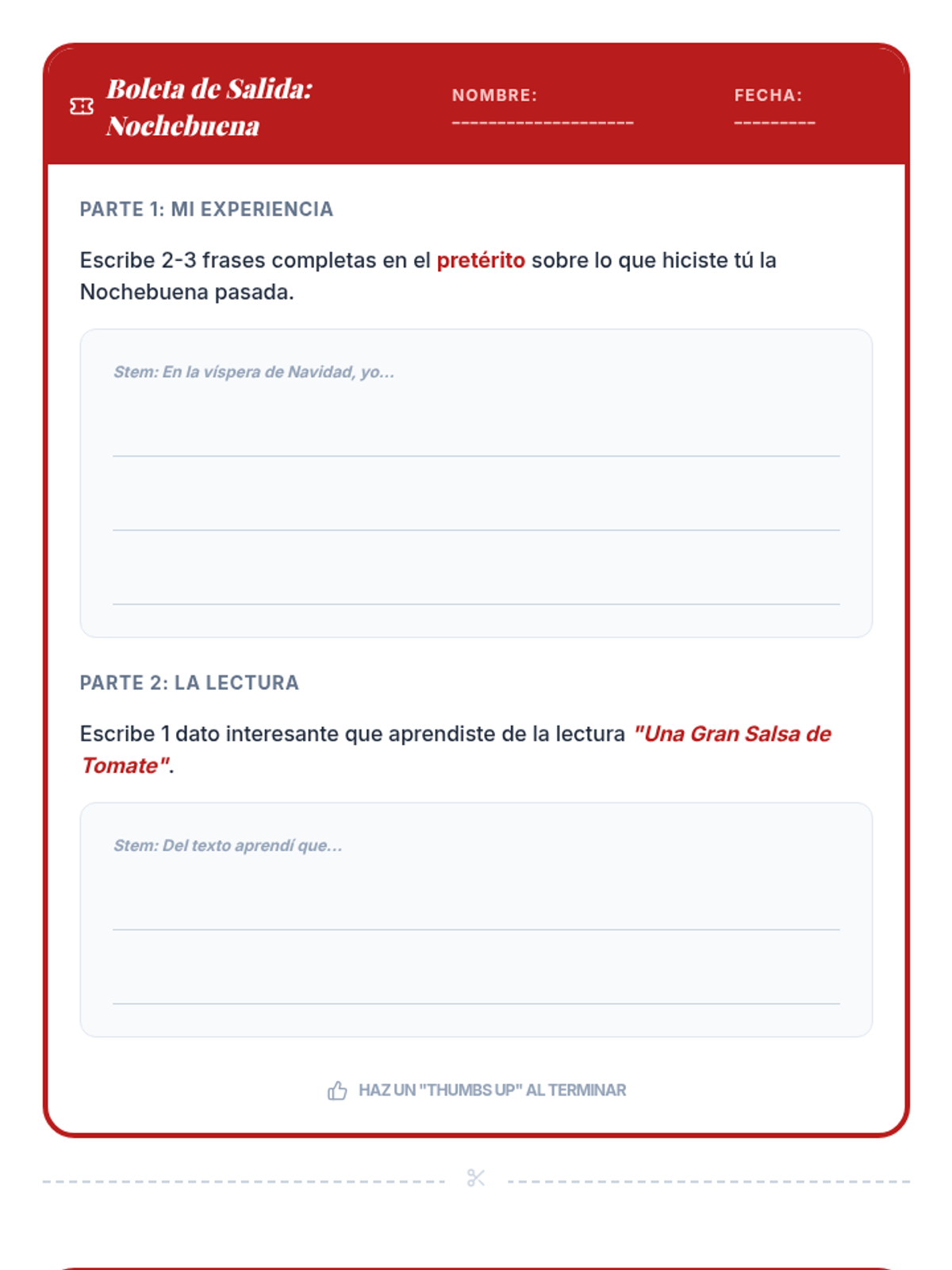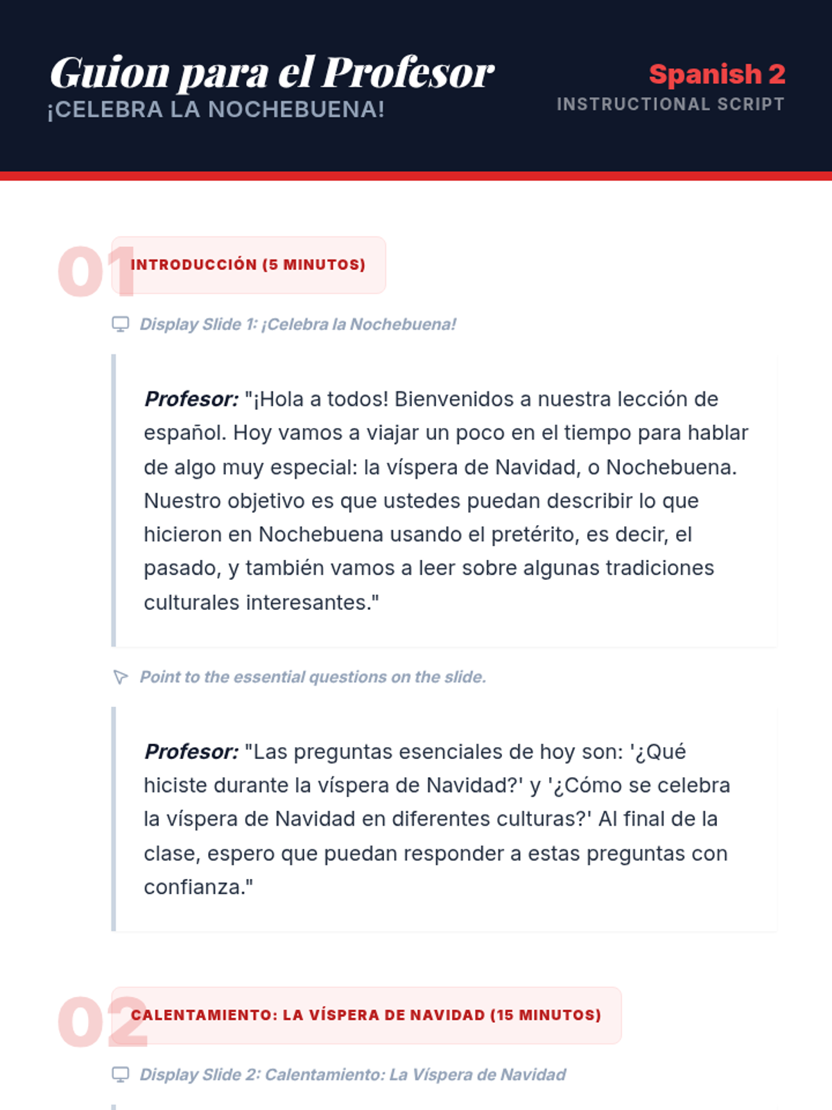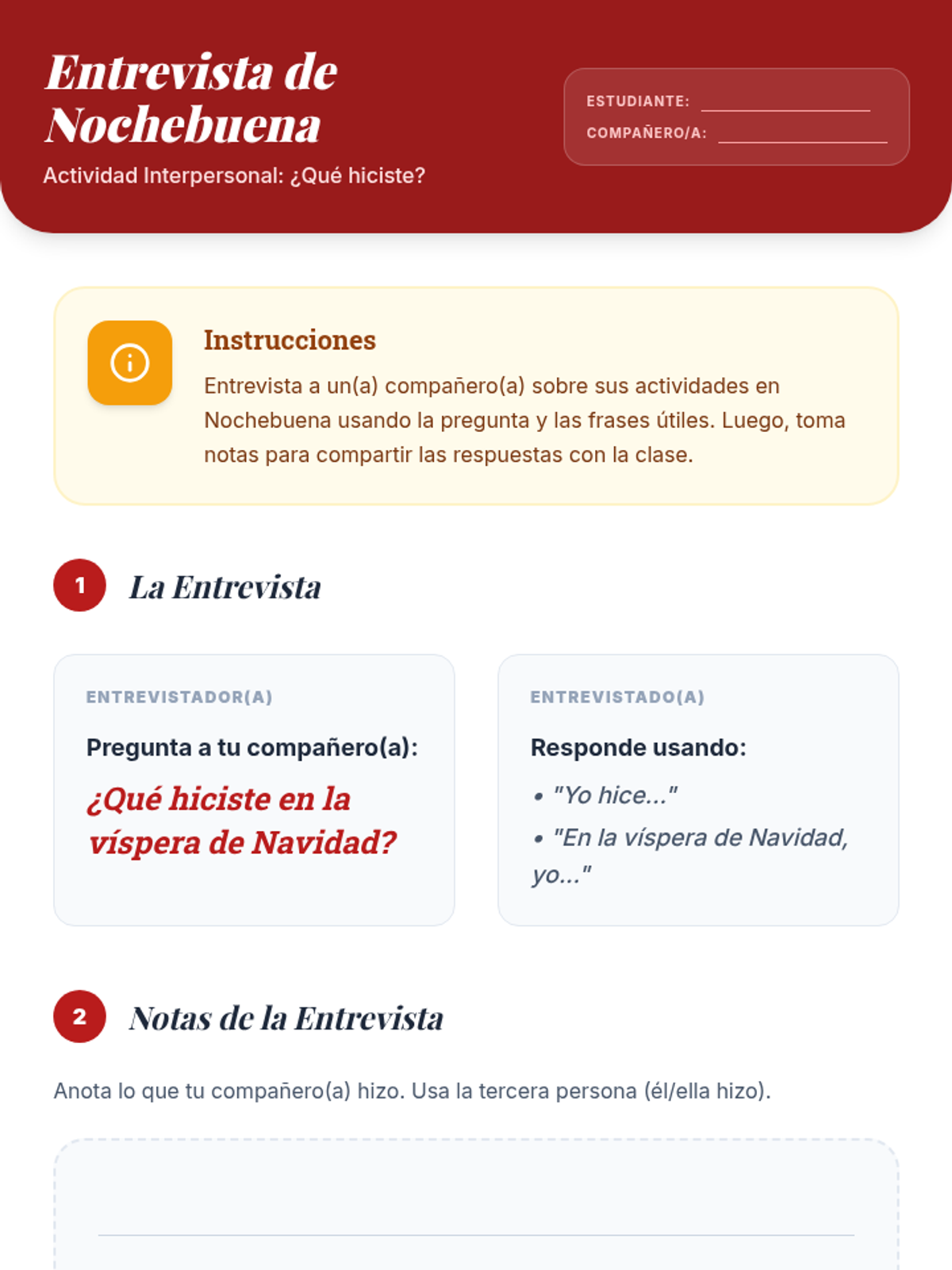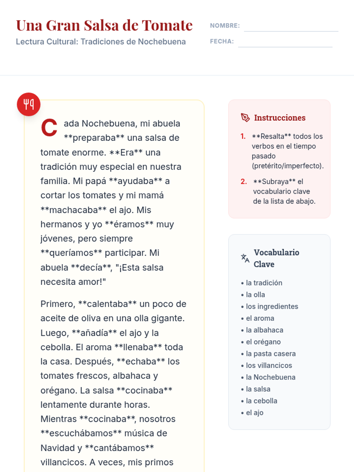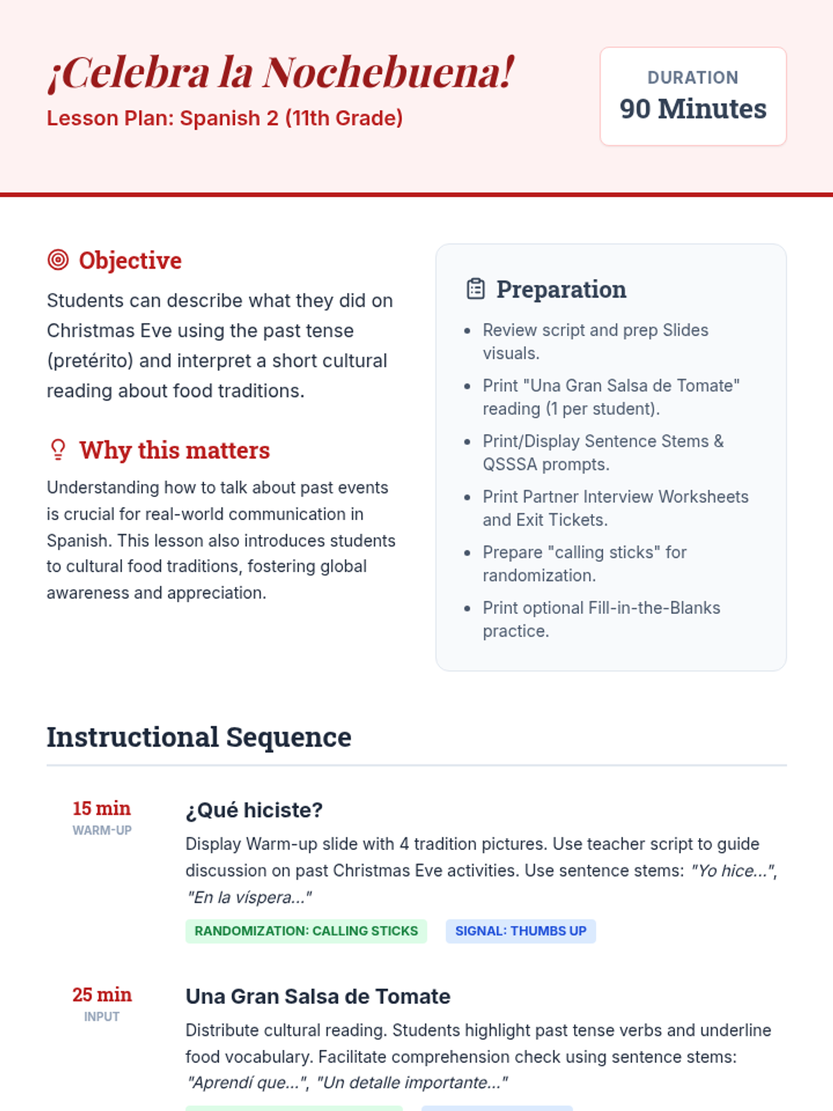 A 90-minute Spanish 2 lesson for 11th graders focusing on describing Christmas Eve traditions using the preterite tense and interpreting a cultural reading about food.