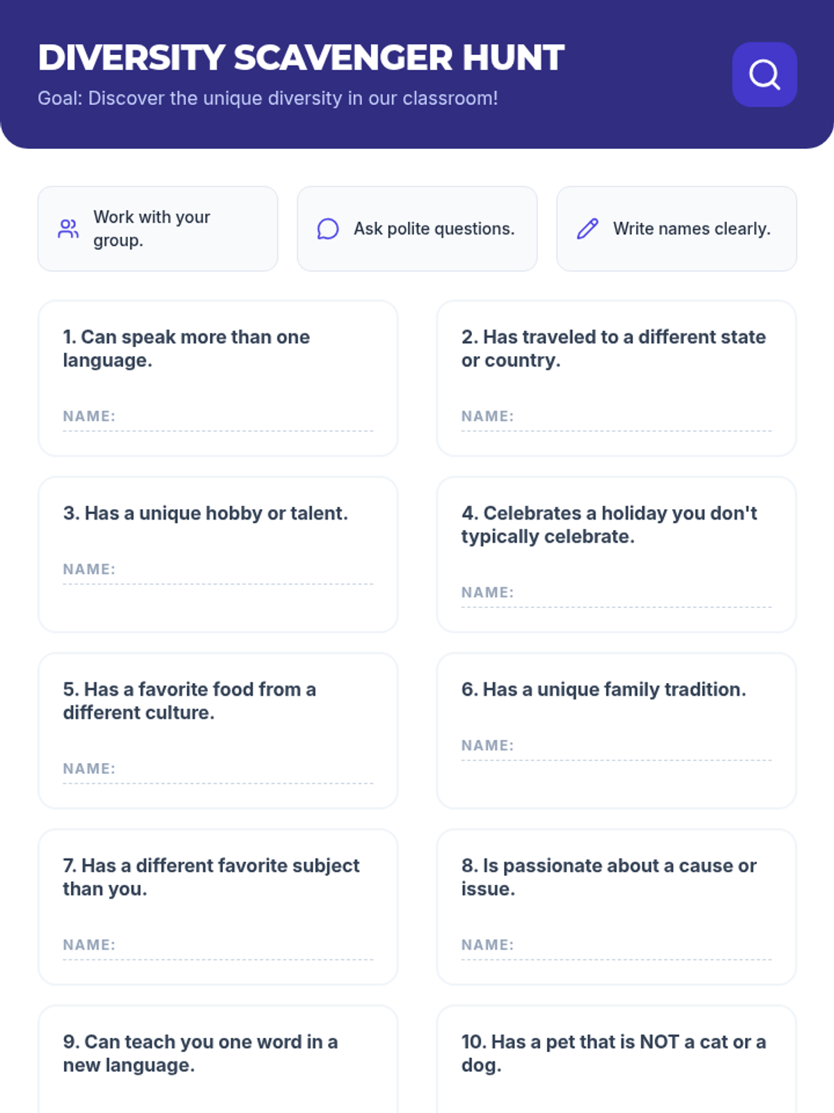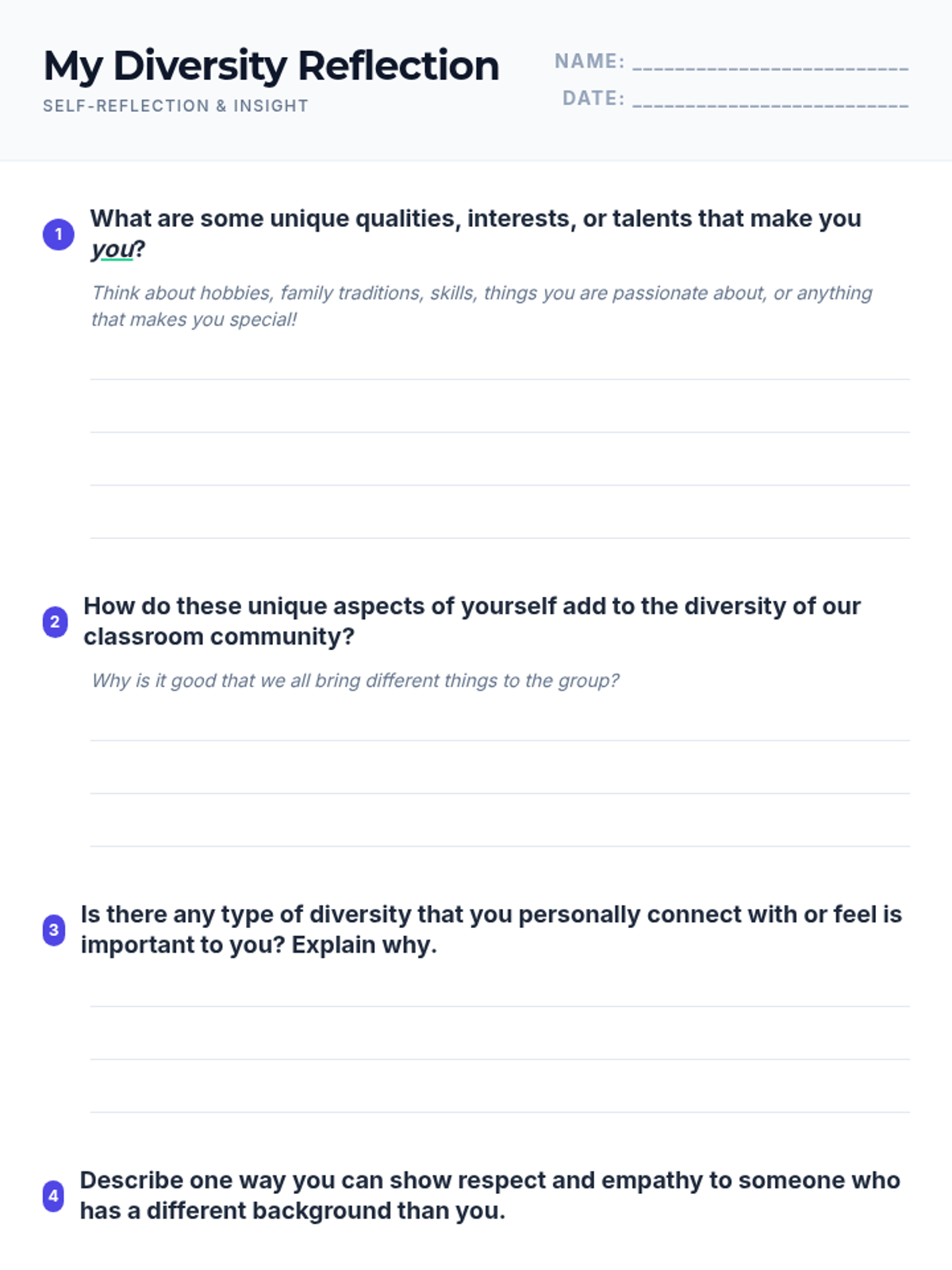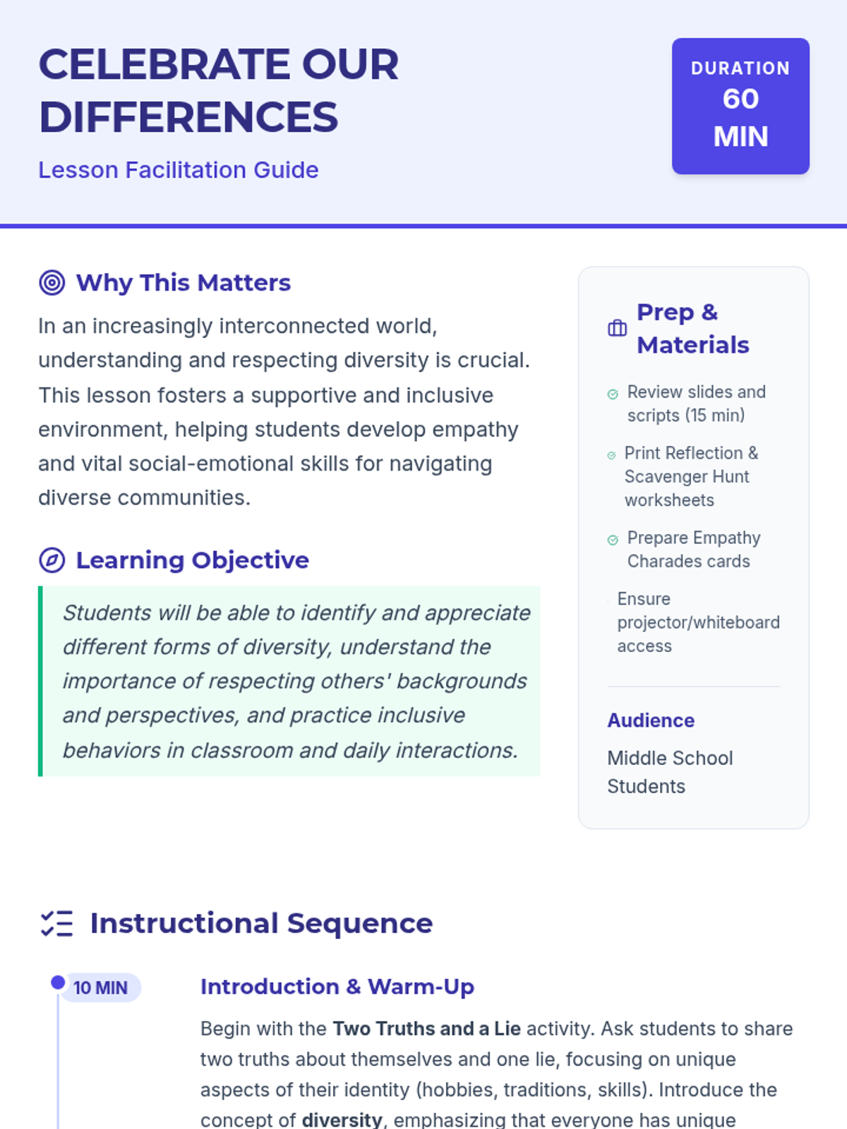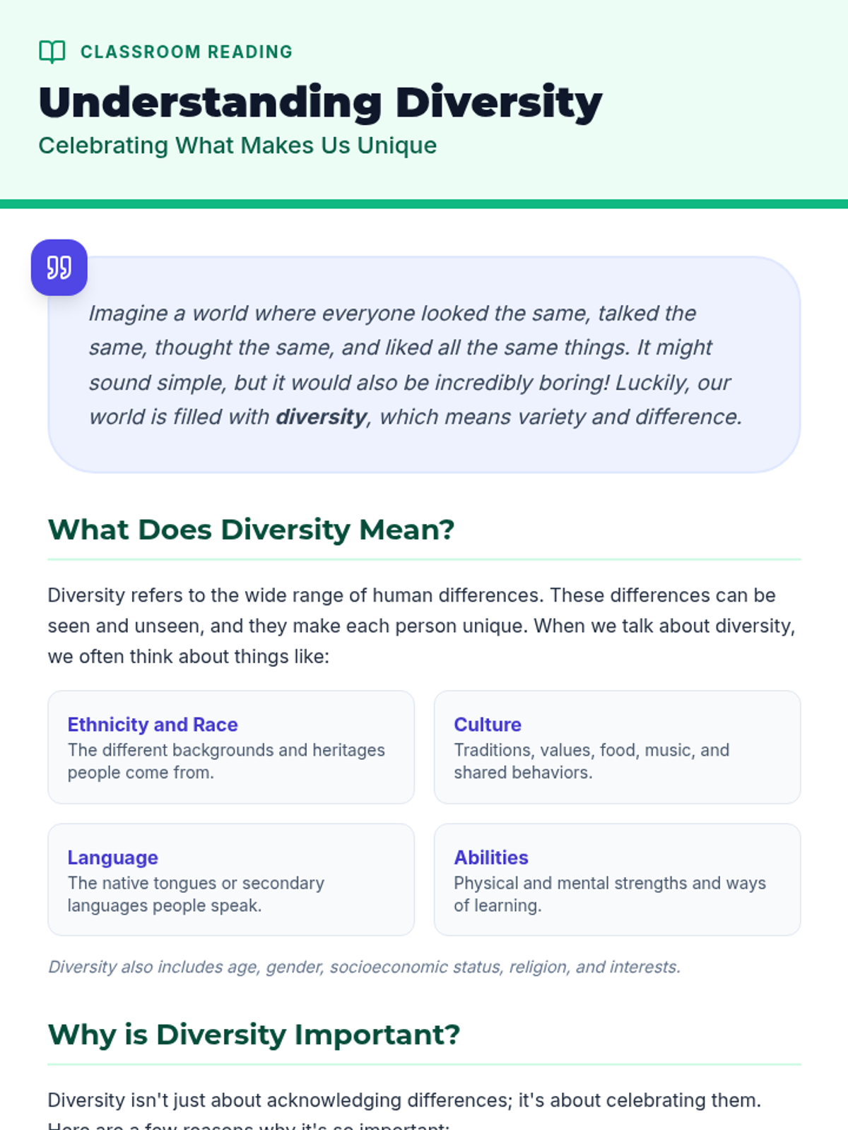 This lesson helps students understand and appreciate the diverse backgrounds, cultures, and perspectives within their classroom and the wider world. By exploring various aspects of diversity, students will learn the importance of respect, empathy, and inclusion.