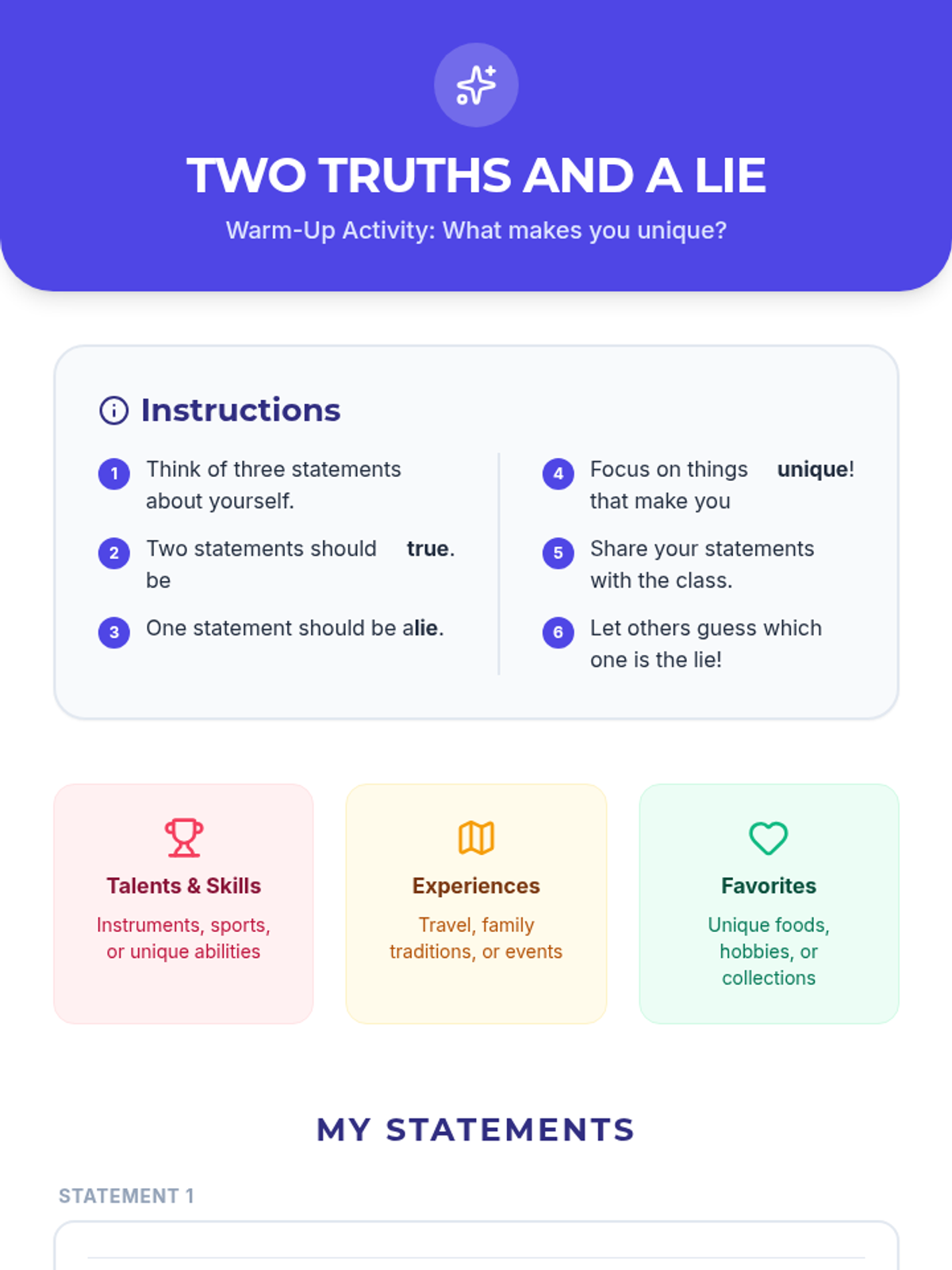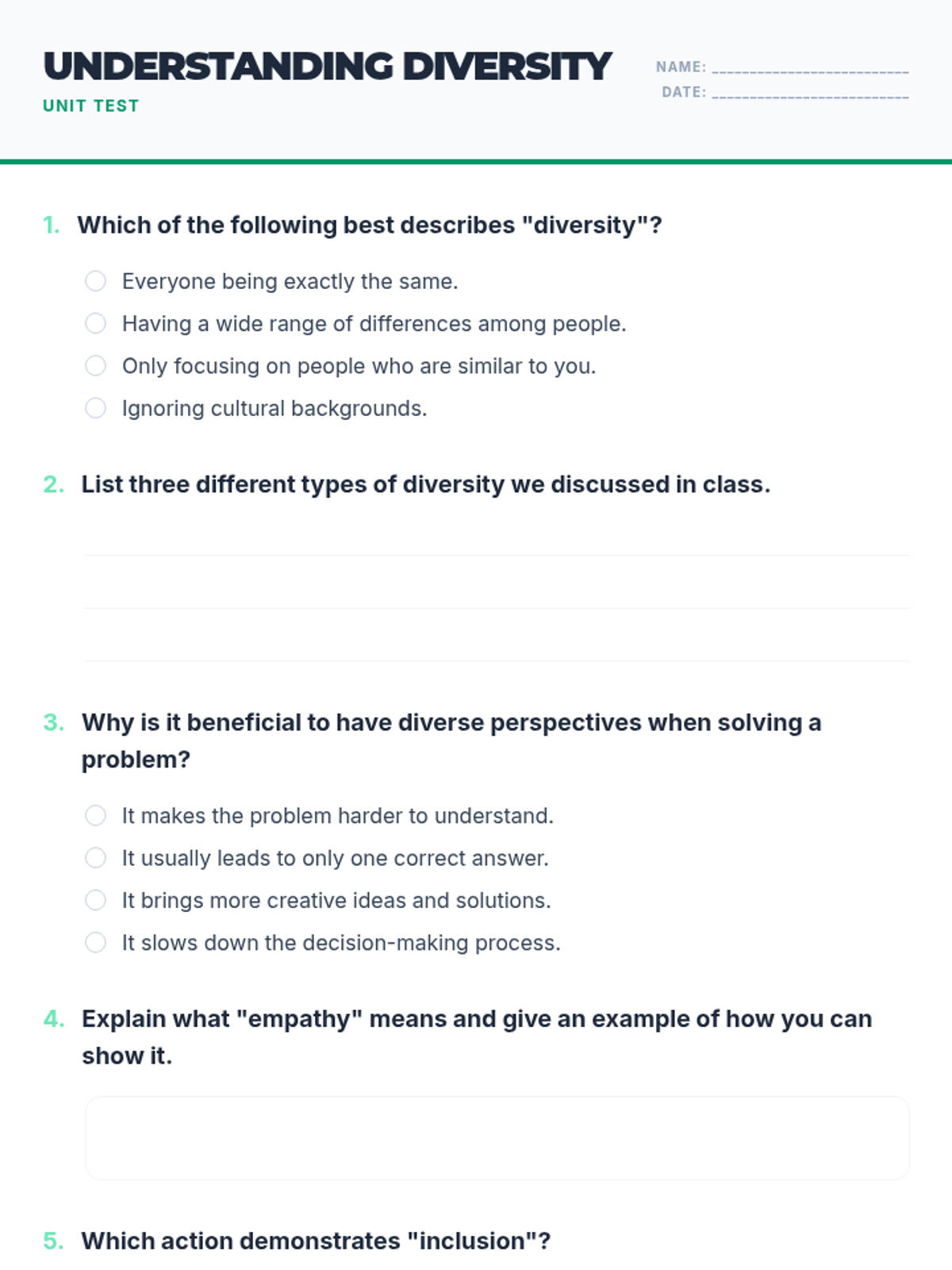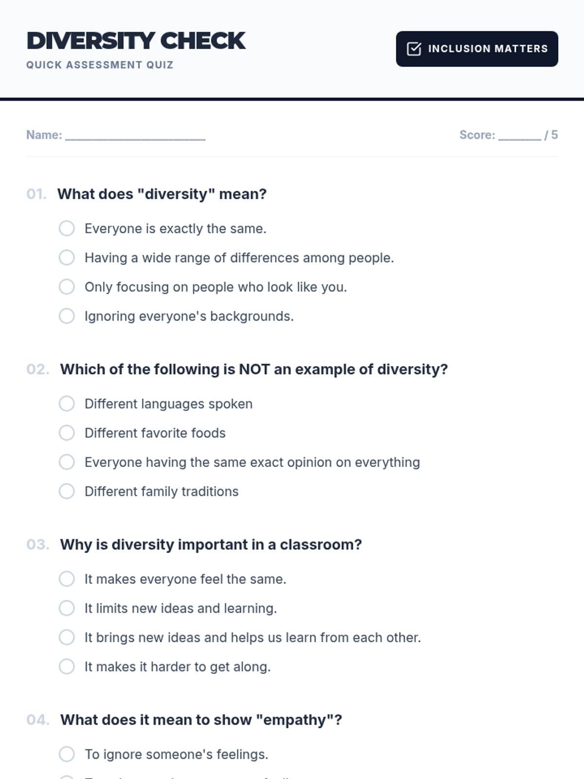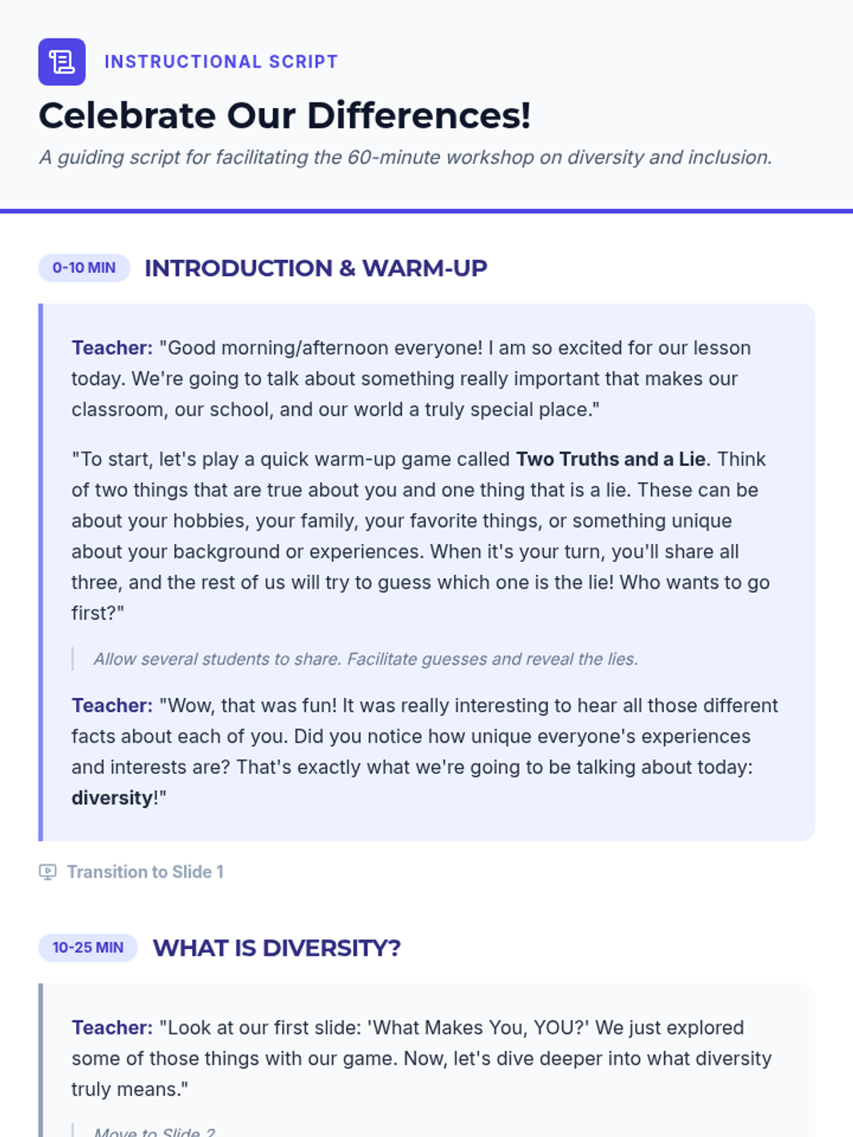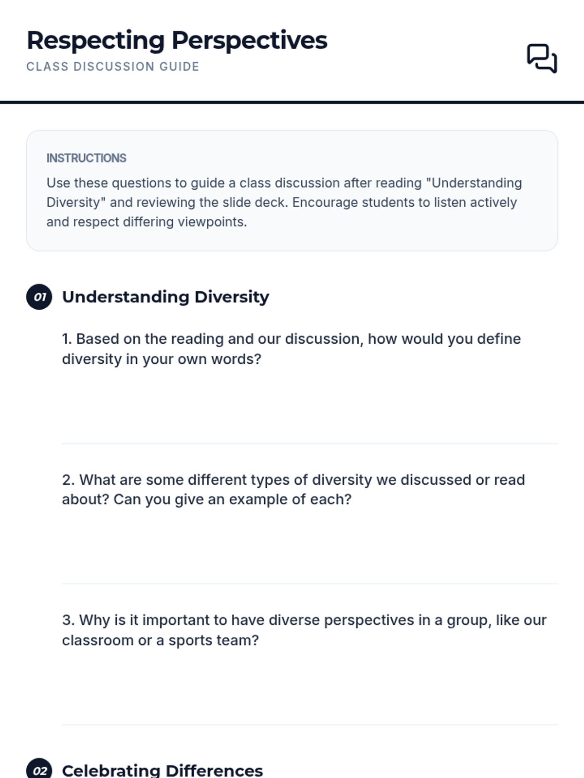 This lesson helps students understand and appreciate the diverse backgrounds, cultures, and perspectives within their classroom and the wider world. By exploring various aspects of diversity, students will learn the importance of respect, empathy, and inclusion.