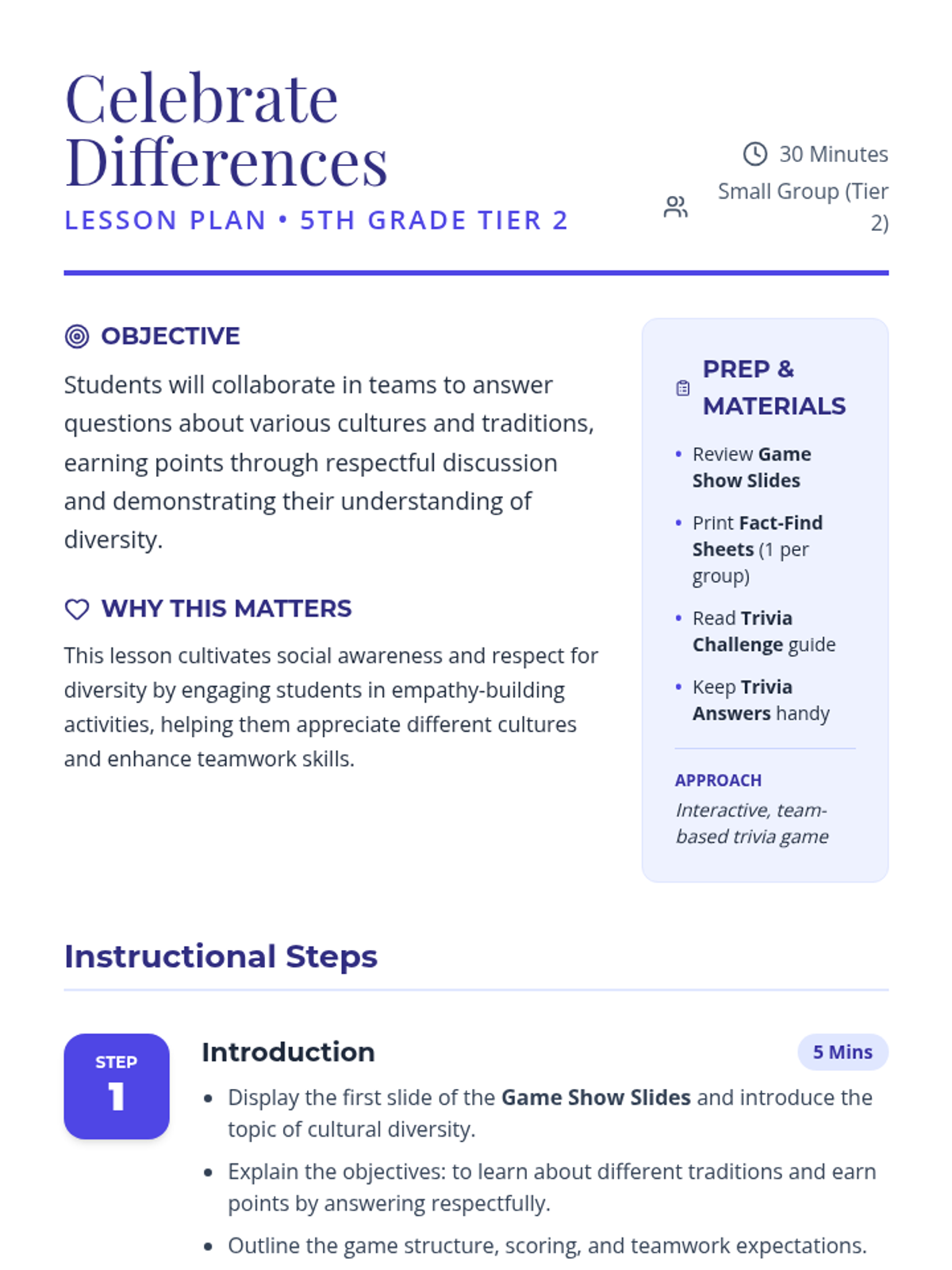 In this 30-minute Tier 2 session for 5th grade groups, students engage in a respectful, game-based exploration of cultures and traditions, sharpening their social awareness and respect for diversity through guided questions and earning points in teams. This lesson fosters empathy and understanding, helping students appreciate the rich tapestry of identities around them.