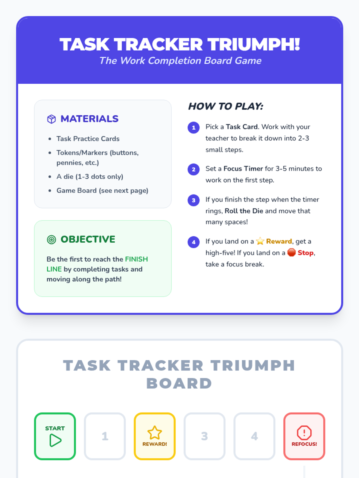Teaches SMART goal setting for work completion and provides a celebratory game to practice skills.