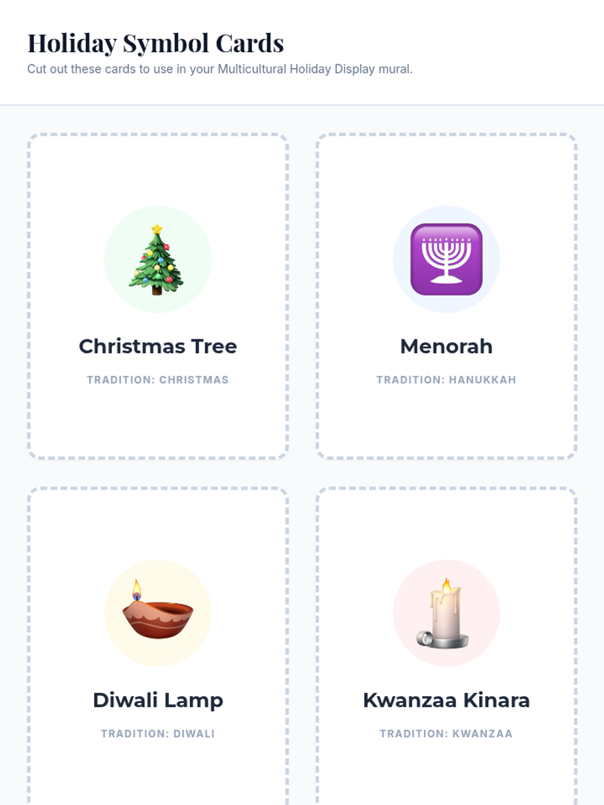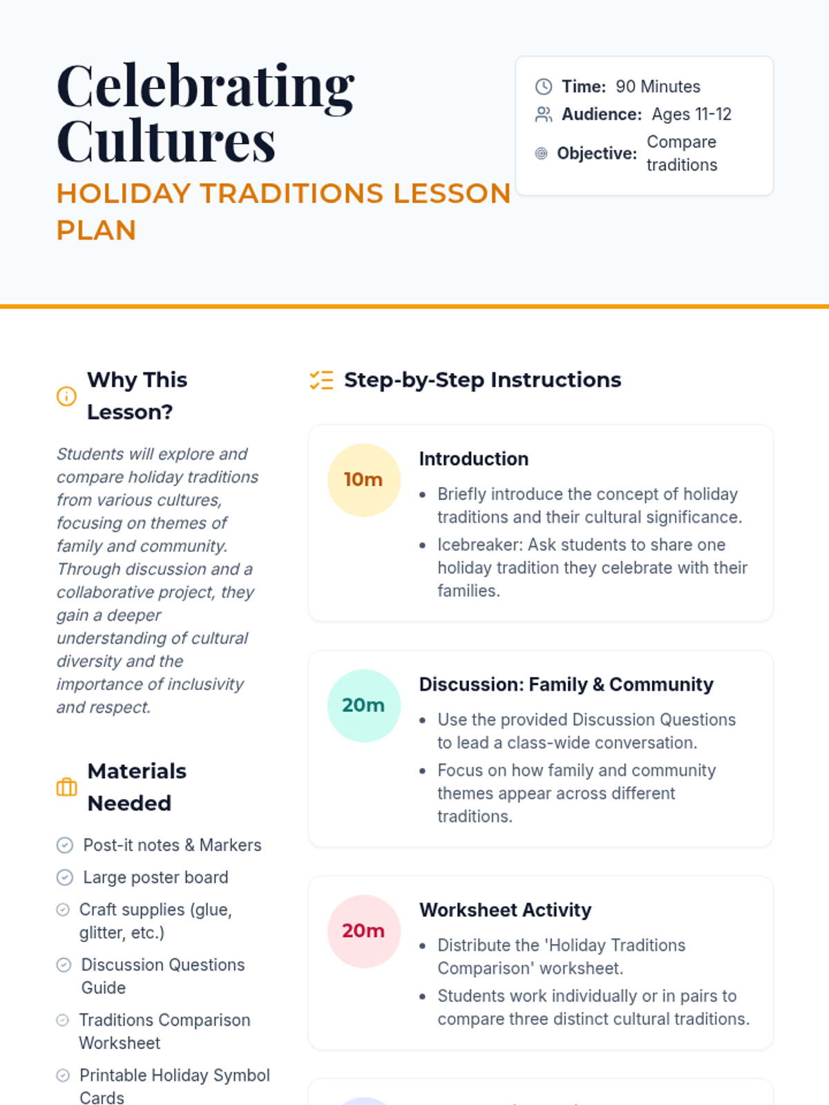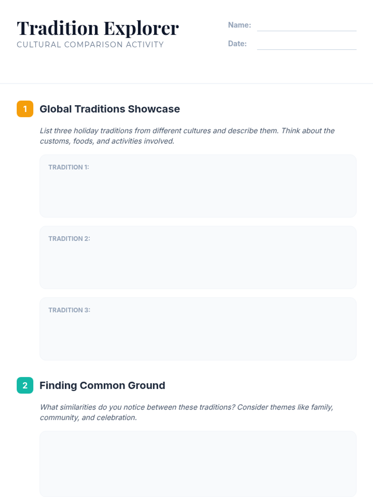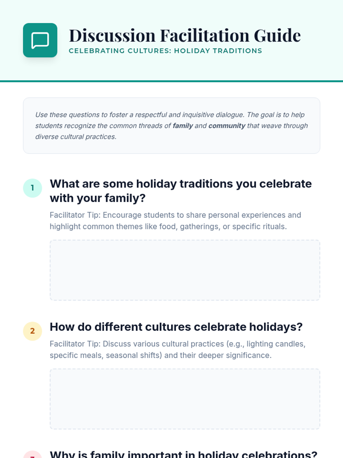 Students explore and compare holiday traditions from various cultures, focusing on themes of family and community through discussion and collaborative projects.