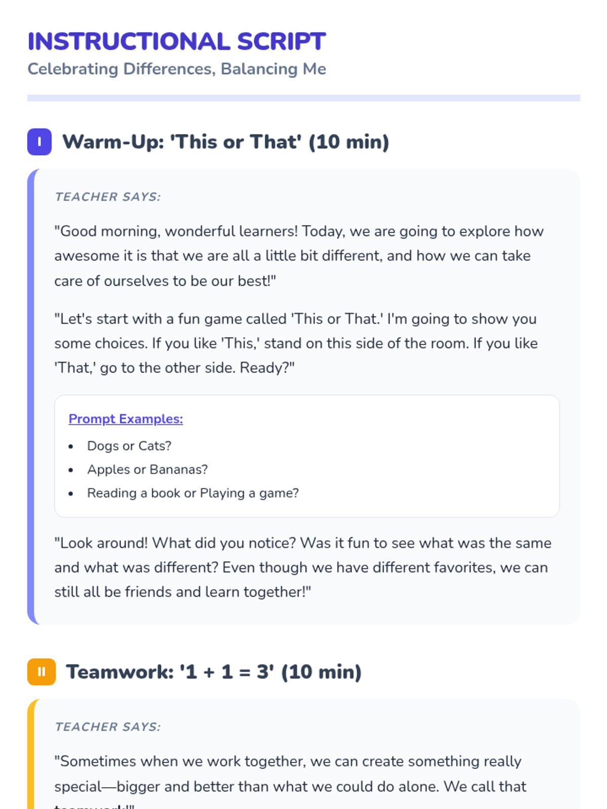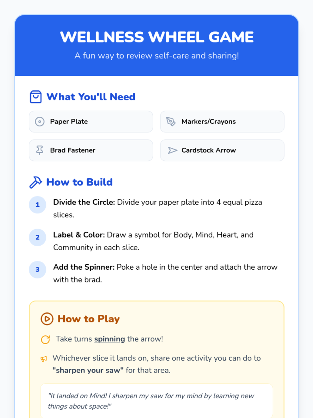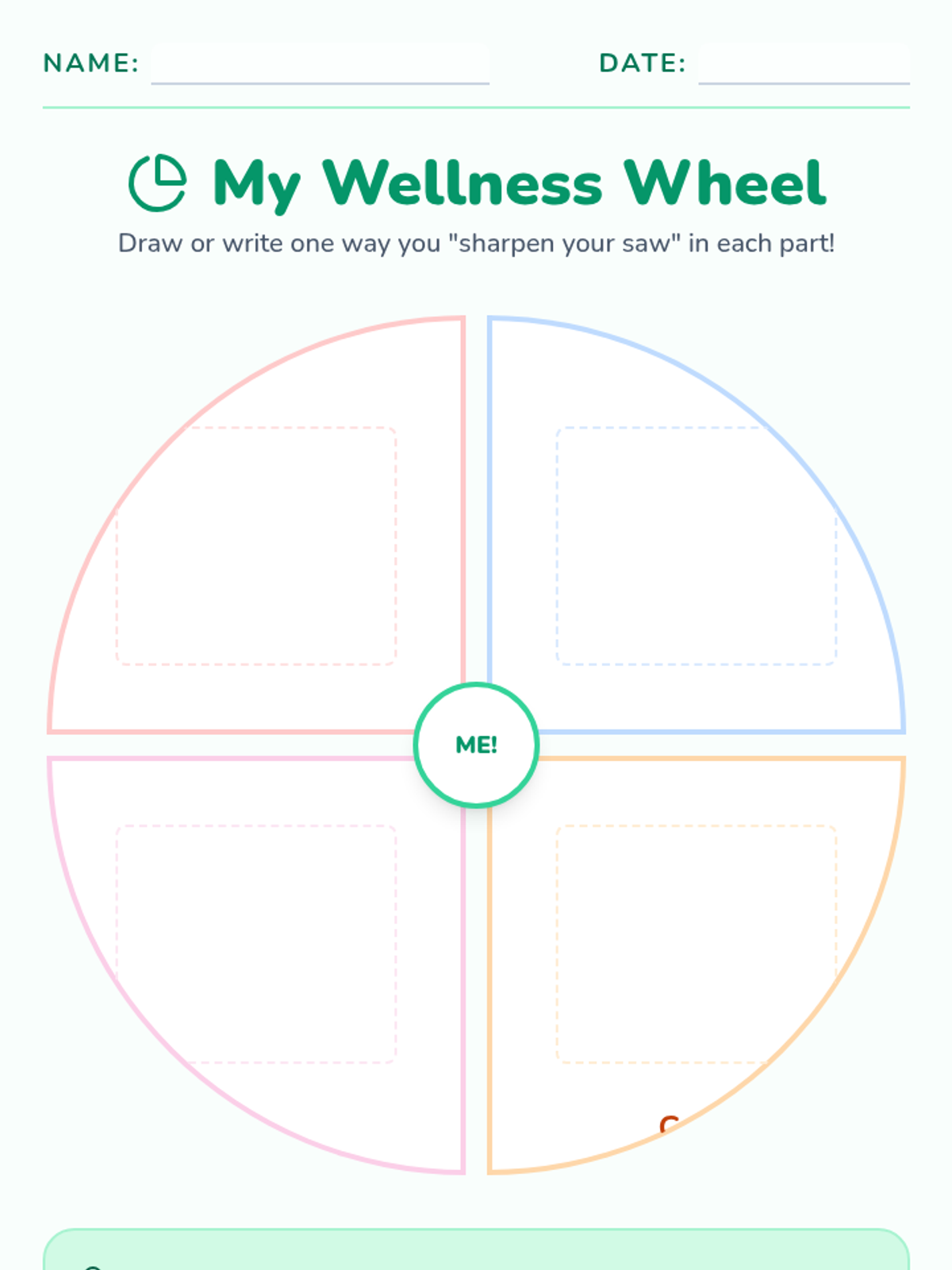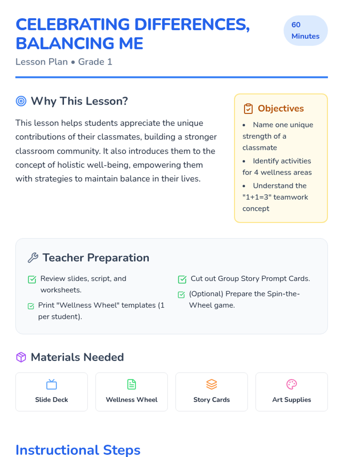 This 60-minute lesson for 1st-grade students helps them recognize and appreciate the unique strengths of their classmates while introducing the concept of holistic wellness through the 'Wellness Wheel'. Students explore teamwork, creative storytelling, and self-care strategies.