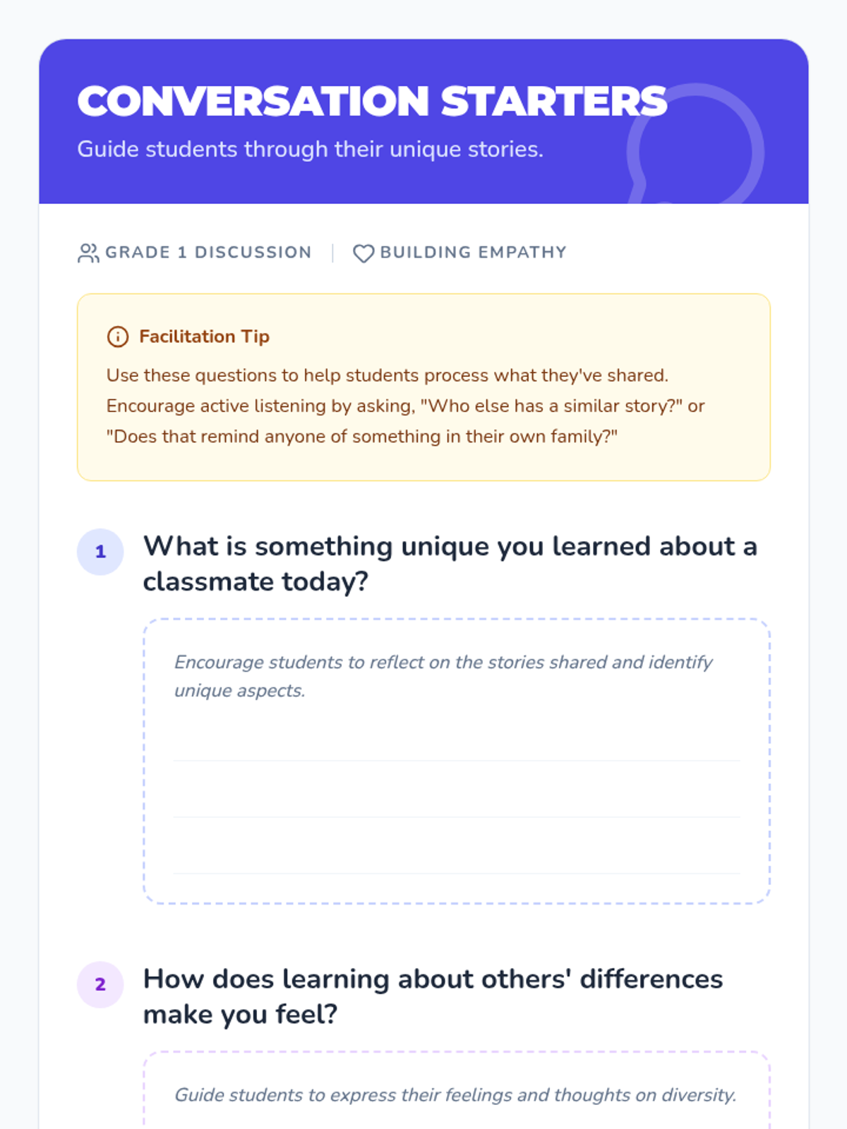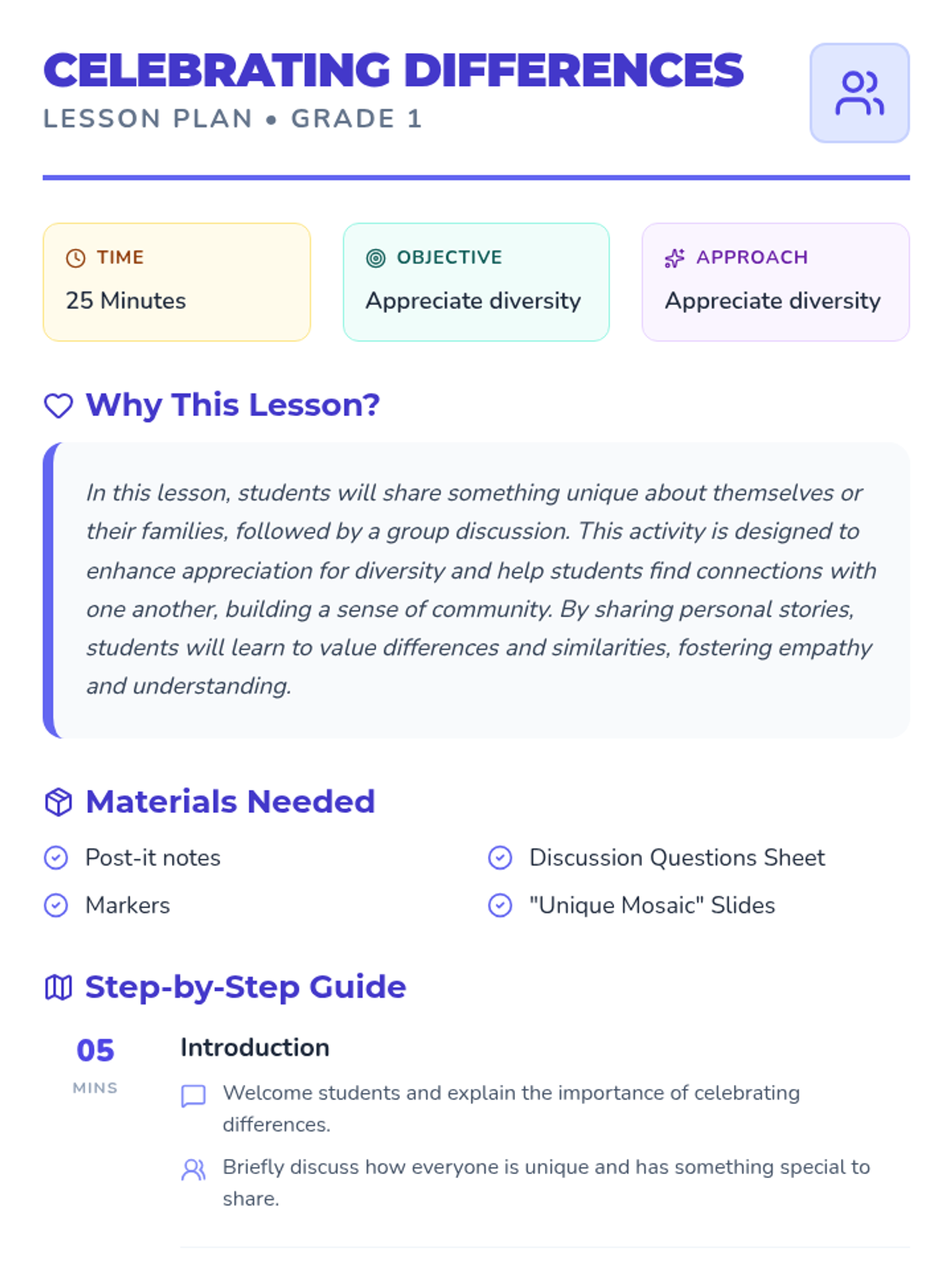 A Grade 1 lesson focused on appreciating diversity through personal storytelling and group discussion. Students share unique aspects of their lives and find common ground, fostering empathy and community.
