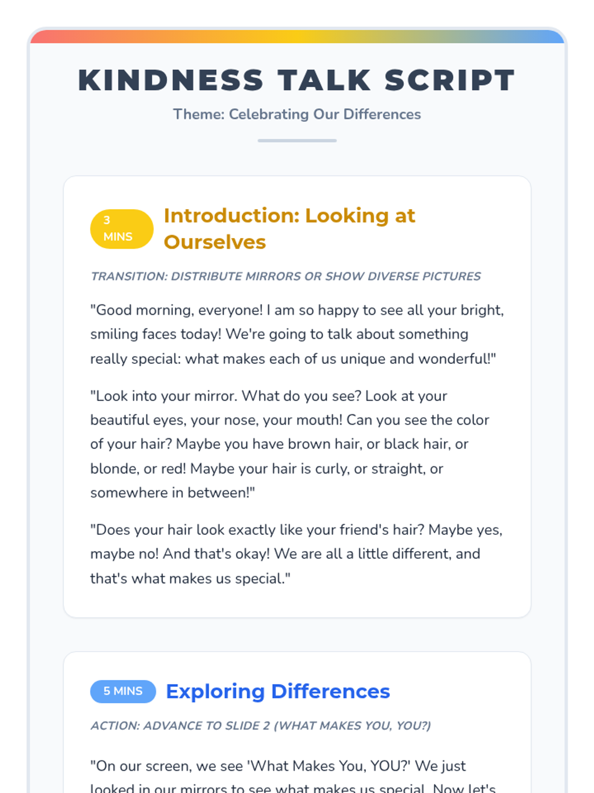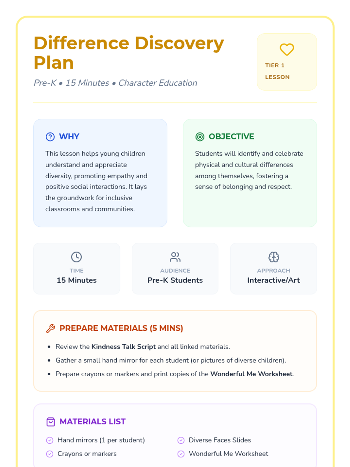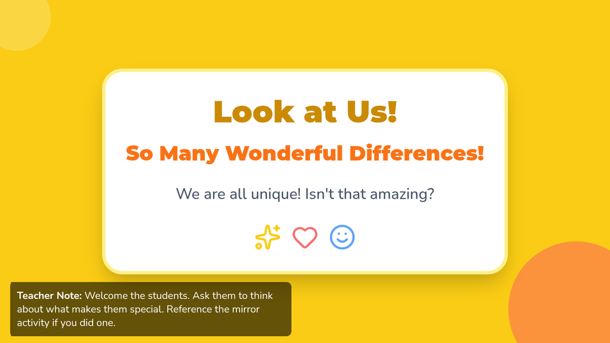 A heartwarming 15-minute lesson for Pre-K students to explore and appreciate the unique qualities that make each person special. This lesson fosters empathy and understanding from a young age through interactive discussion and art.