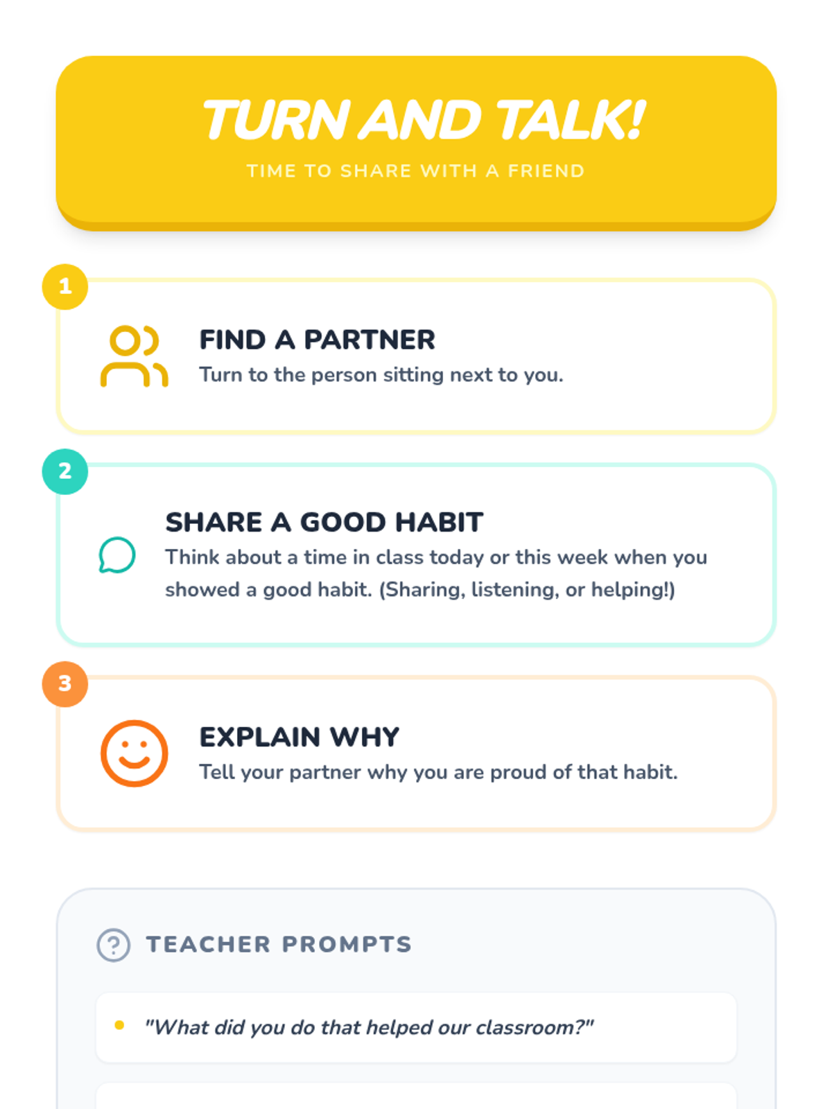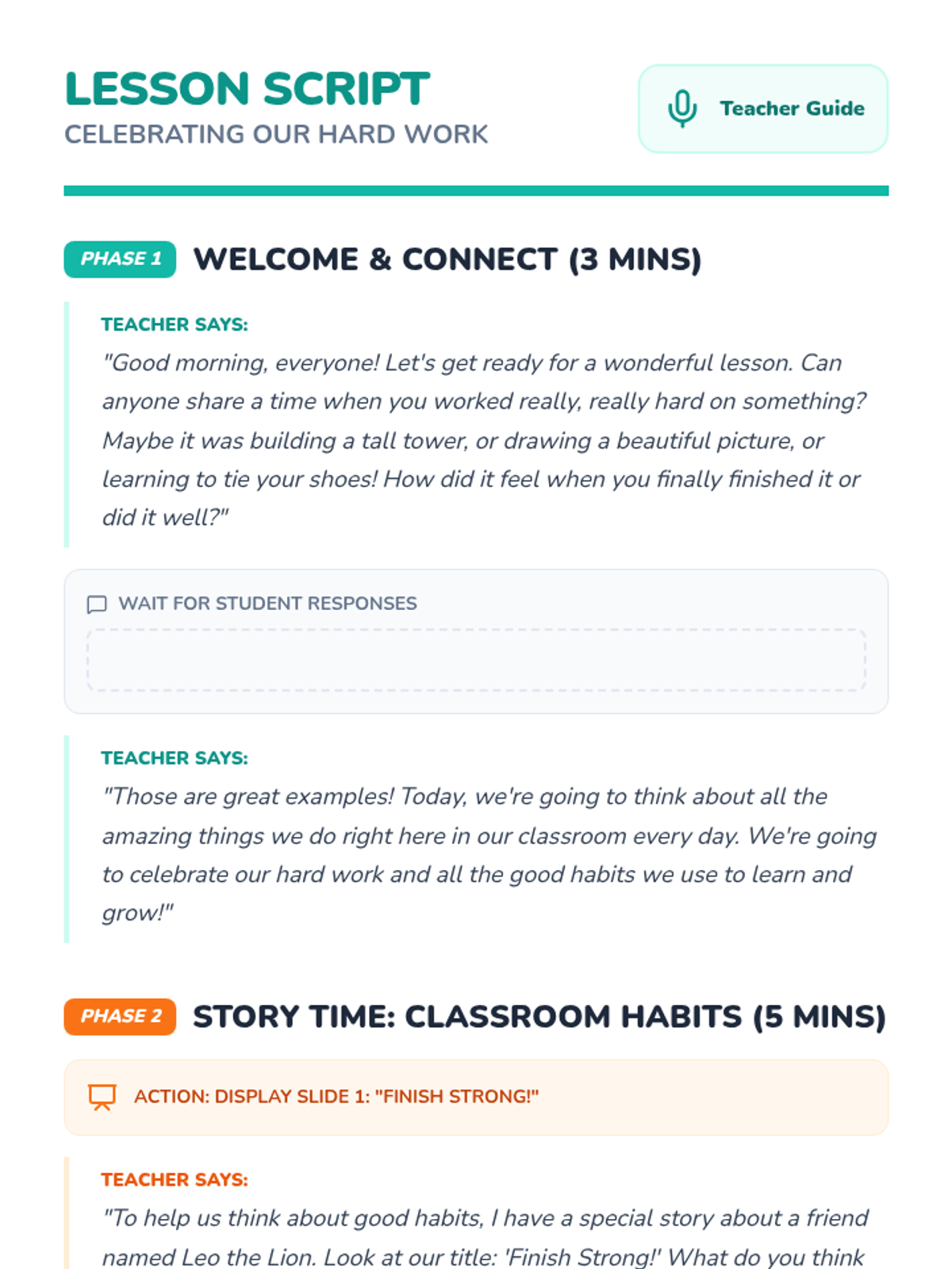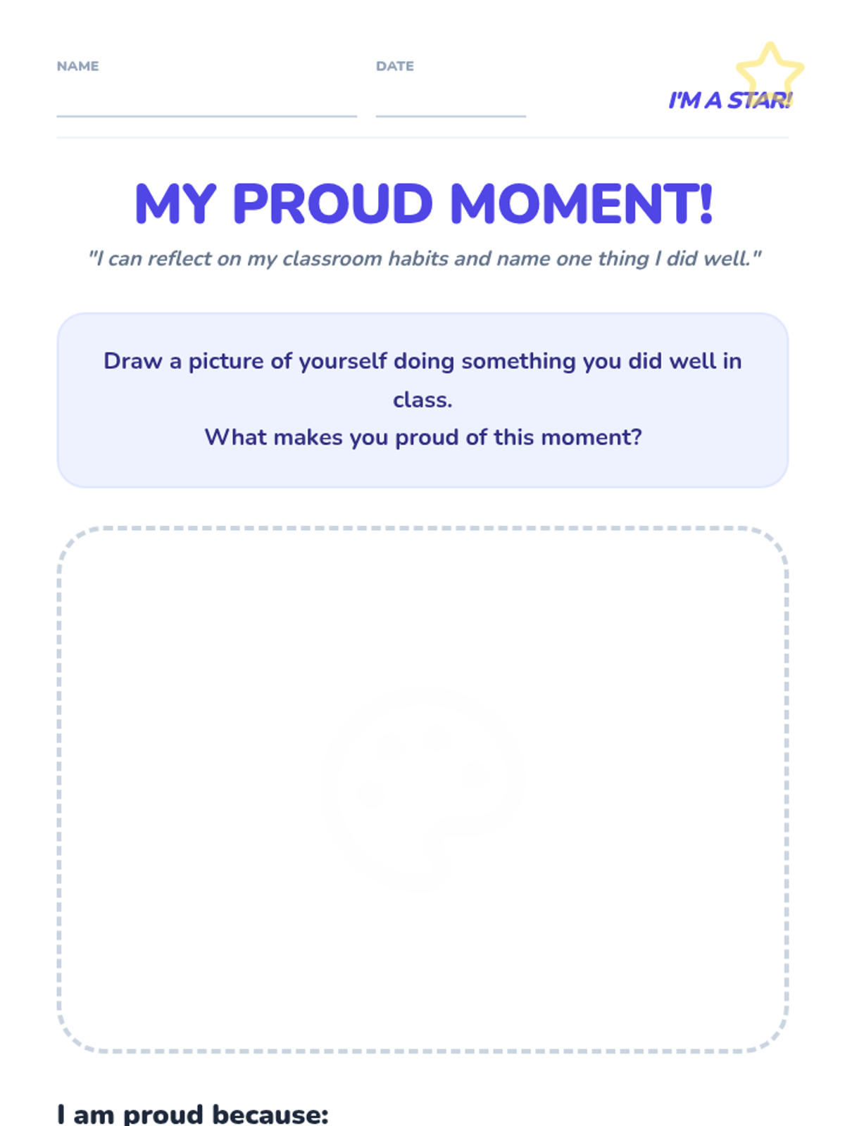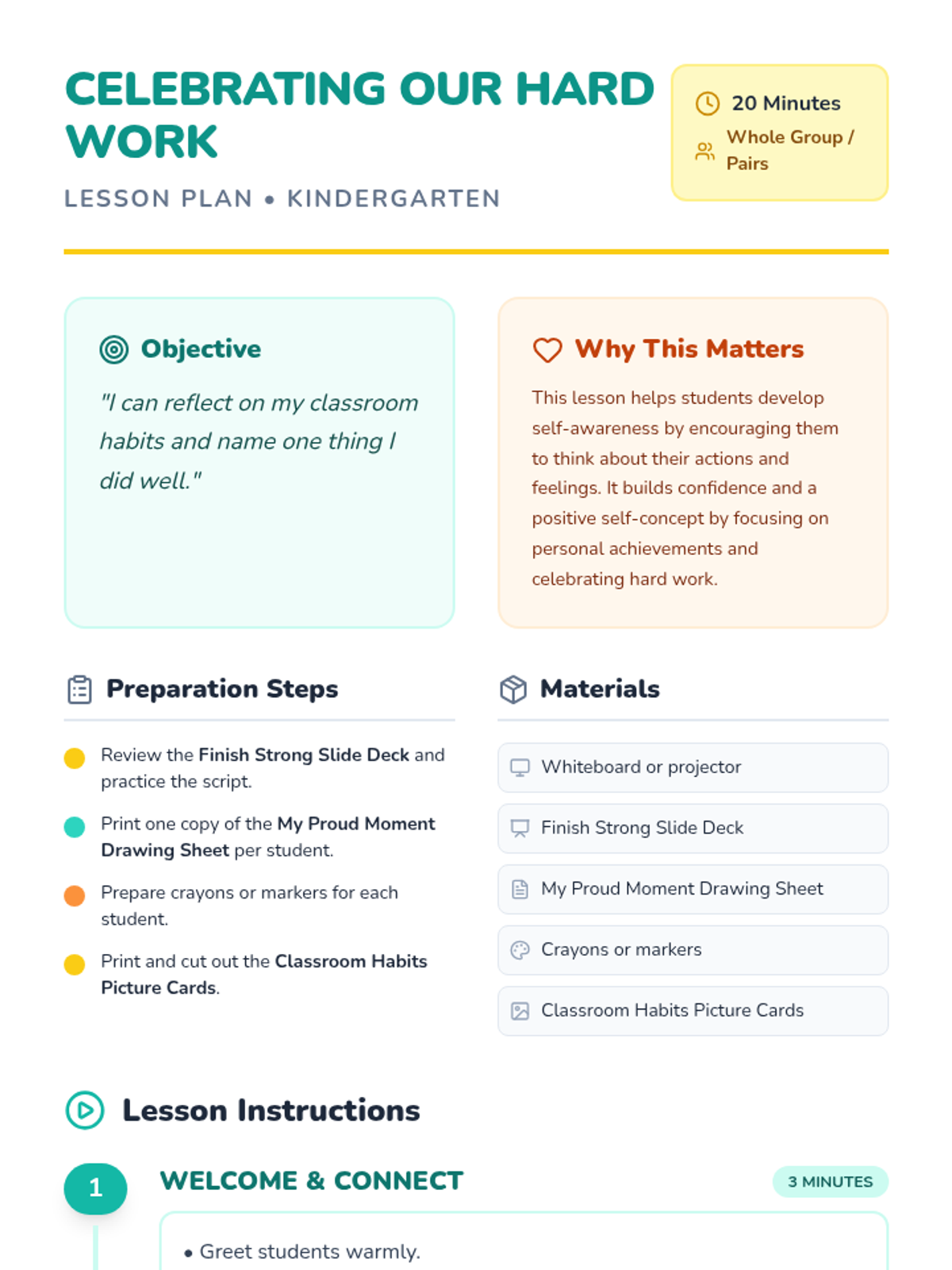 A 20-minute lesson for Kindergarten students focused on self-reflection and celebrating personal achievements through classroom habits. Students will listen to a story about Leo the Lion, discuss their own good habits, and create a drawing of a proud moment.