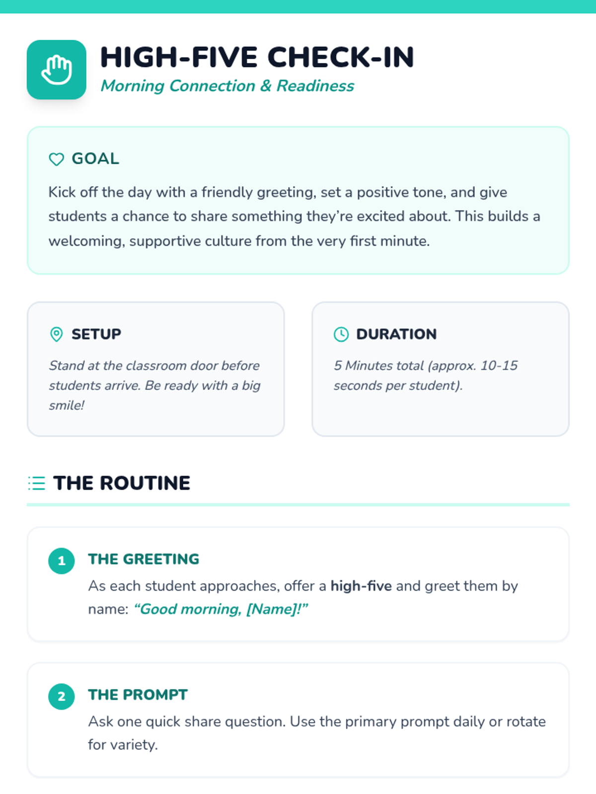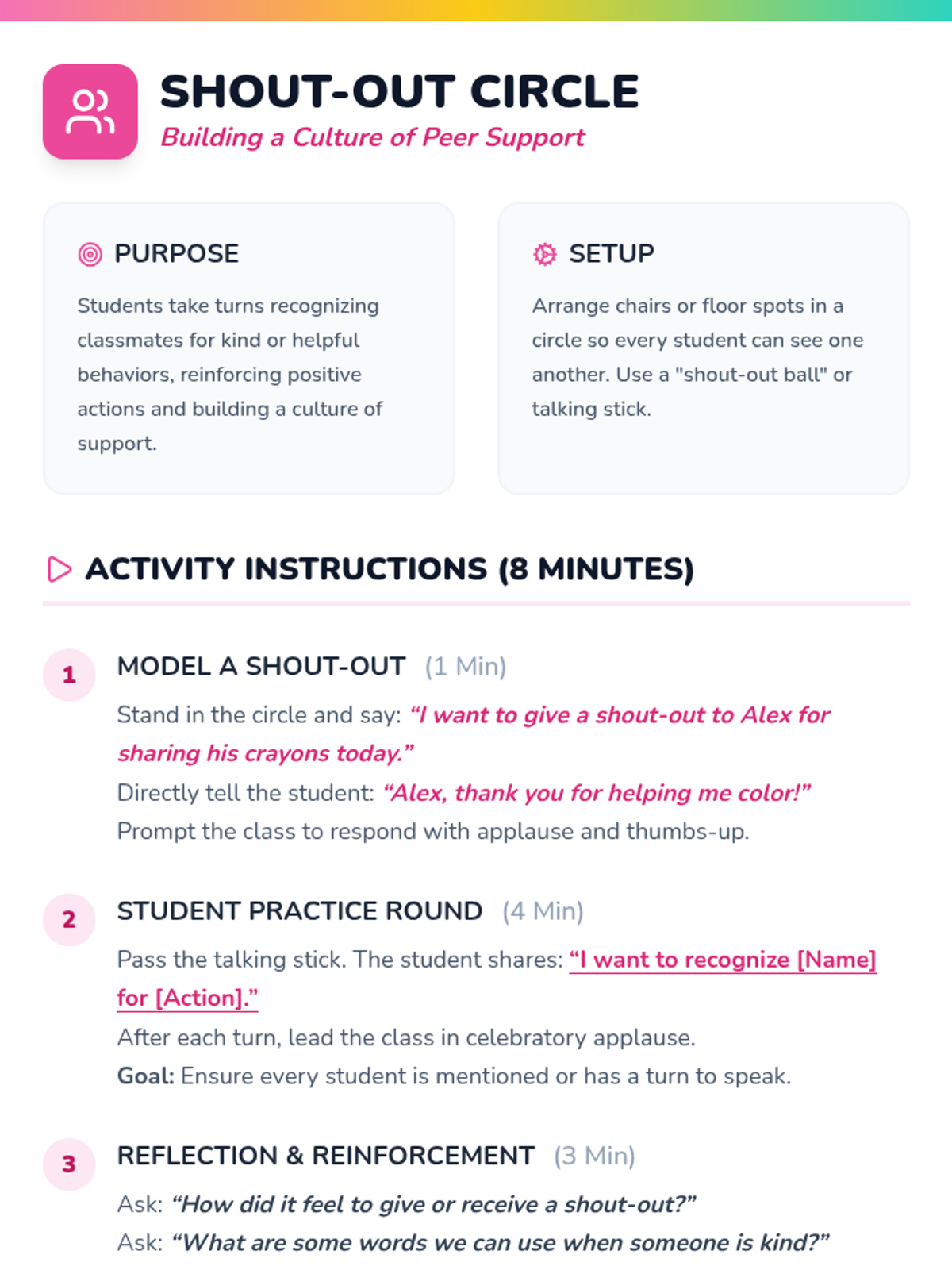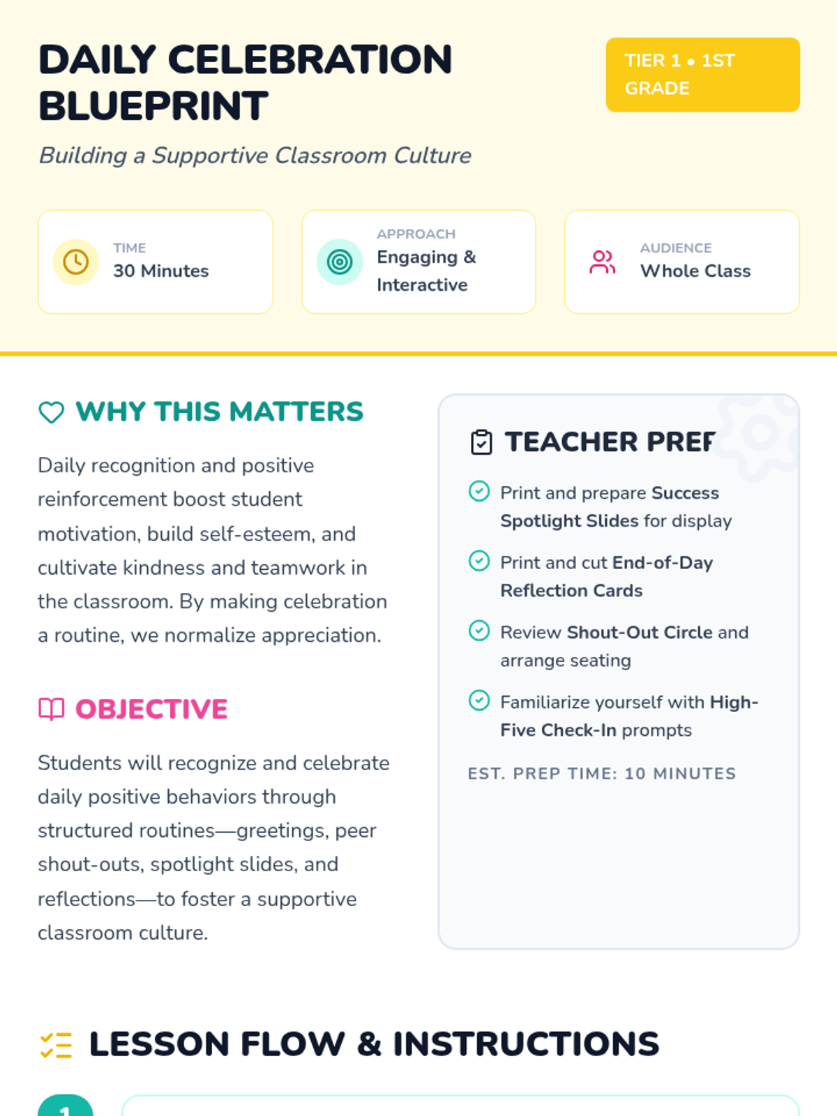 A 30-minute Tier 1 lesson for 1st graders focused on building a supportive classroom culture through daily celebration routines, including greetings, peer shout-outs, and reflections.