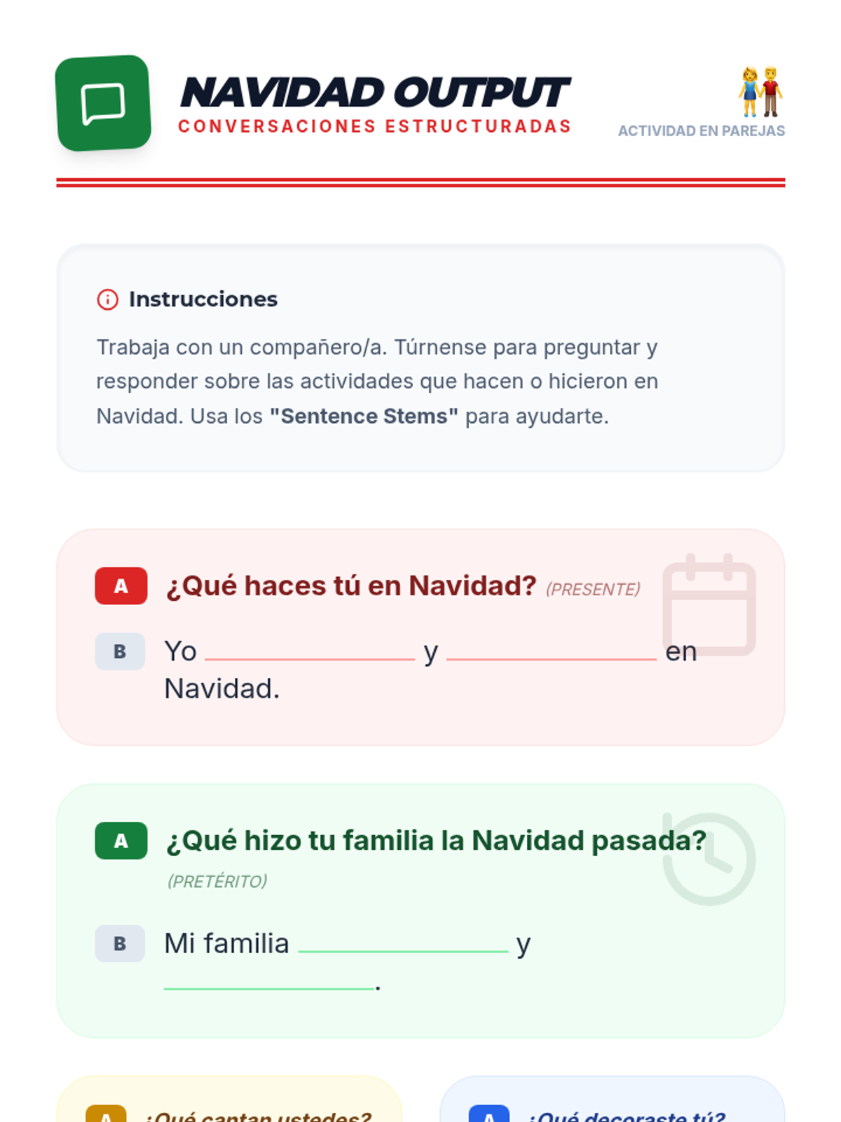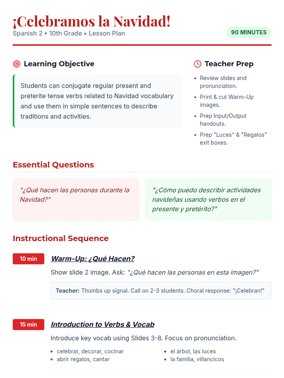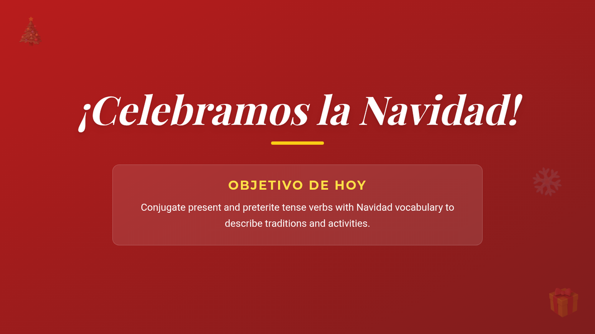 A festive 90-minute Spanish 2 lesson focused on conjugating regular present and preterite tense verbs within the context of Christmas traditions and activities. Students will engage in visual analysis, structured input/output activities, and a communicative wrap-up.