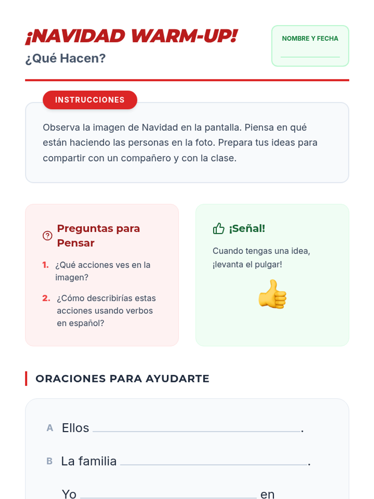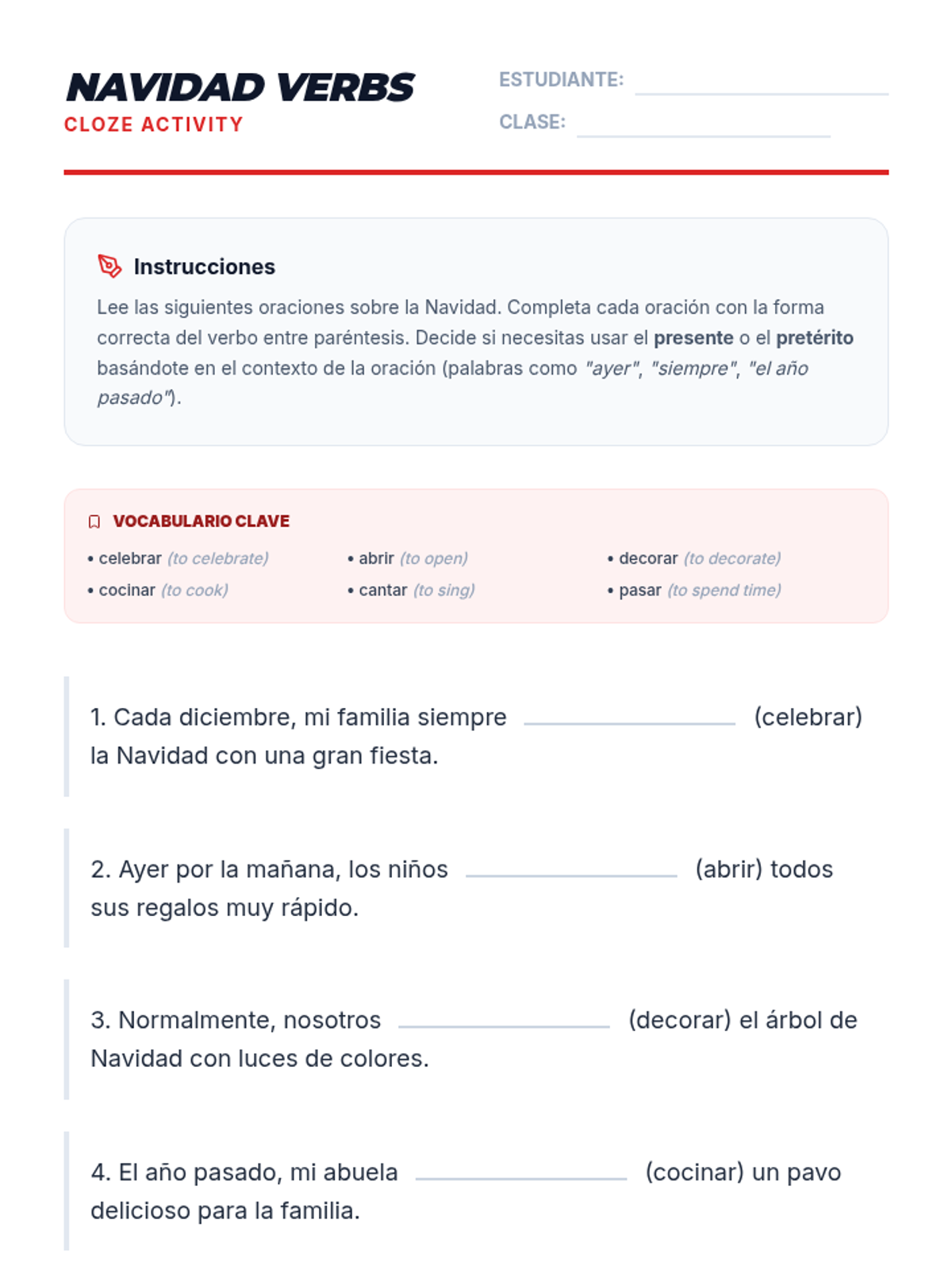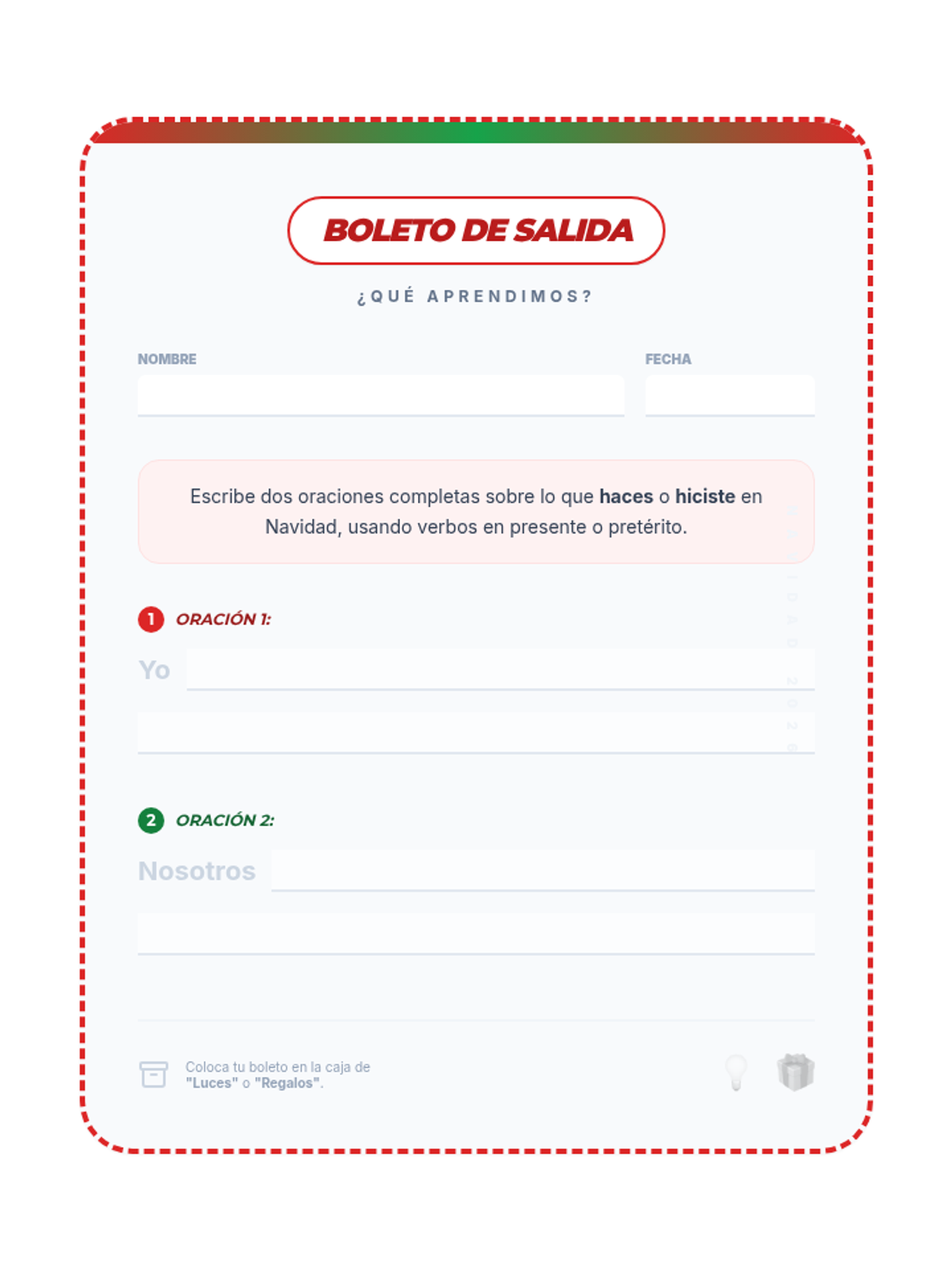 A festive 90-minute Spanish 2 lesson focused on conjugating regular present and preterite tense verbs within the context of Christmas traditions and activities. Students will engage in visual analysis, structured input/output activities, and a communicative wrap-up.