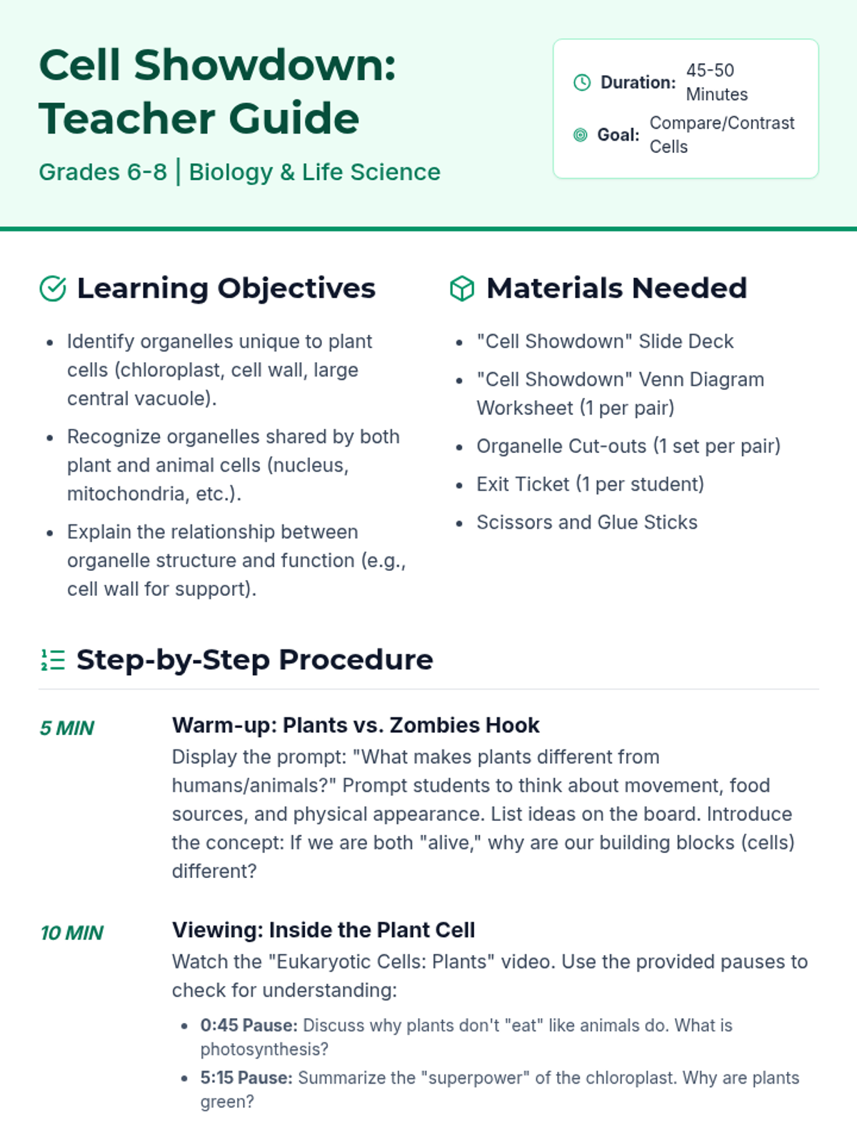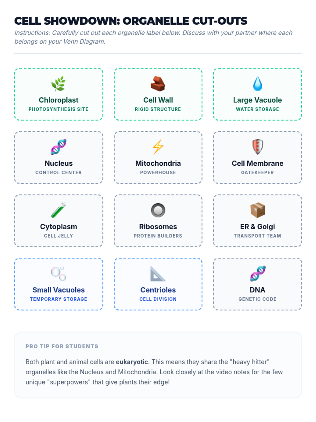 A middle school biology lesson comparing plant and animal cells through a video-based investigation and a collaborative Venn diagram activity. Students identify unique plant organelles like the chloroplast and cell wall while recognizing shared eukaryotic features.
