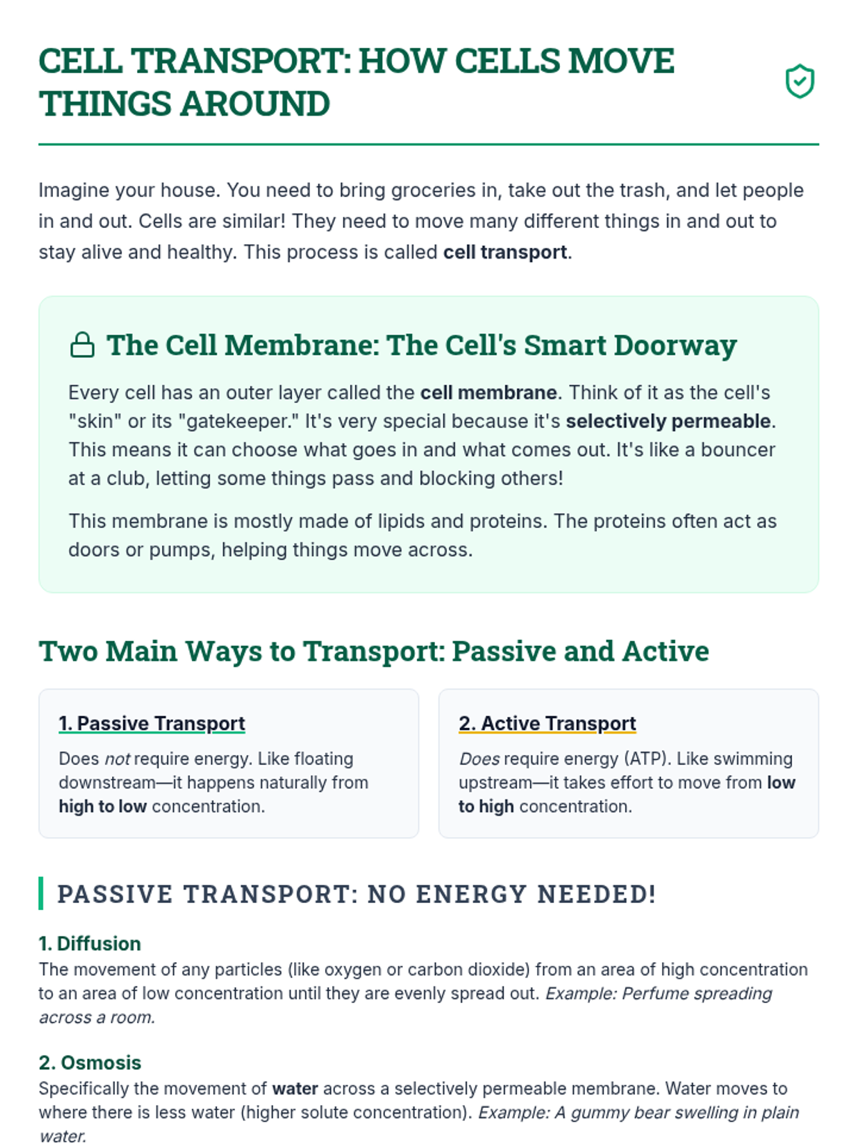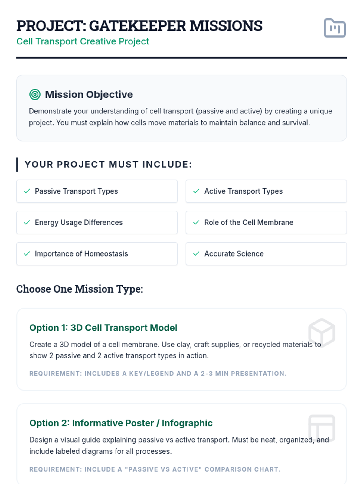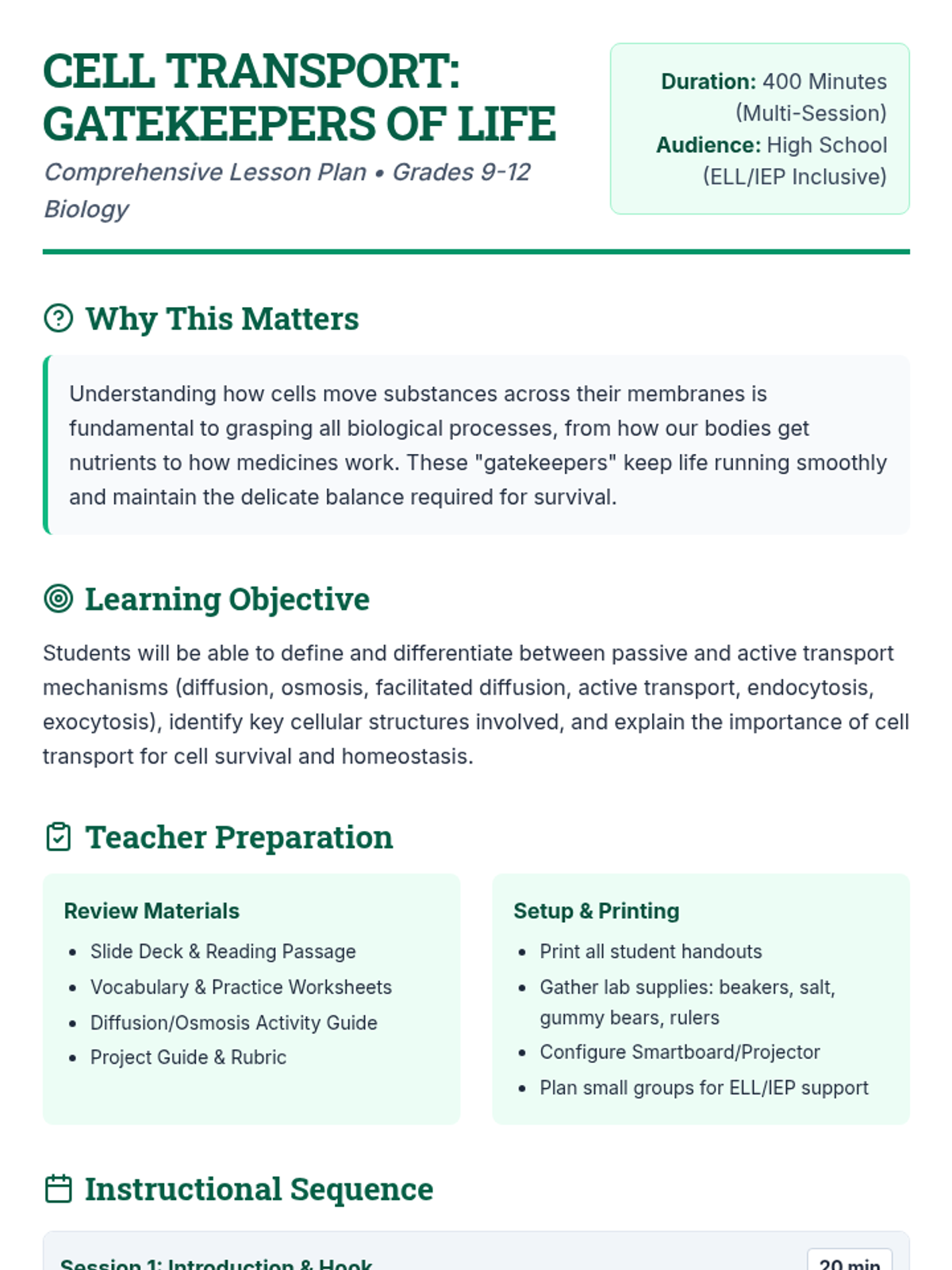 A comprehensive multi-session unit for high school biology students exploring passive and active transport mechanisms. Through interactive slides, hands-on lab activities, and creative projects, students master the concepts of diffusion, osmosis, and bulk transport to understand how cells maintain homeostasis.