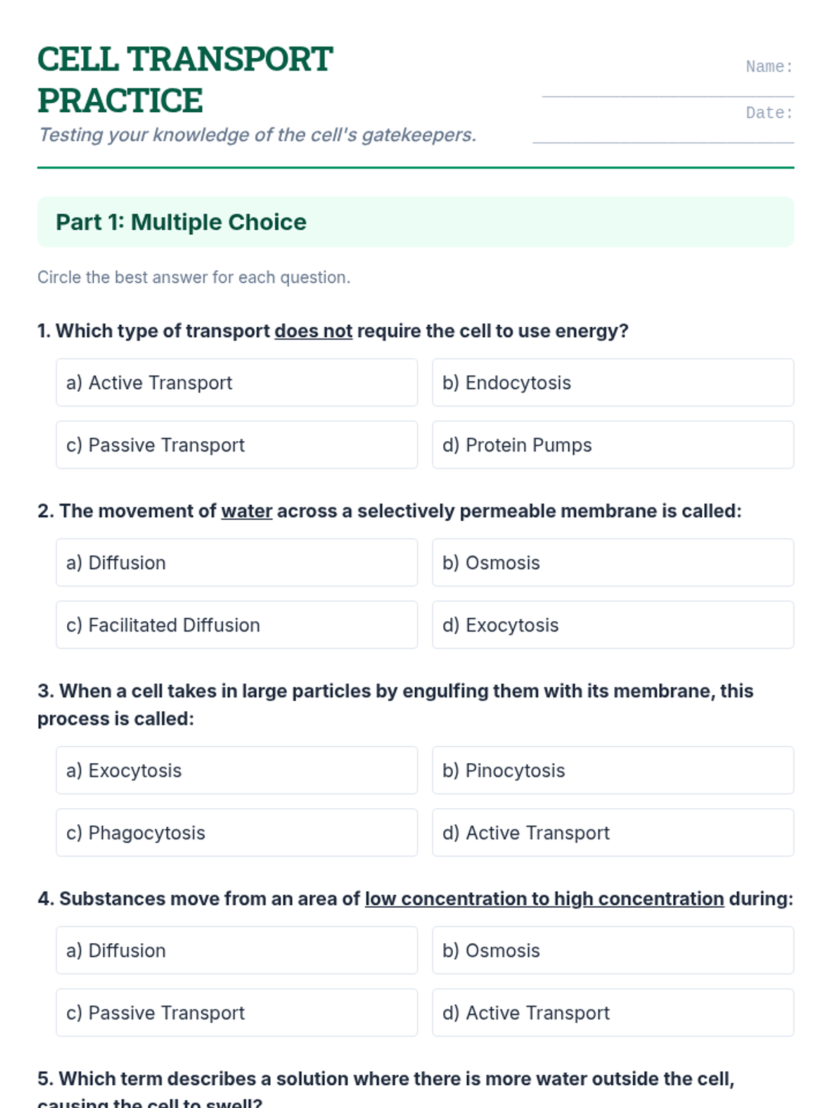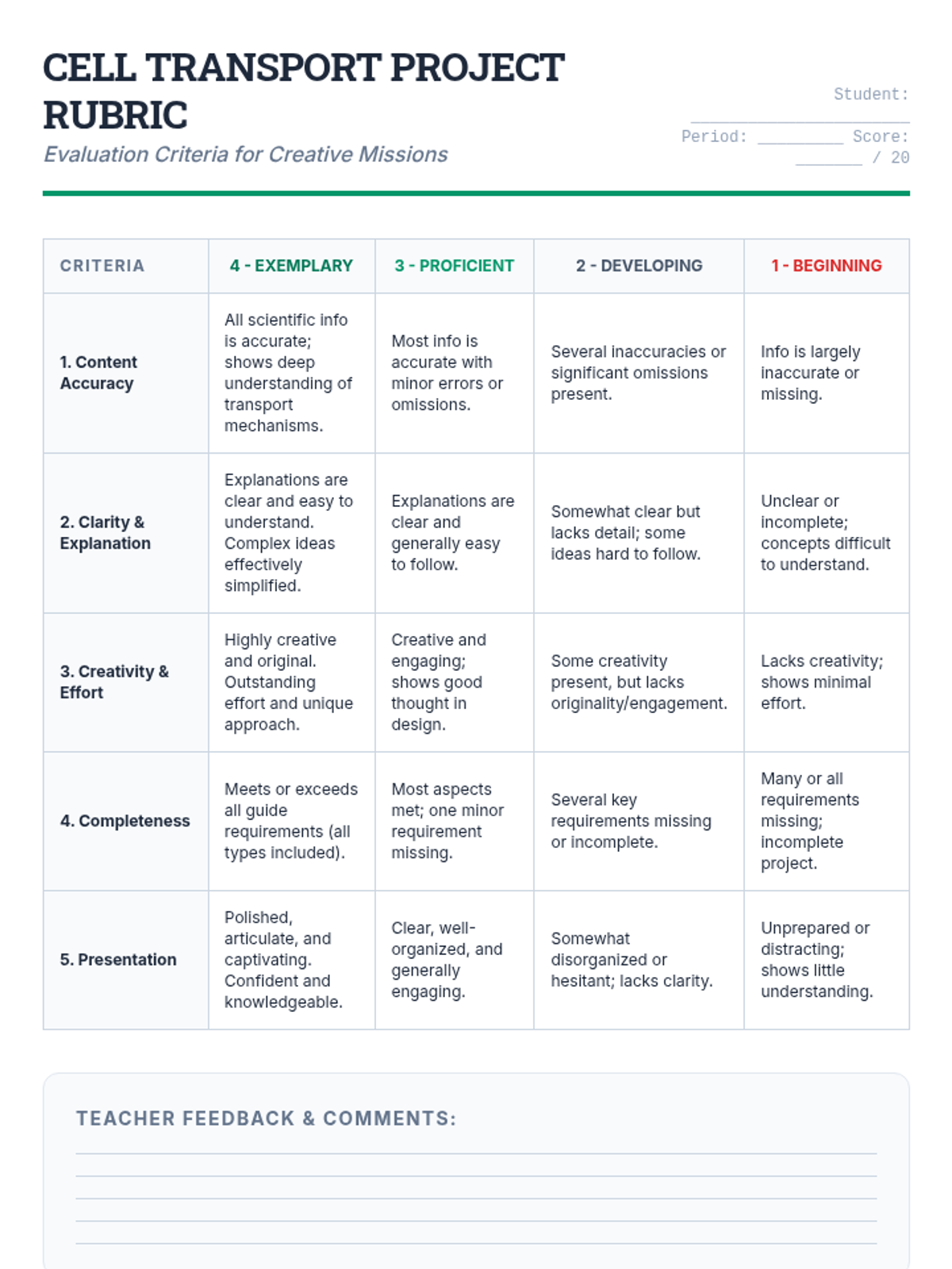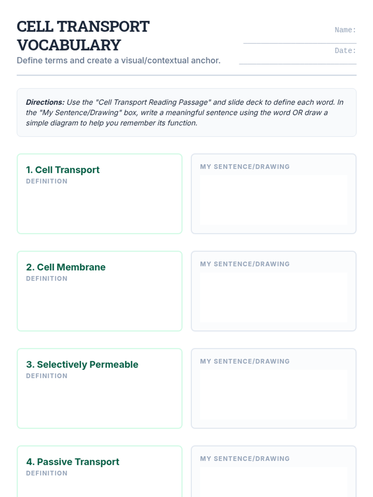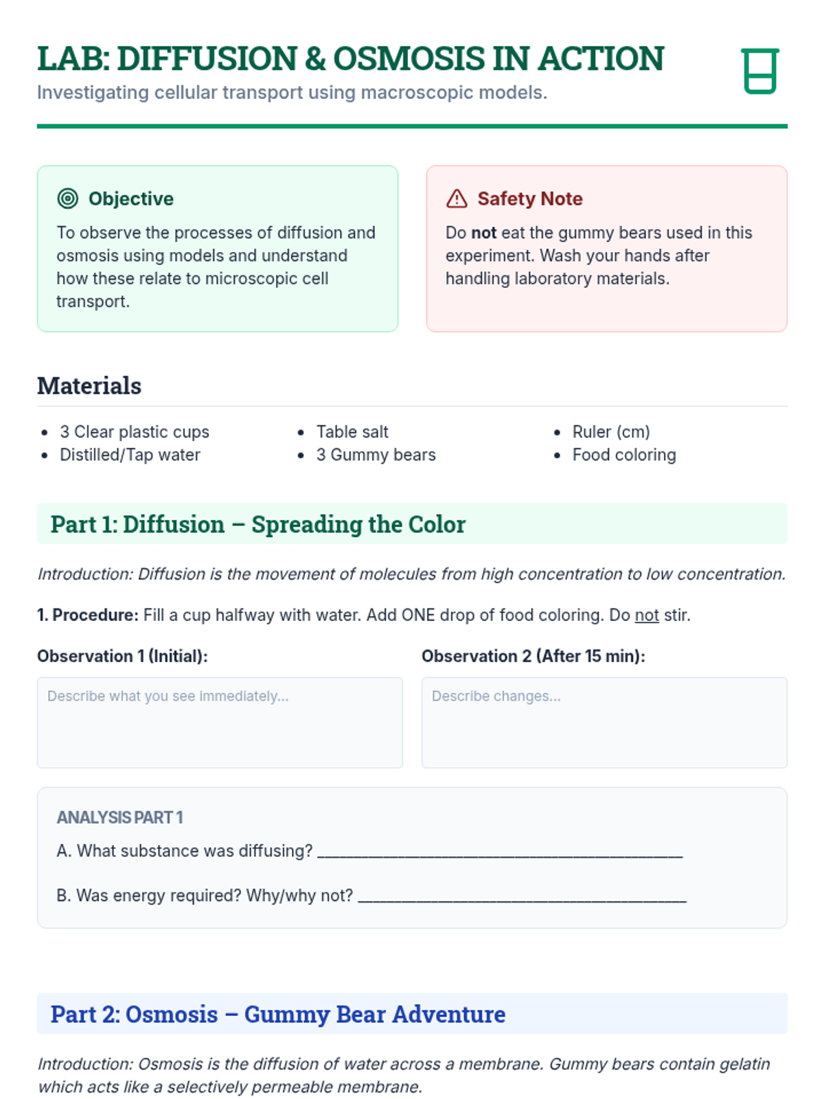 A comprehensive multi-session unit for high school biology students exploring passive and active transport mechanisms. Through interactive slides, hands-on lab activities, and creative projects, students master the concepts of diffusion, osmosis, and bulk transport to understand how cells maintain homeostasis.