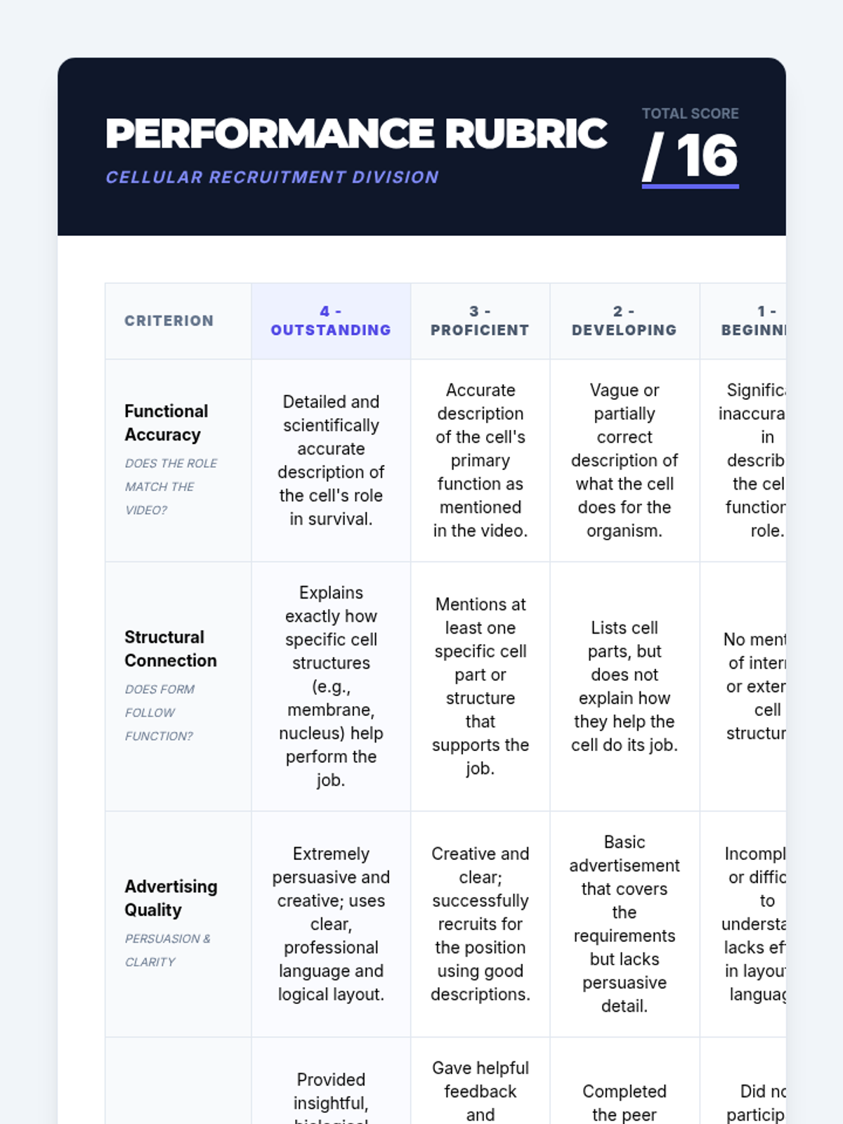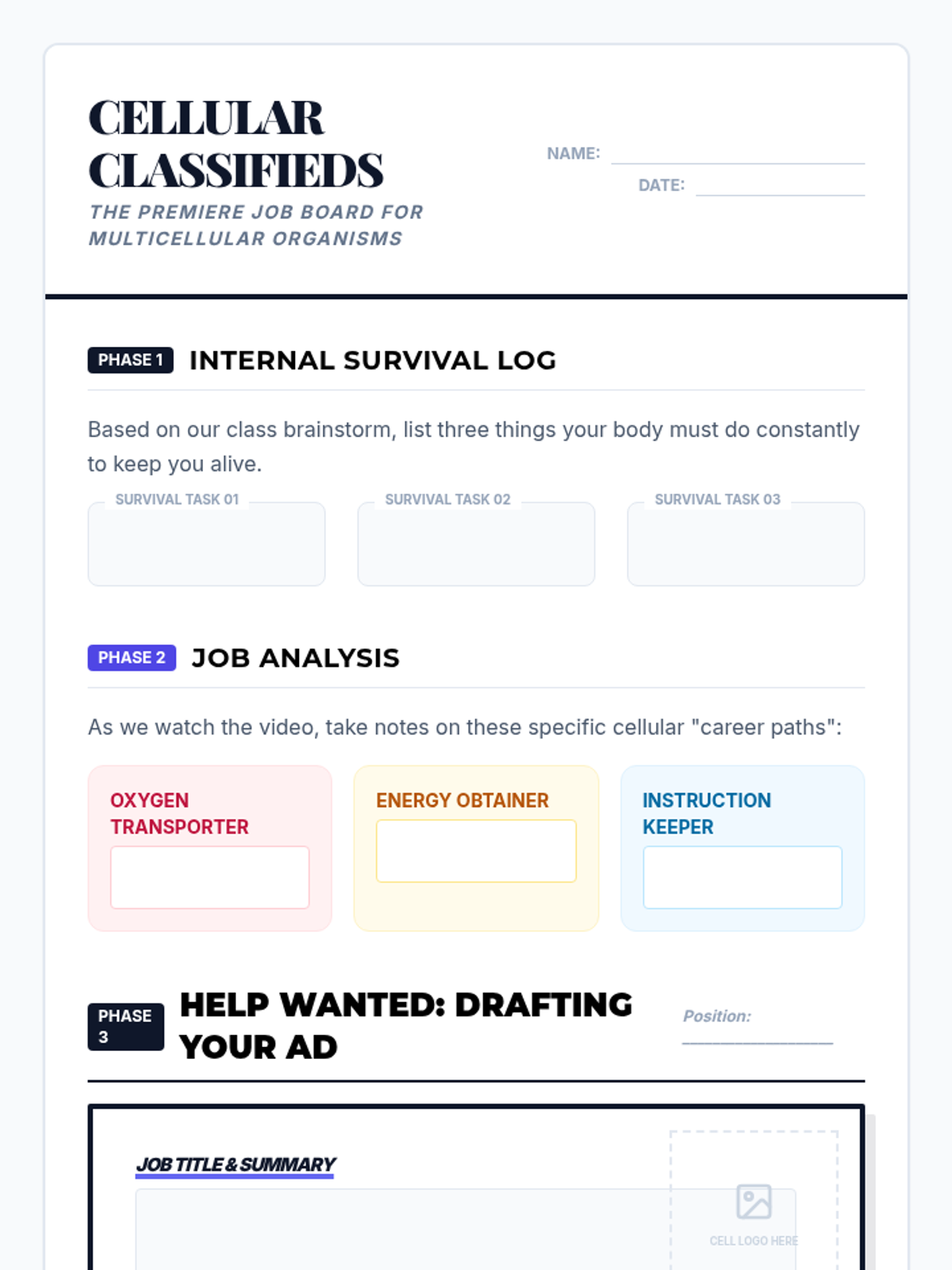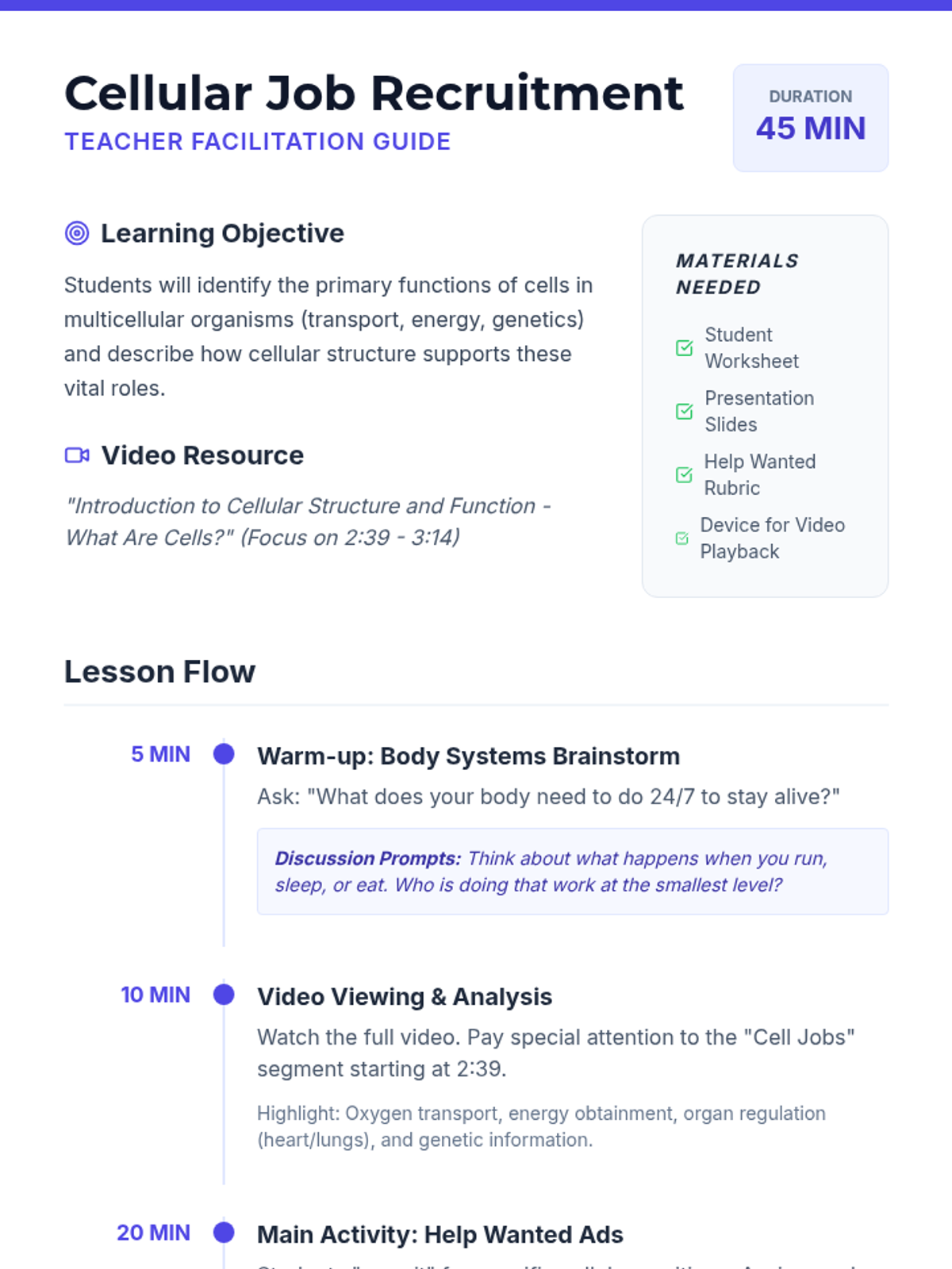 Students explore the vital roles cells play in multicellular organisms by creating 'Help Wanted' advertisements for specific cellular jobs mentioned in the introductory video. They identify functions like oxygen transport, energy production, and genetic storage while connecting these microscopic tasks to whole-body survival.