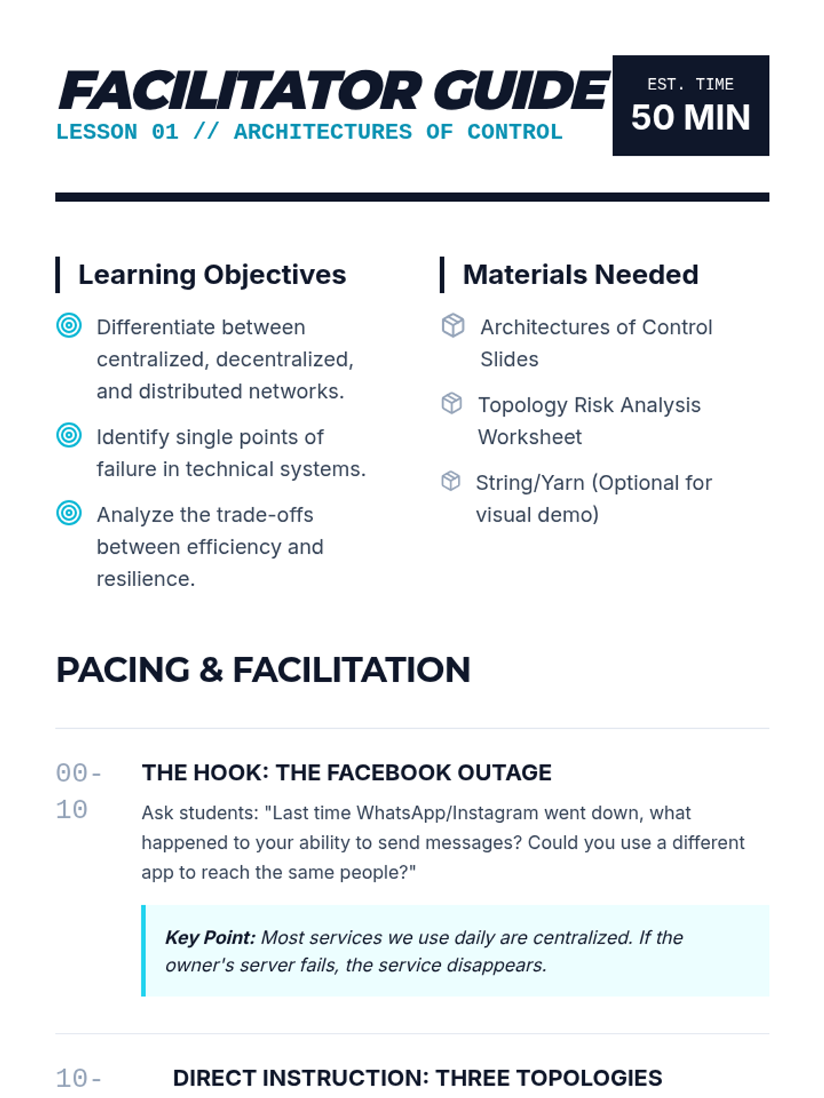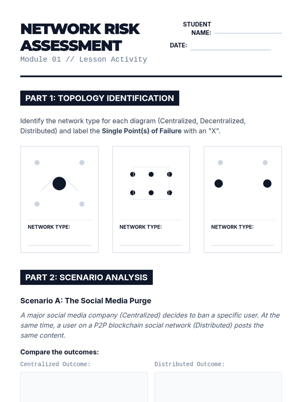 Students analyze the structural differences between centralized, decentralized, and distributed networks. They evaluate resilience and single points of failure through case studies of network outages.