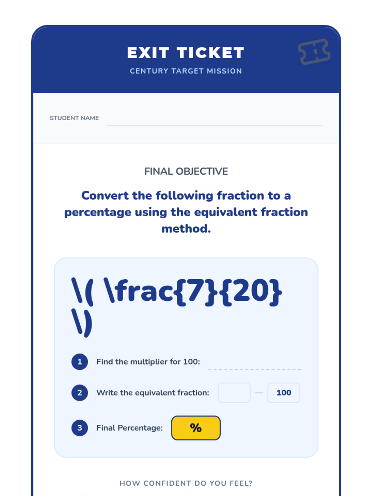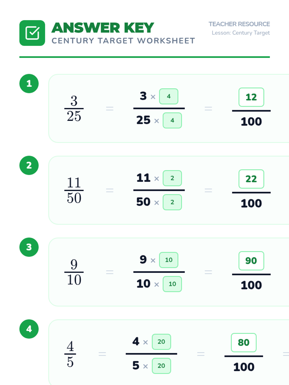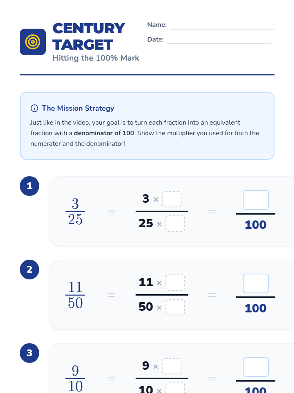 A 6th-grade math lesson focused on converting fractions to percentages by finding equivalent fractions with a denominator of 100, featuring video-based modeling and guided practice.