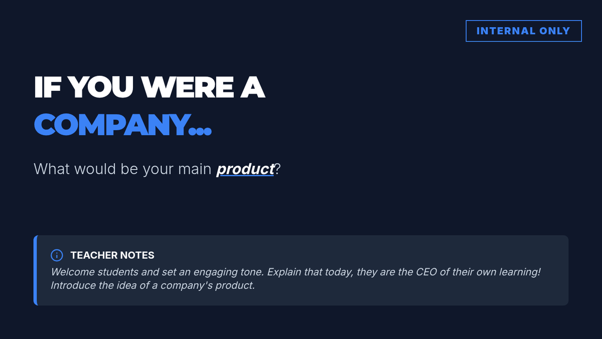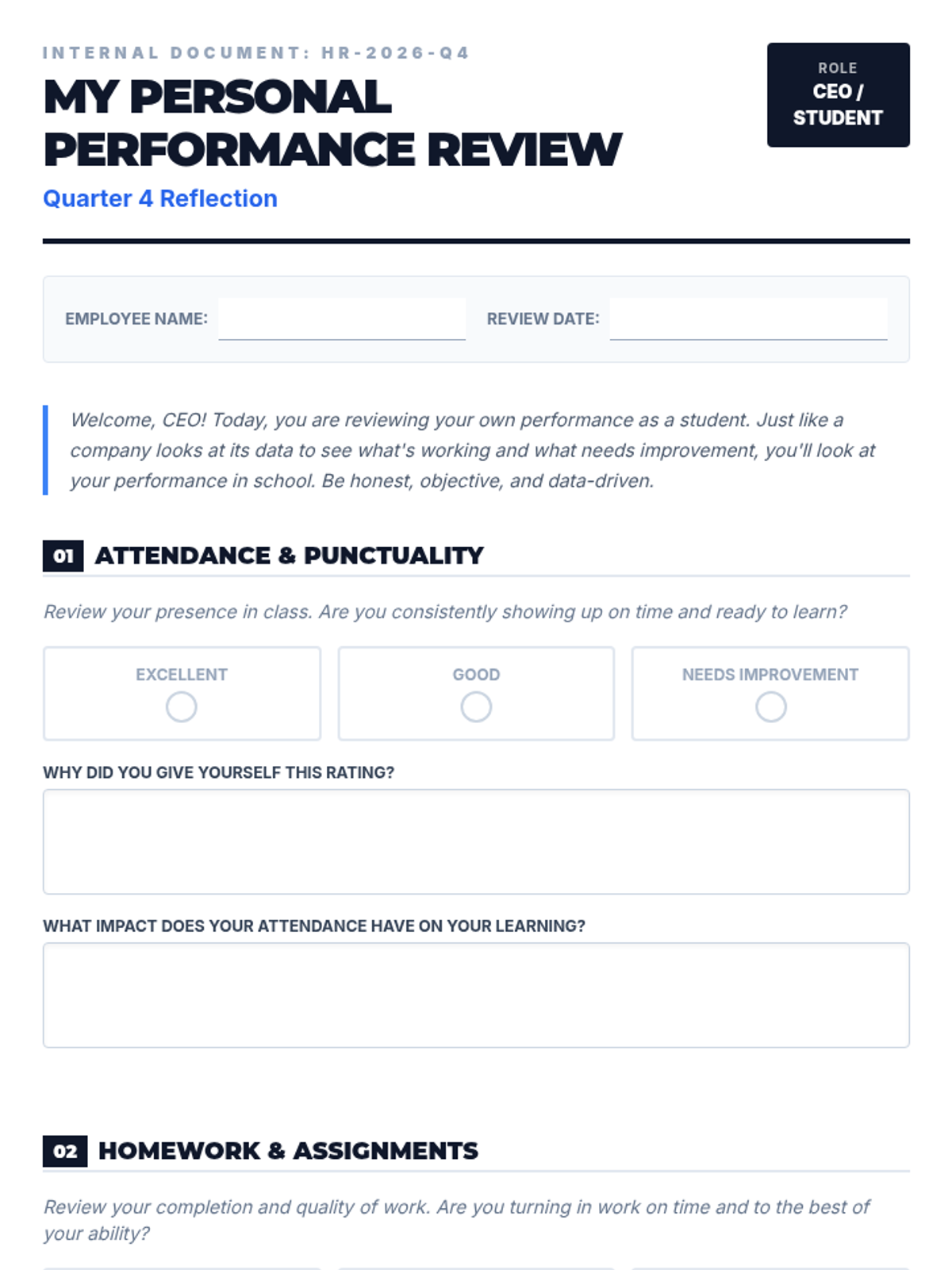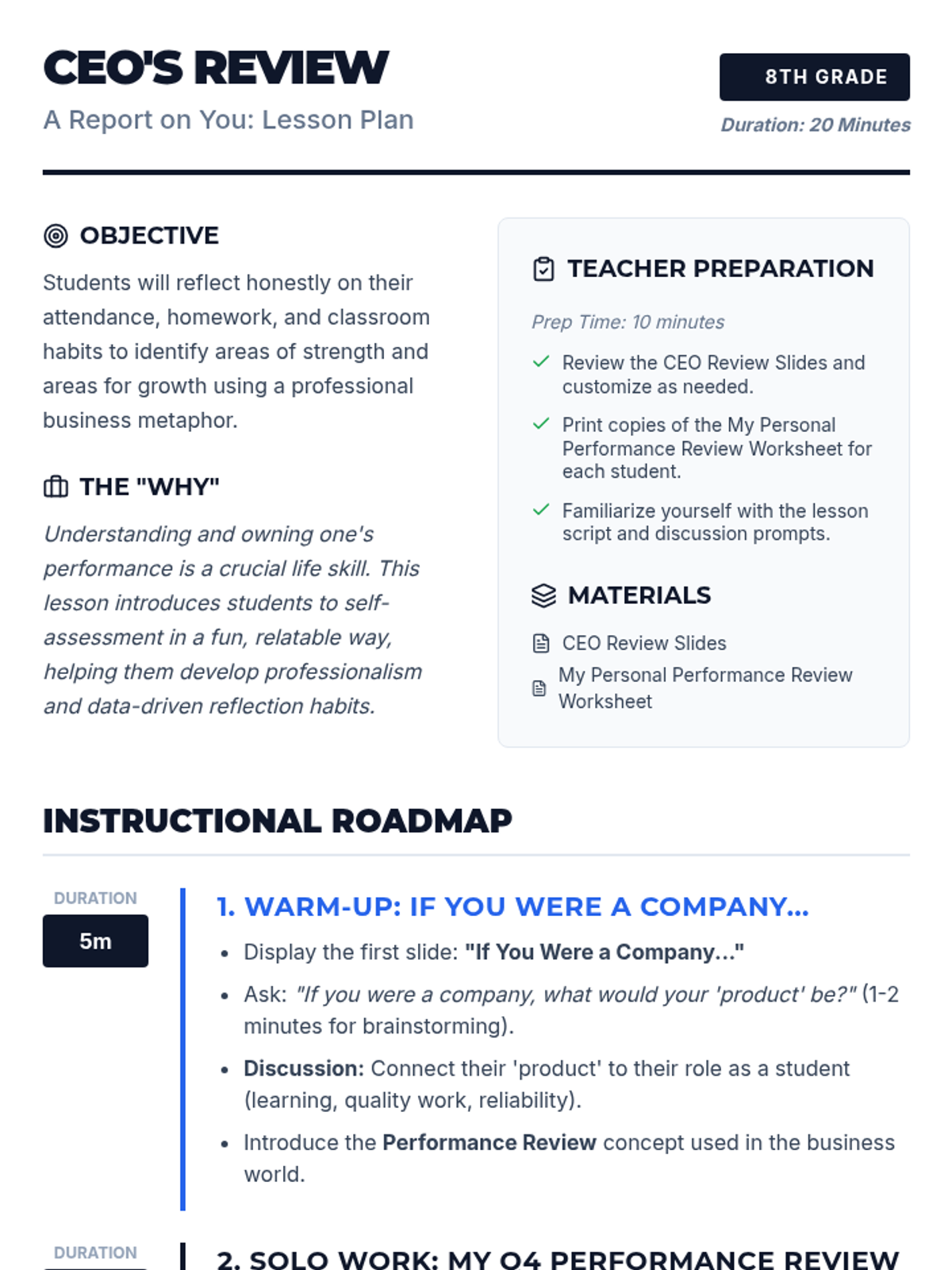 An 8th-grade self-reflection lesson using a business 'performance review' metaphor to help students analyze their attendance, homework, and classroom habits. Students act as 'CEOs' of their own learning to identify strengths and set actionable growth goals.