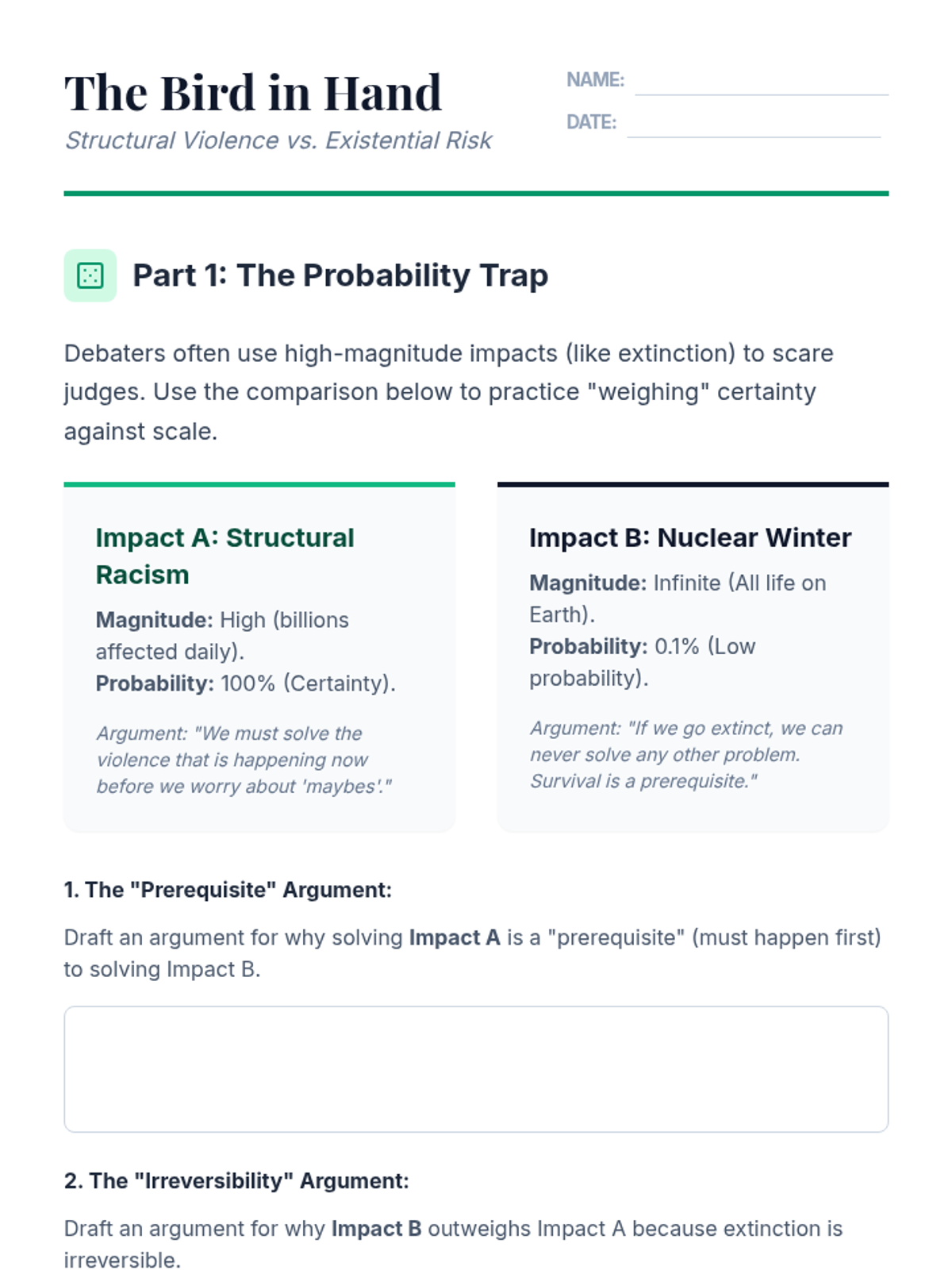 Students debate high-magnitude/low-probability extinction scenarios against 100% probability ongoing structural violence like poverty or racism.