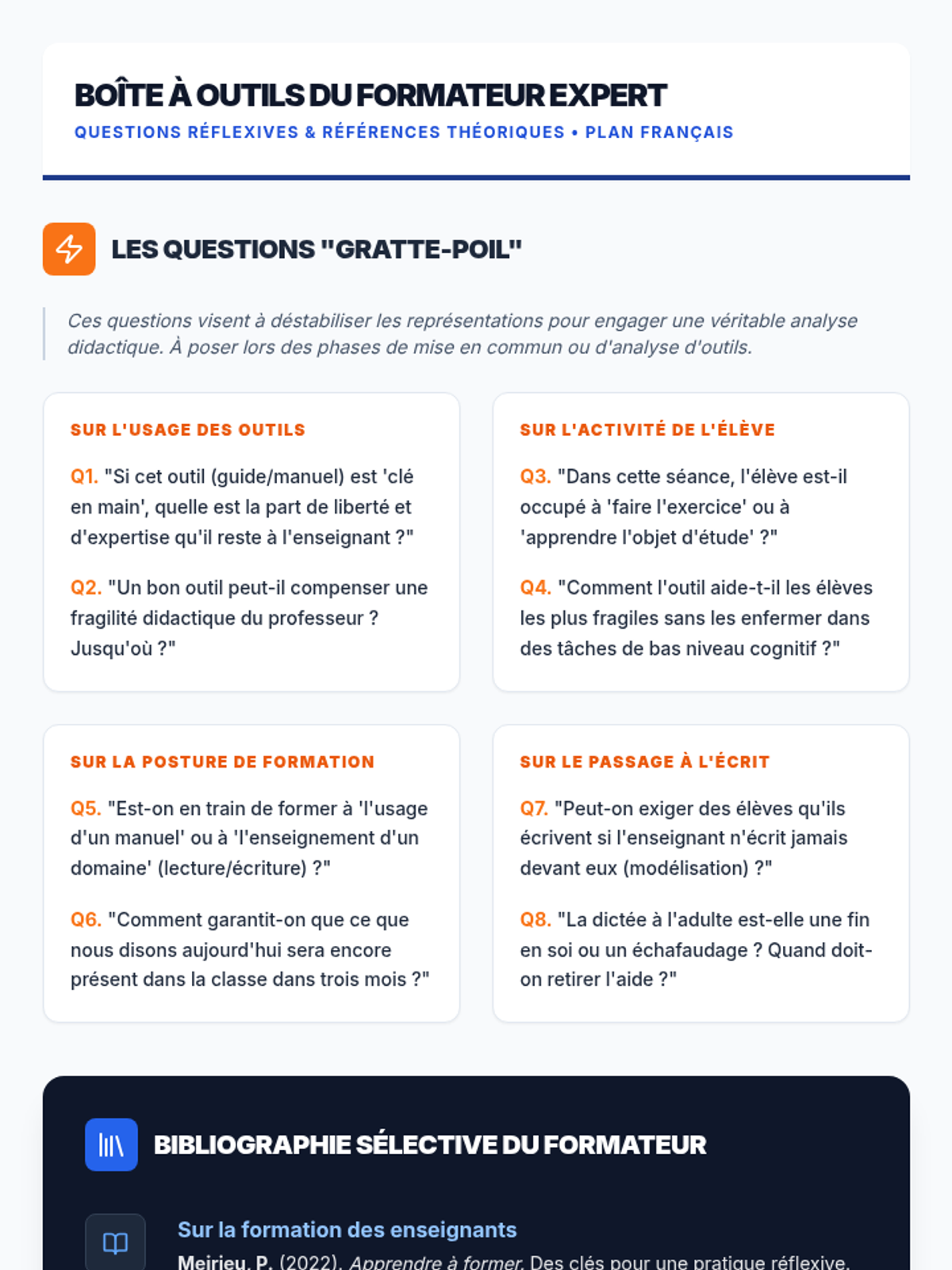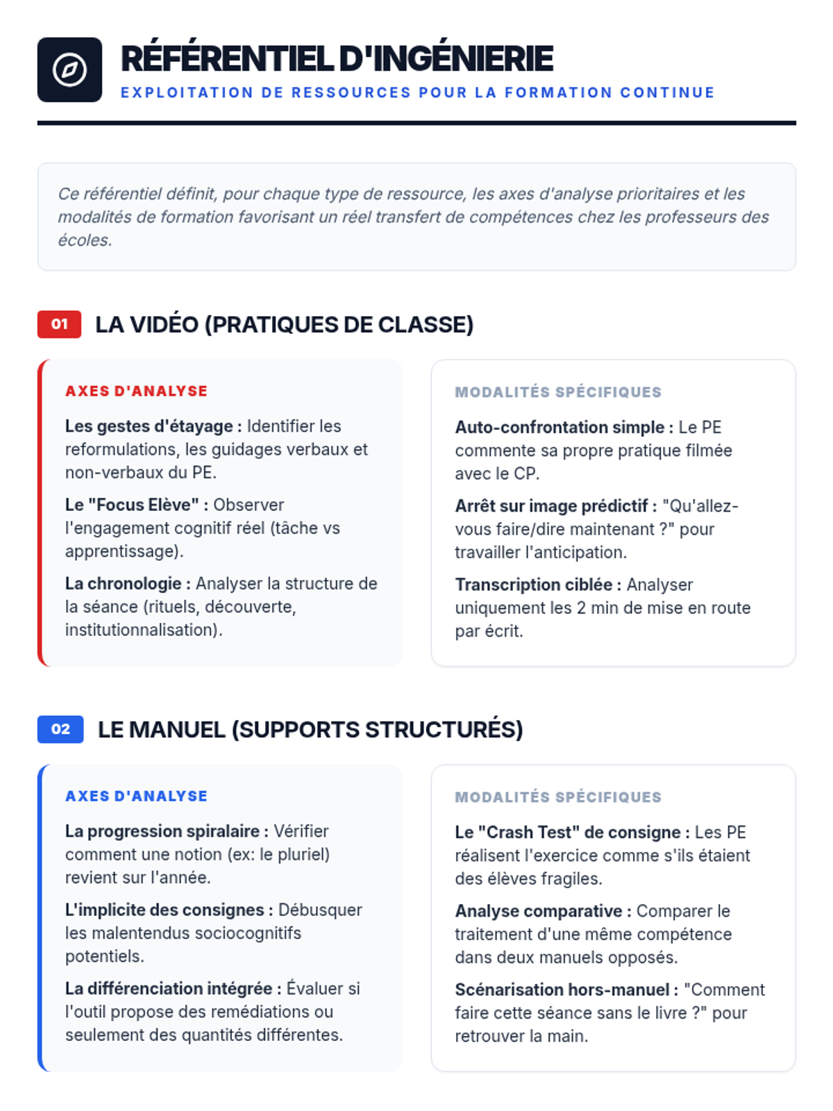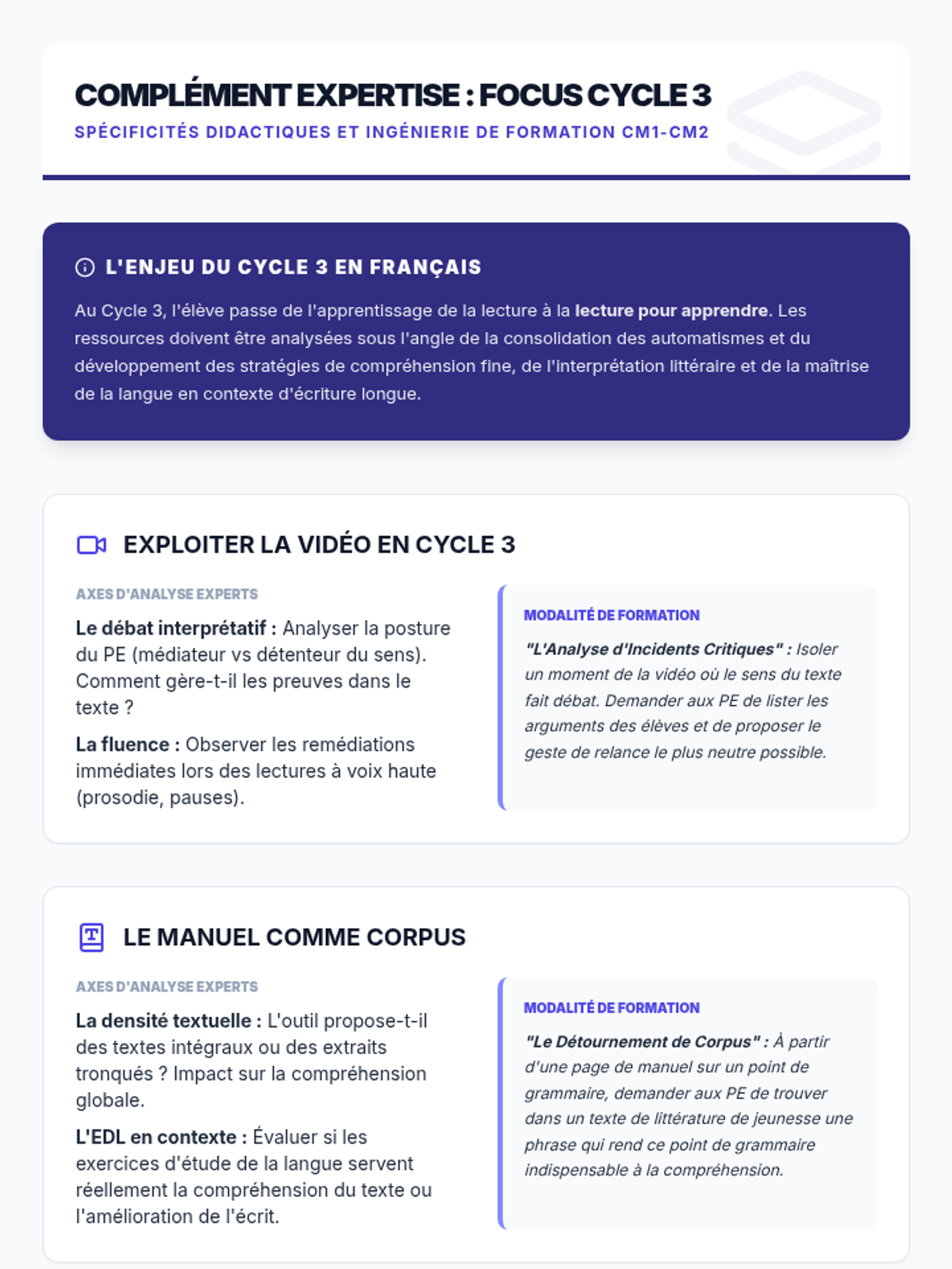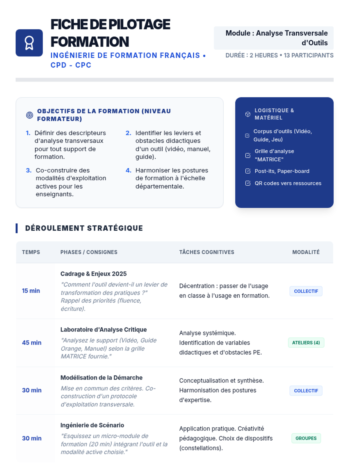 Cette formation vise à outiller les conseillers pédagogiques pour l'analyse et l'exploitation de ressources diverses (vidéos, manuels, guides) dans le cadre de la formation continue des professeurs des écoles en français, conformément aux orientations stratégiques nationales.