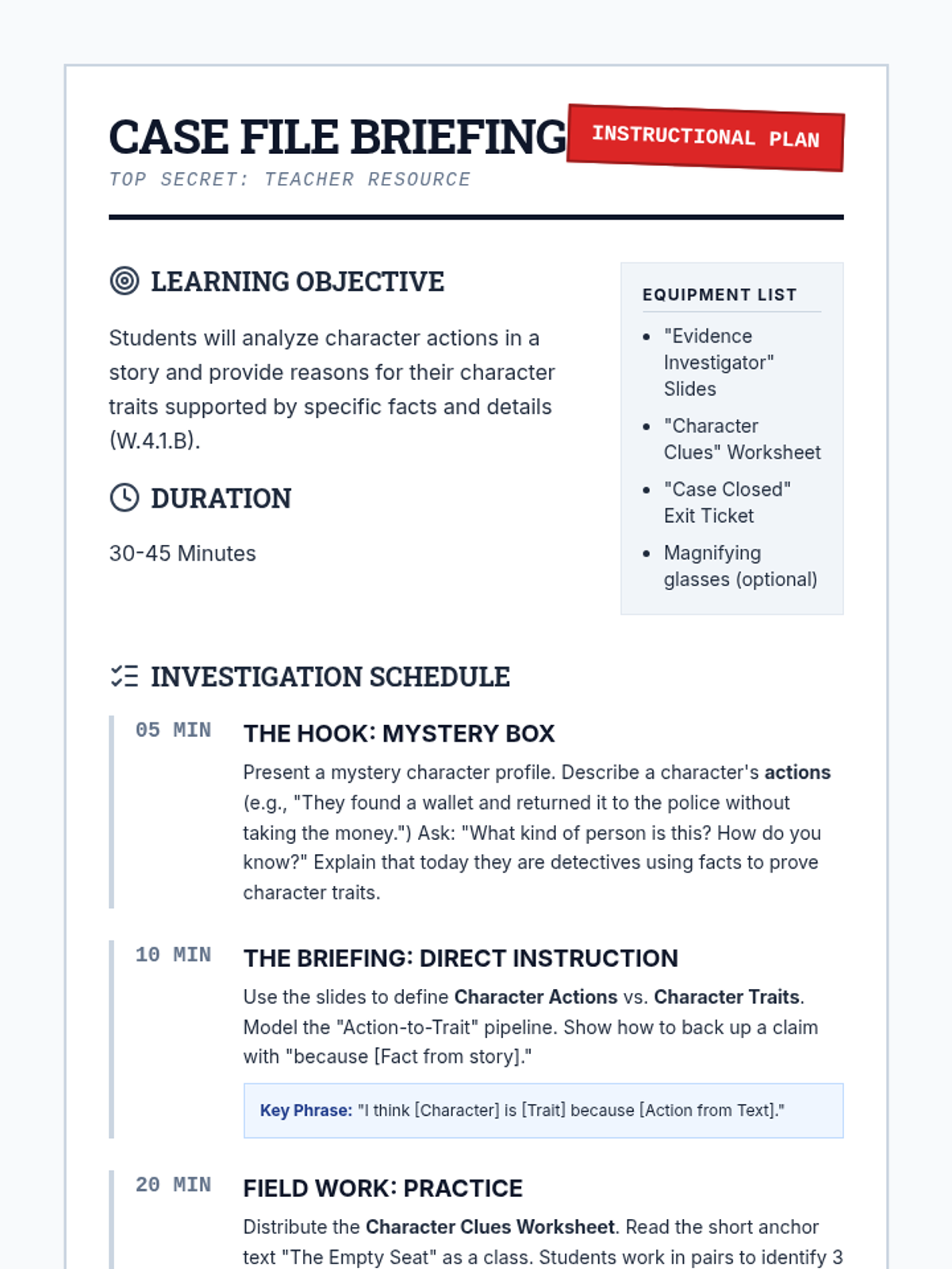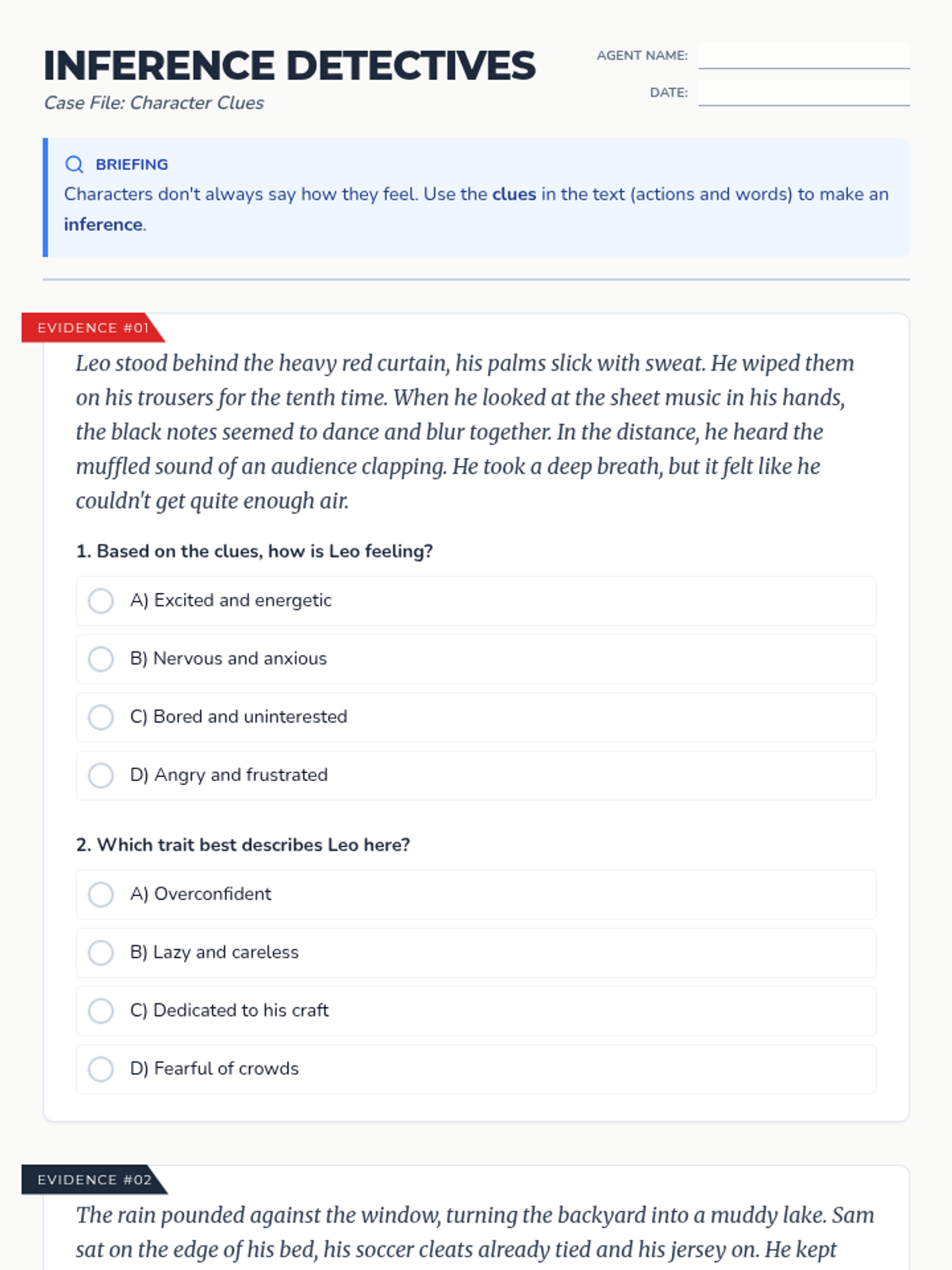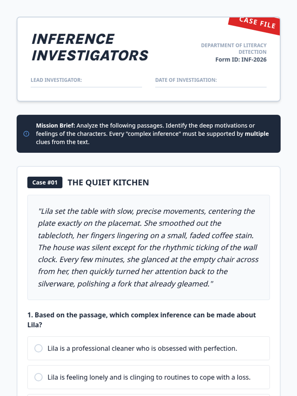 A lesson focused on making complex inferences supported by multiple pieces of textual evidence. Students act as 'Inference Investigators' to decode short fictional passages and build strong, evidence-backed conclusions.