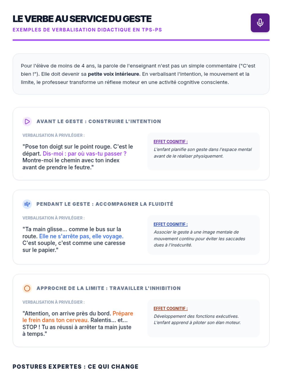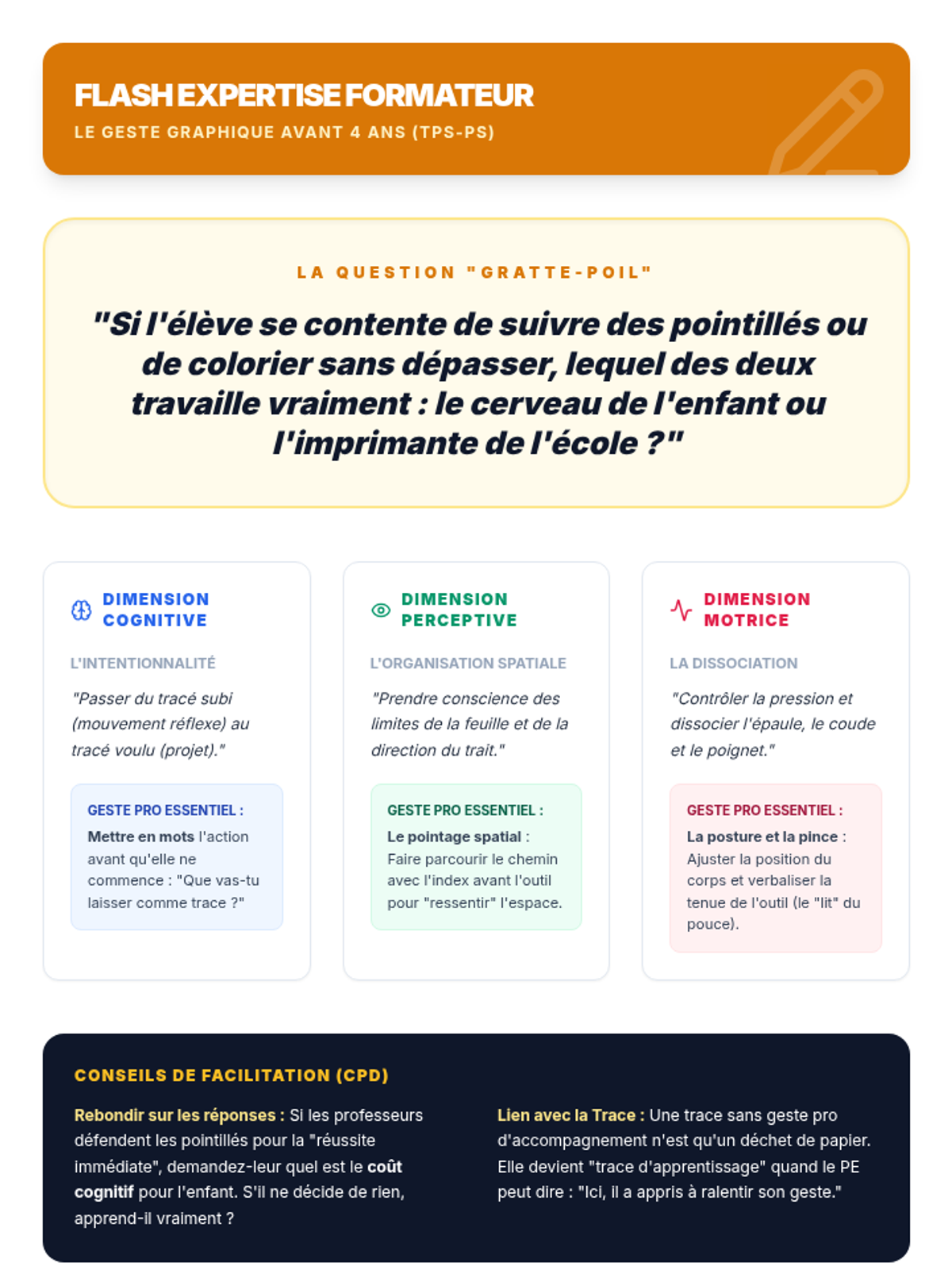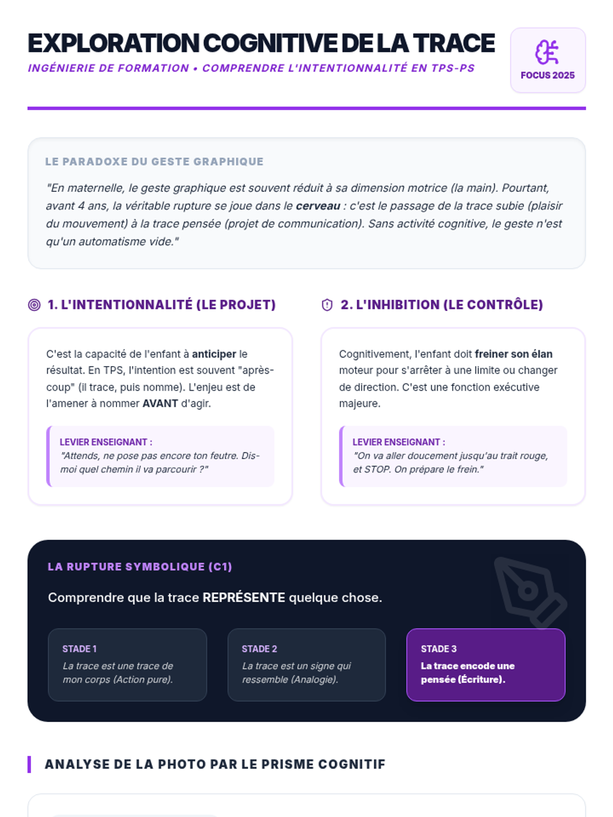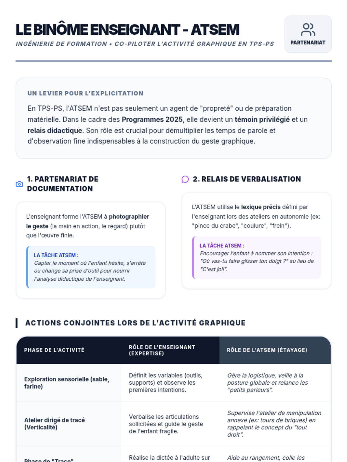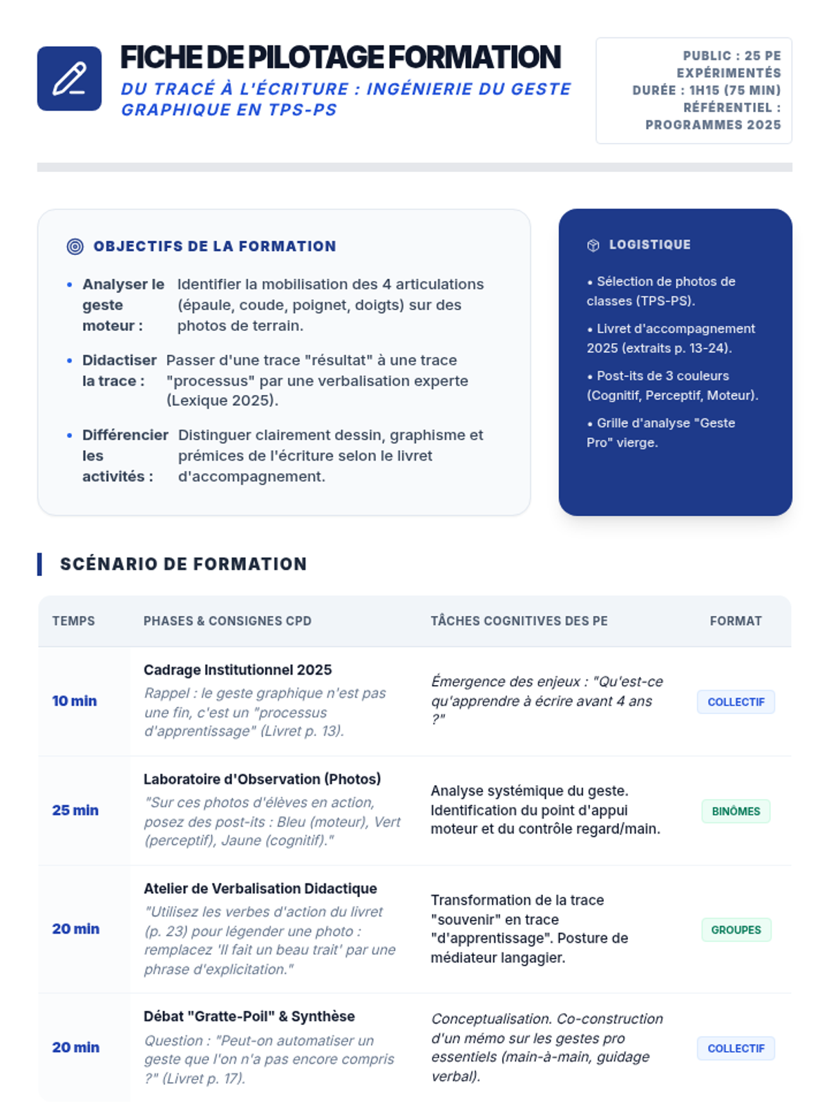 Cette formation pour les professeurs de TPS-PS vise à professionnaliser la conception des "traces" d'activités (cahiers de vie, affichages). En s'appuyant sur les photos de classe et les guides 2025, les enseignants apprennent à rendre les apprentissages explicites pour les élèves et les familles.