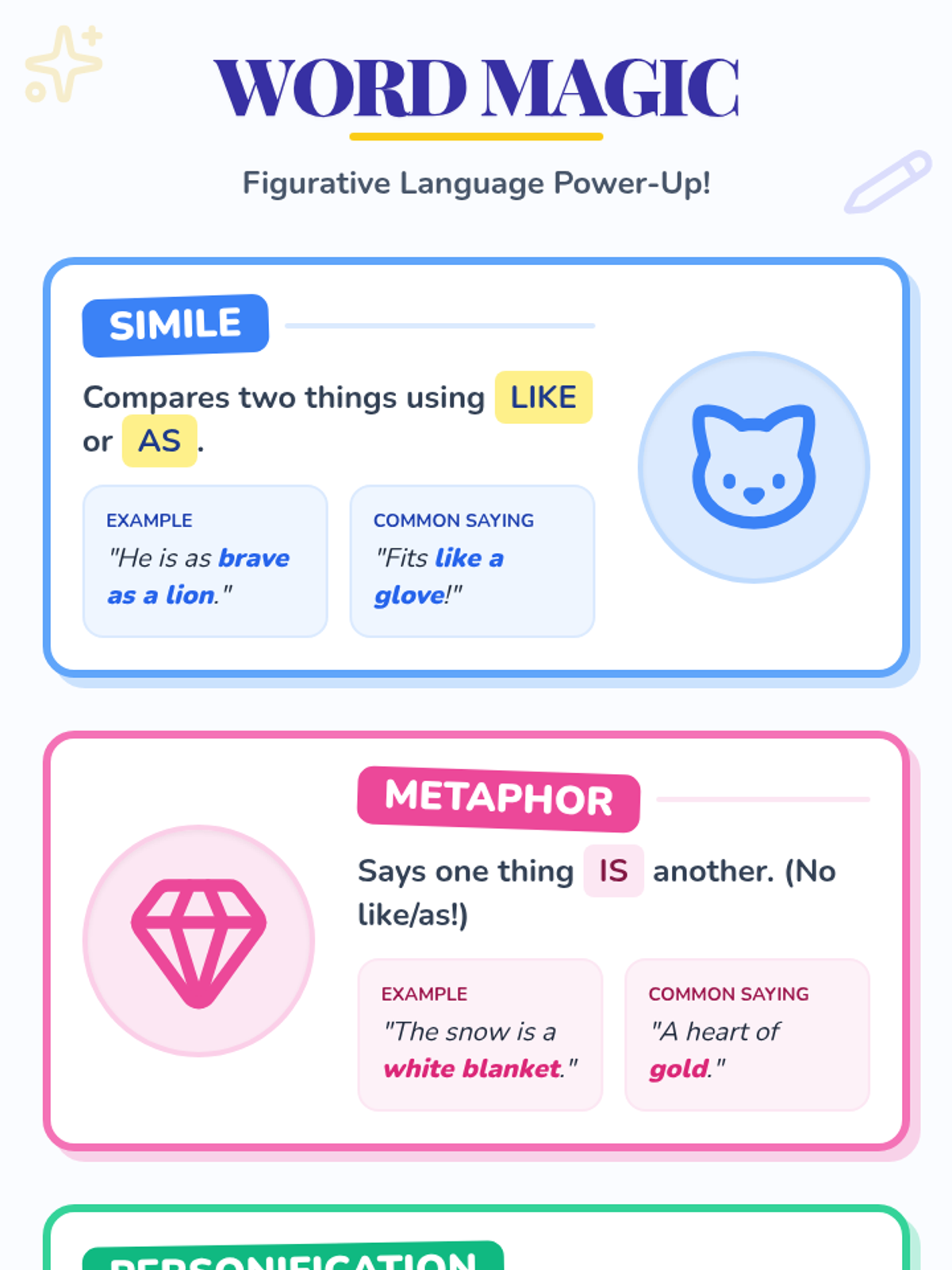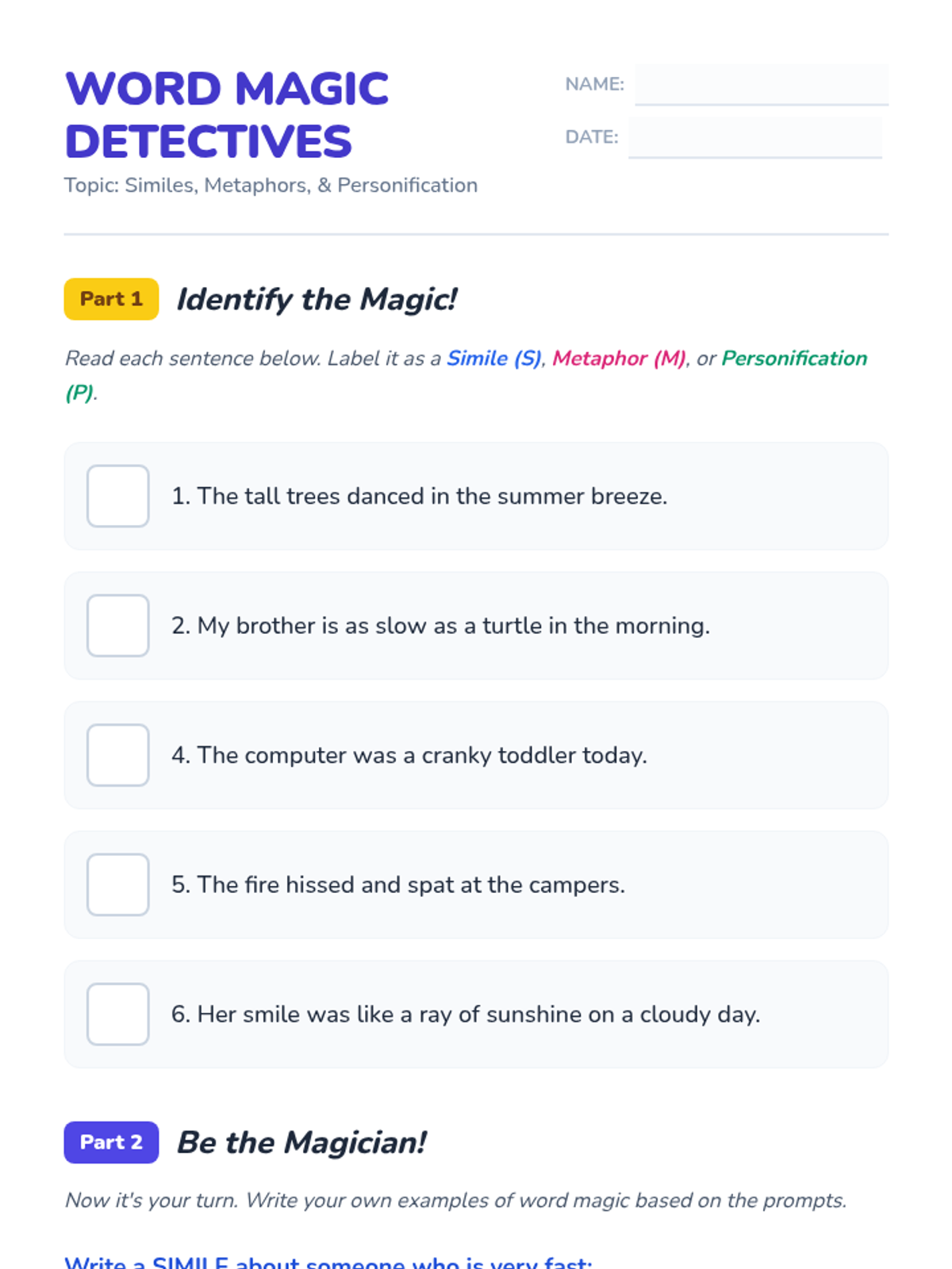 A foundational lesson on identifying and using similes, metaphors, and personification to enhance writing and descriptive language.