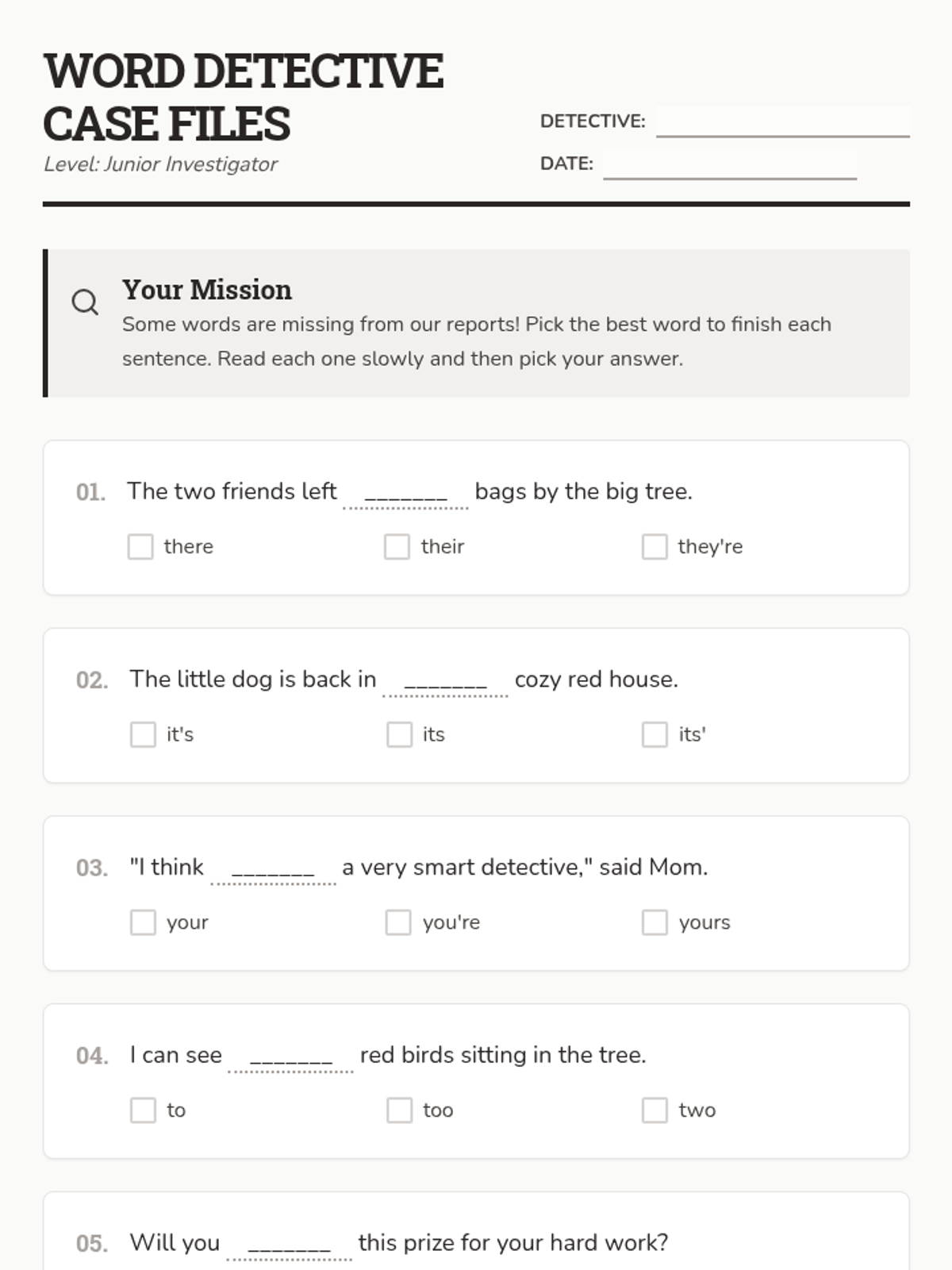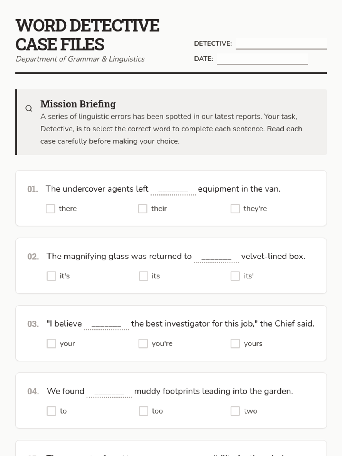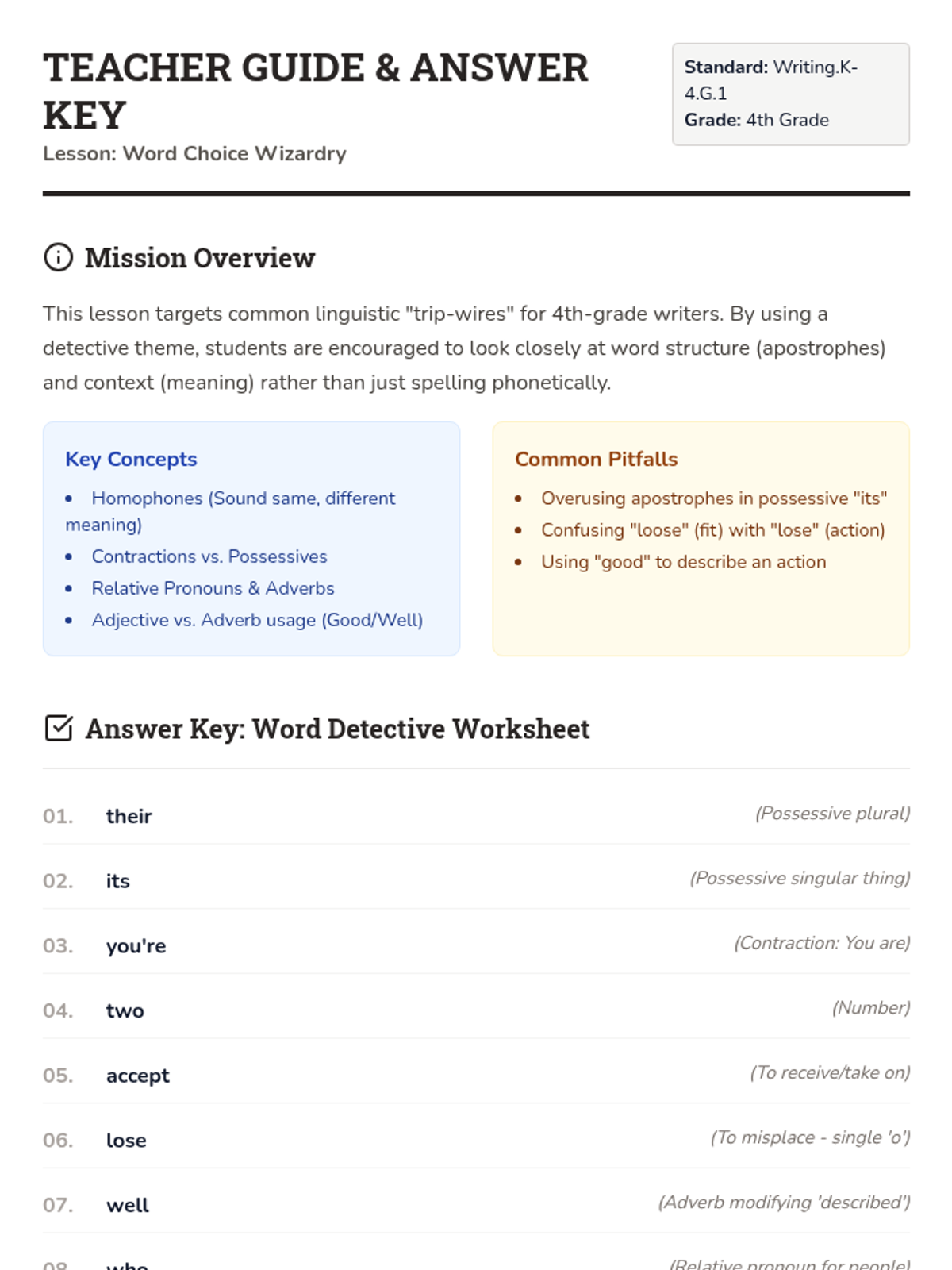 A lesson focused on common word usage errors, homophones, and frequently confused words for 4th-grade writers. Students practice identifying and using the correct words in context through detective-themed scenarios.