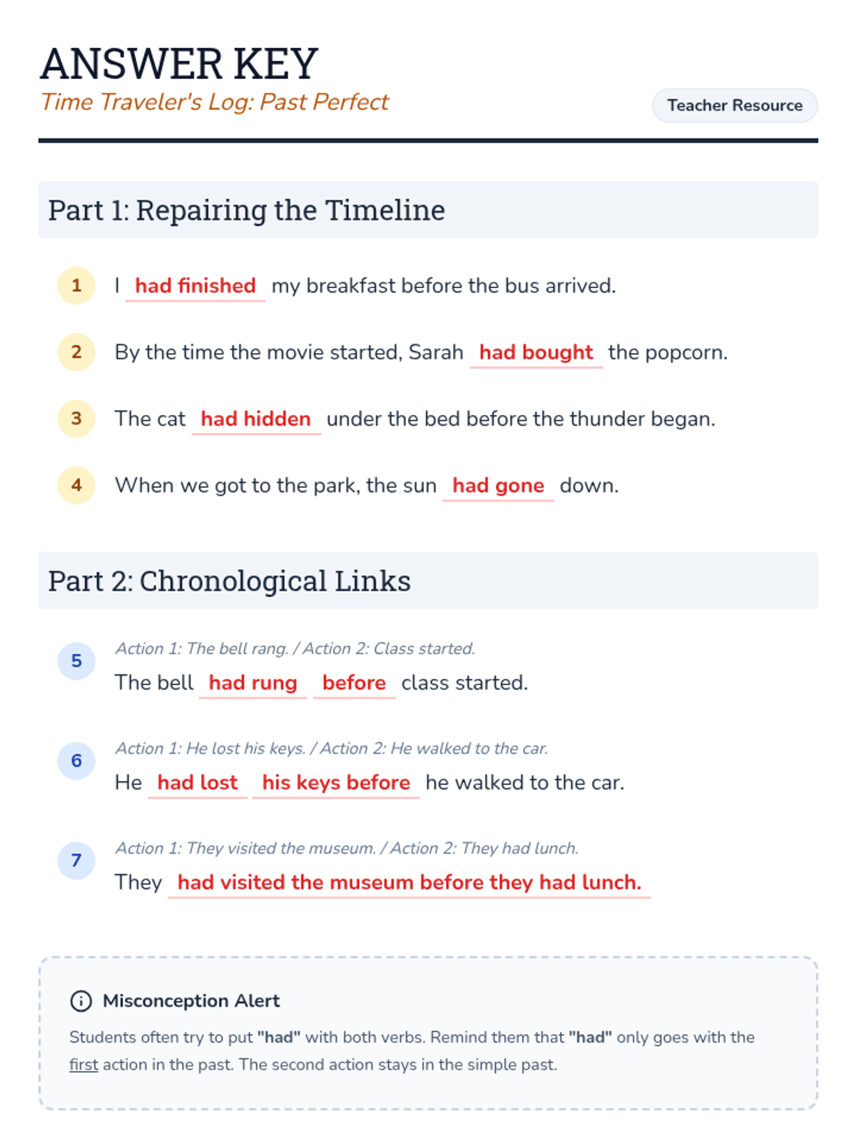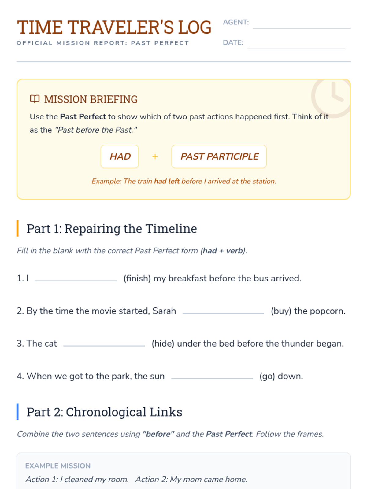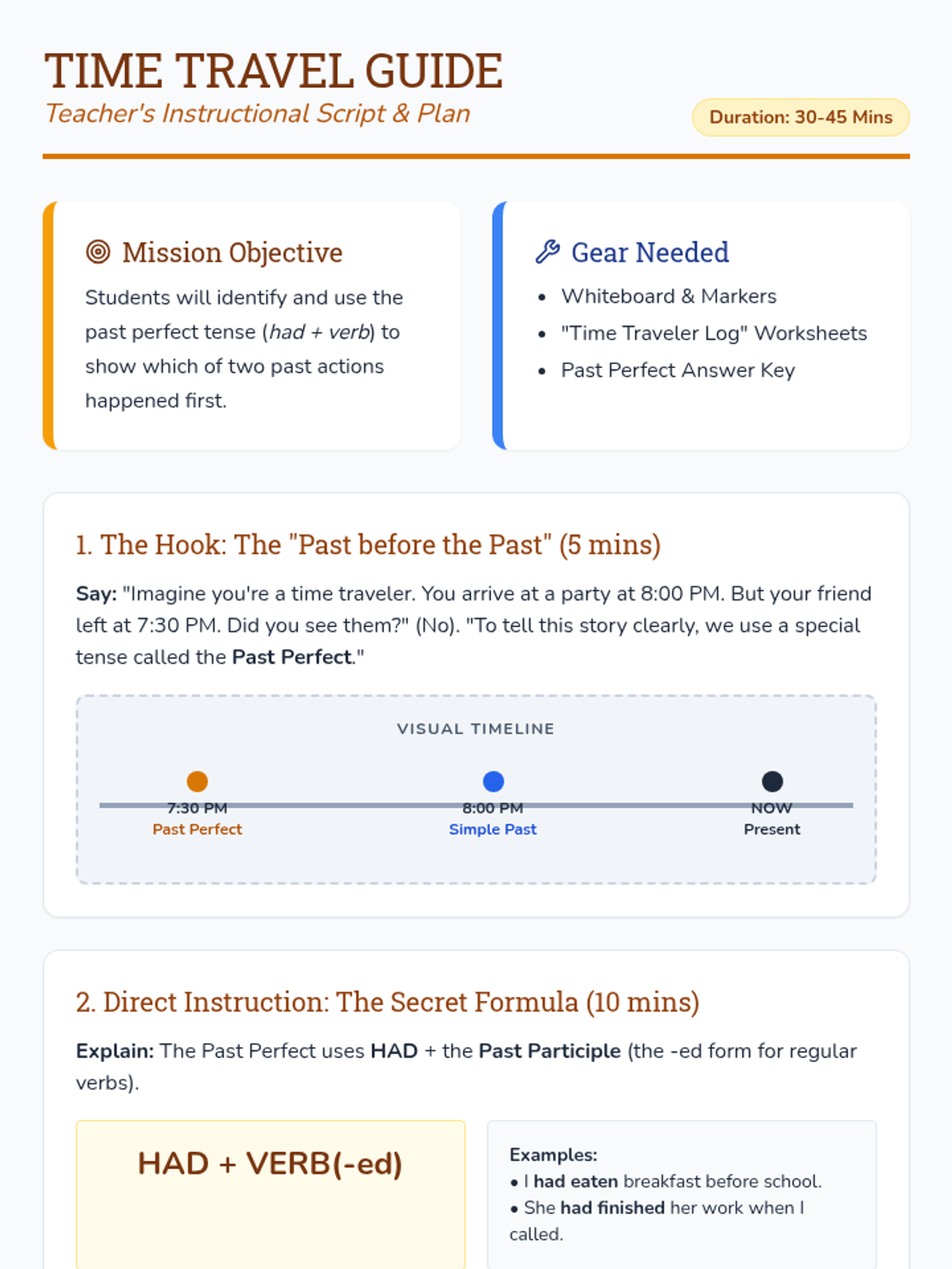 A comprehensive 30-45 minute lesson on the past perfect tense, featuring explicit instructions, a time-travel themed worksheet, and a detailed teacher guide. This lesson helps students understand how to sequence two past events using the 'past before the past' structure.