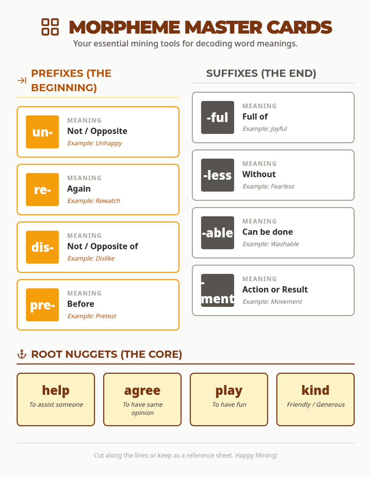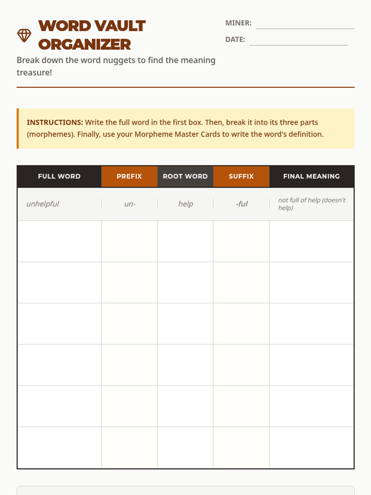 A 30-45 minute lesson focused on decoding multisyllabic words using morphology (prefixes, suffixes, and root words). Students will learn to 'mine' for meaning by breaking words into their component parts.