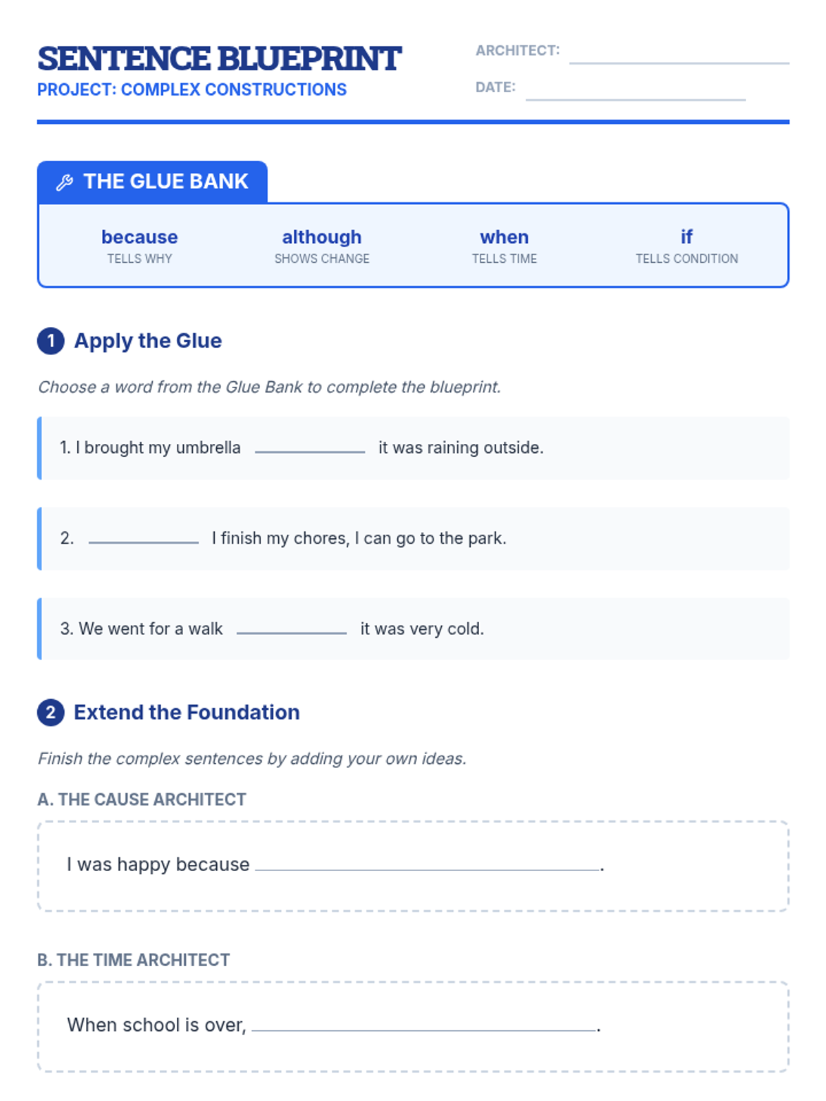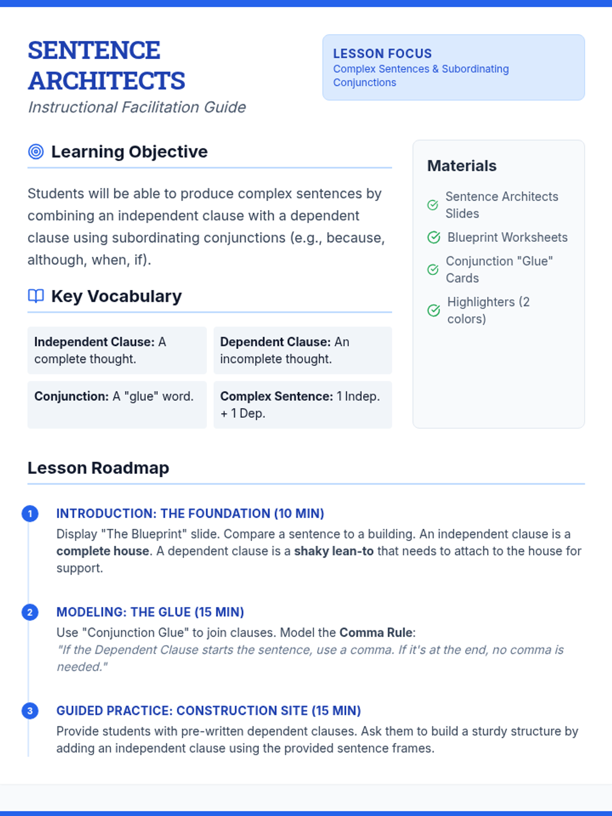 A lesson focused on constructing complex sentences using subordinating conjunctions, featuring architectural-themed scaffolds and sentence frames for Special Education support.