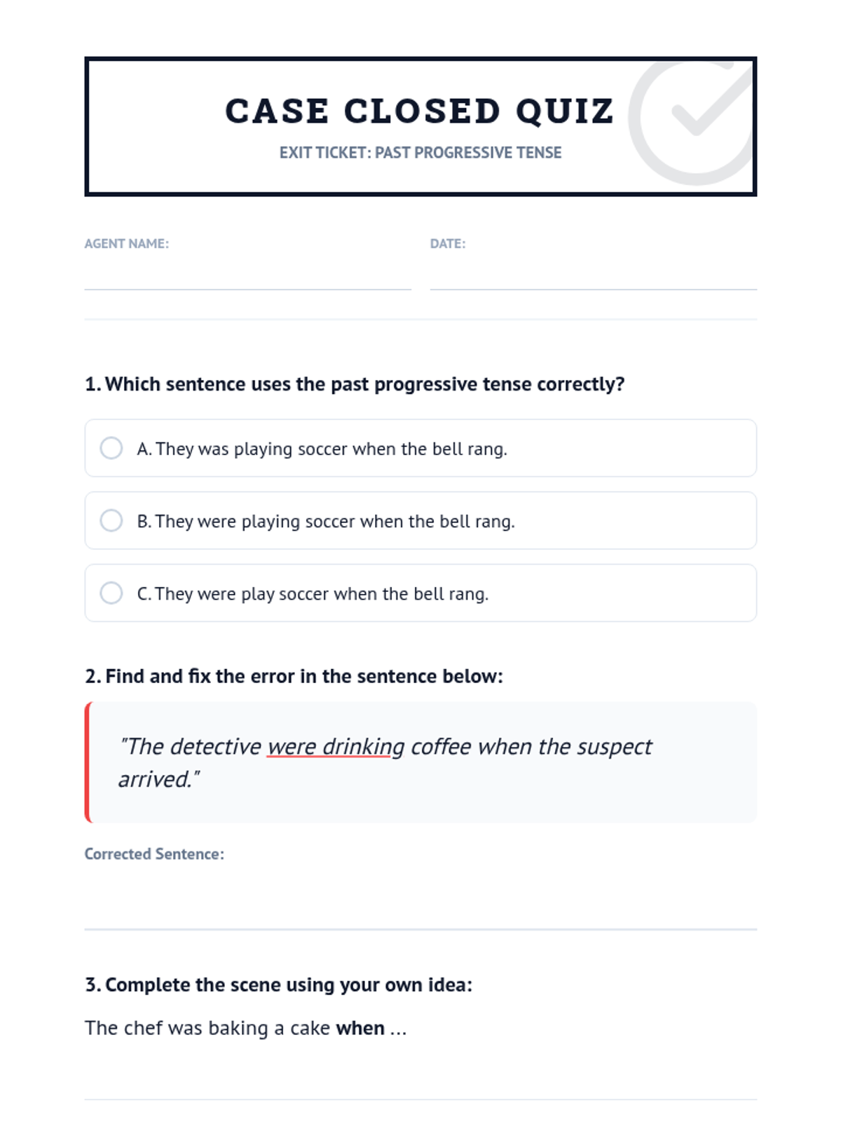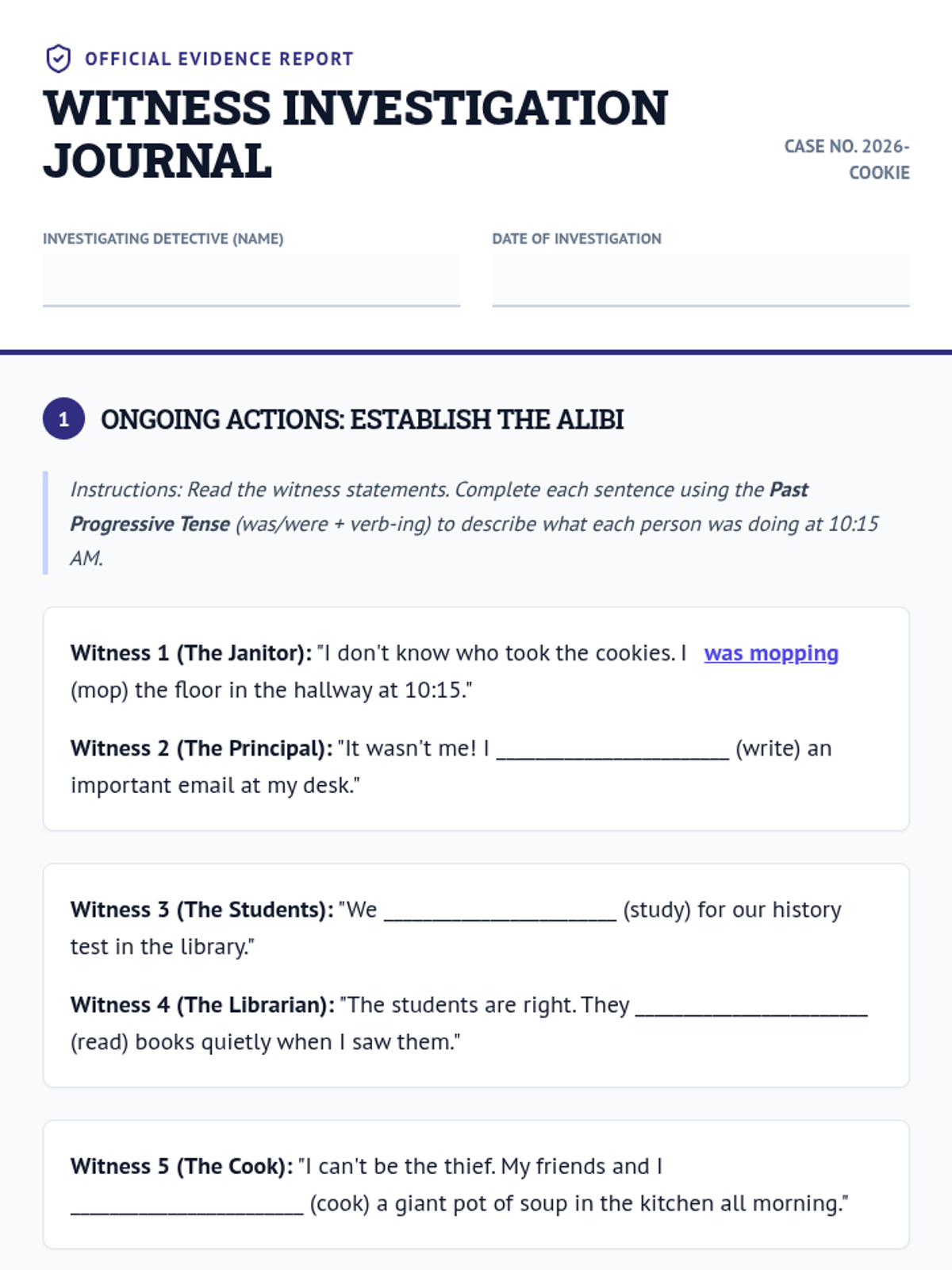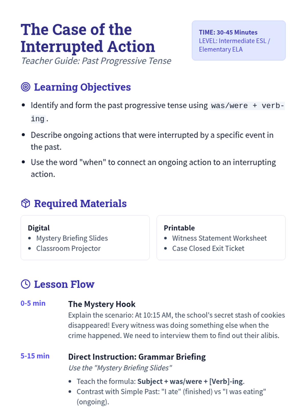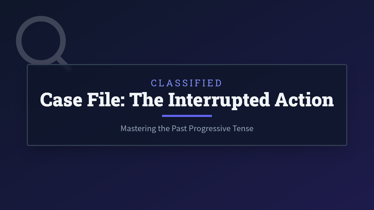 A lesson on the past progressive tense (was/were + verb-ing) focused on describing ongoing and interrupted actions in the past through a detective mystery theme.