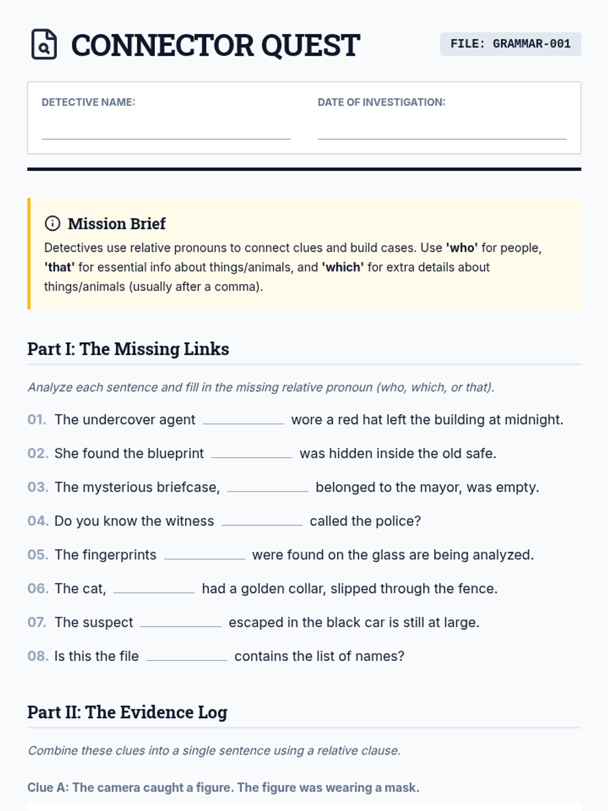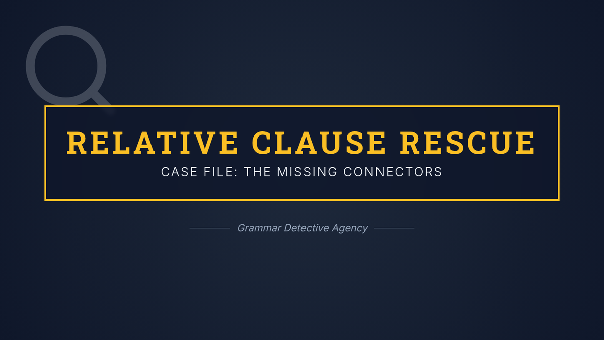 A detective-themed grammar lesson focused on correctly using relative pronouns 'who', 'which', and 'that'. Students will identify the correct pronouns for people versus objects through interactive instruction and a practice mission.