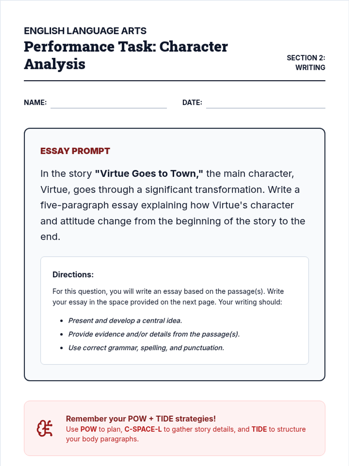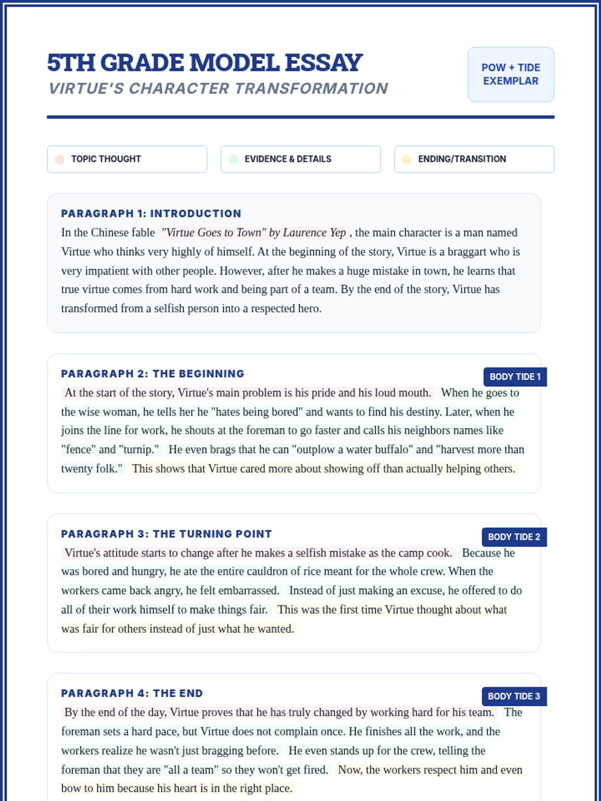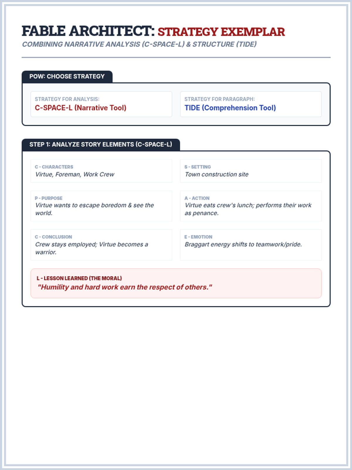 A comprehensive ELA lesson using the SRSD (Self-Regulated Strategy Development) framework to teach students how to analyze and summarize the Chinese fable 'Virtue Goes to Town'. Students will use the POW, TIDE, and C-SPACE mnemonics to organize their thoughts and write a cohesive summary.