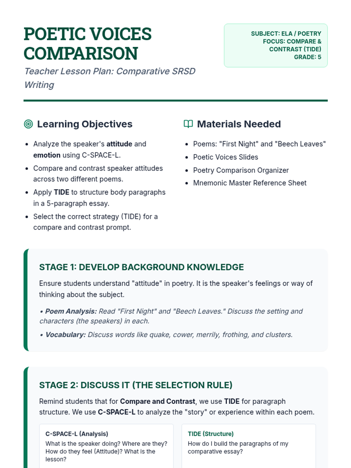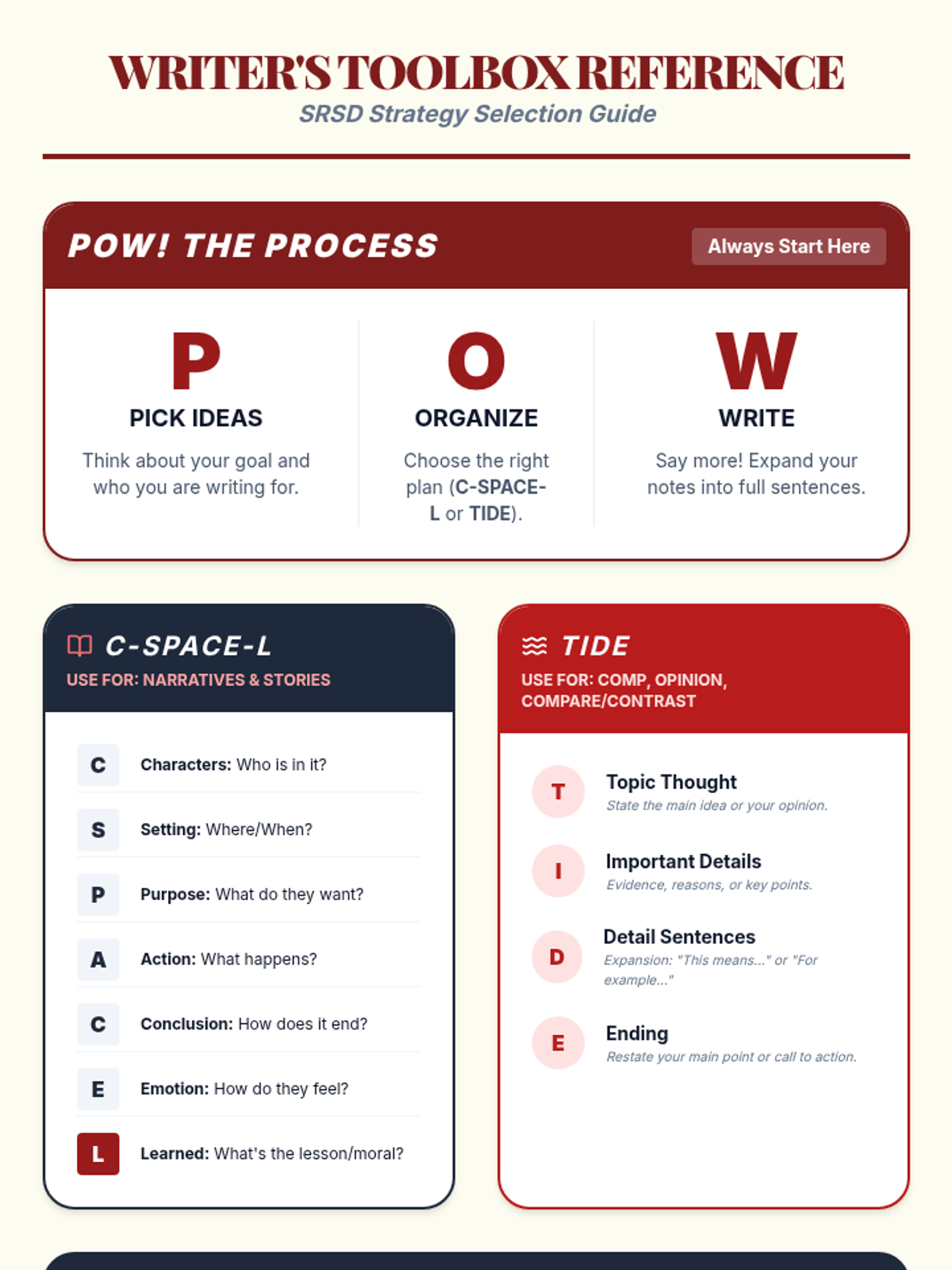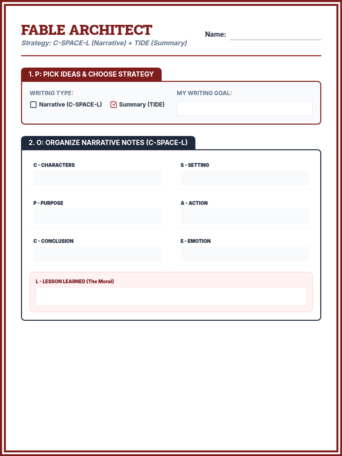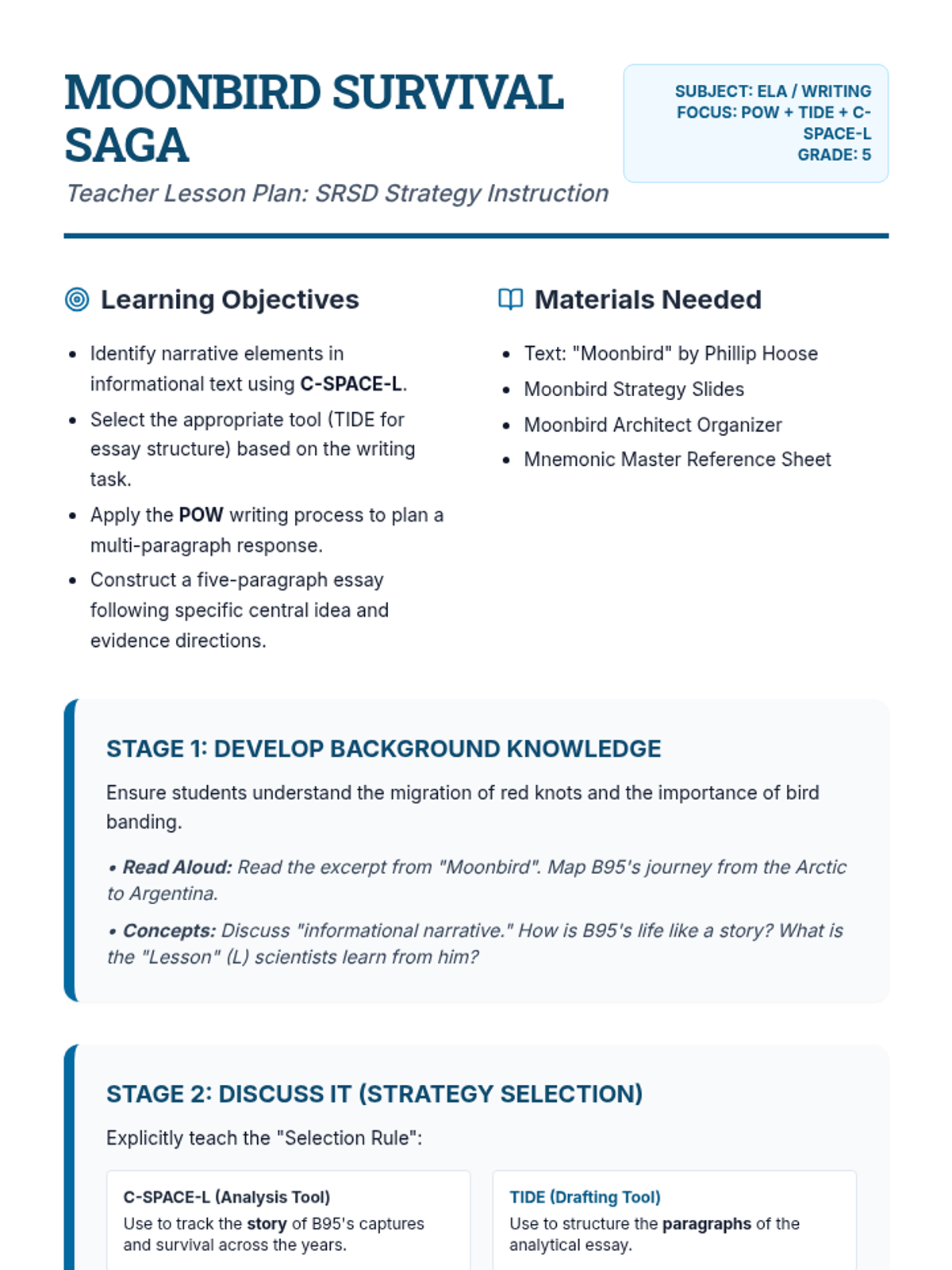 A comprehensive ELA lesson using the SRSD (Self-Regulated Strategy Development) framework to teach students how to analyze and summarize the Chinese fable 'Virtue Goes to Town'. Students will use the POW, TIDE, and C-SPACE mnemonics to organize their thoughts and write a cohesive summary.