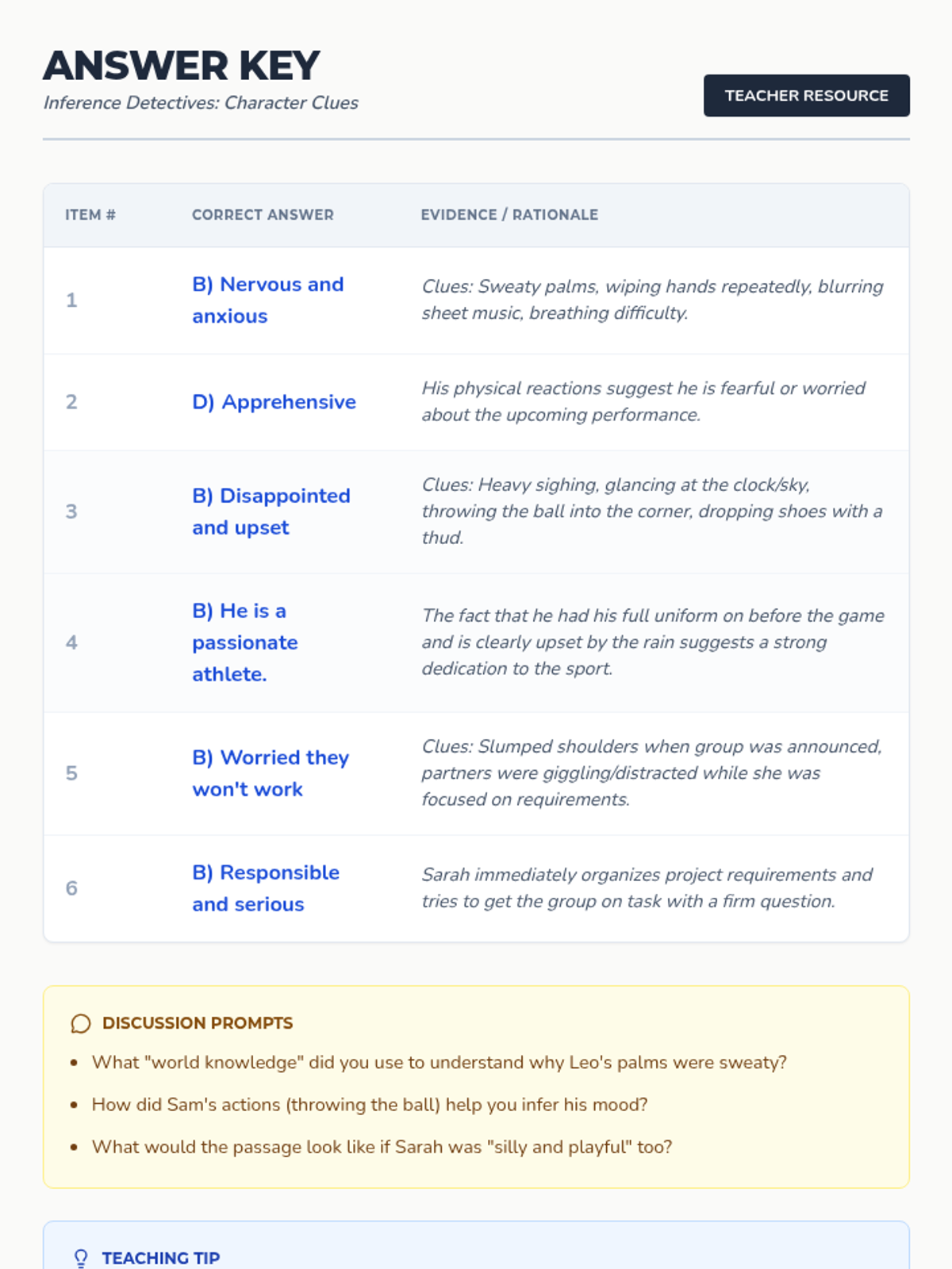 A lesson focused on teaching students how to infer character traits and feelings from short fictional scenarios. Includes a themed detective worksheet and an answer key.