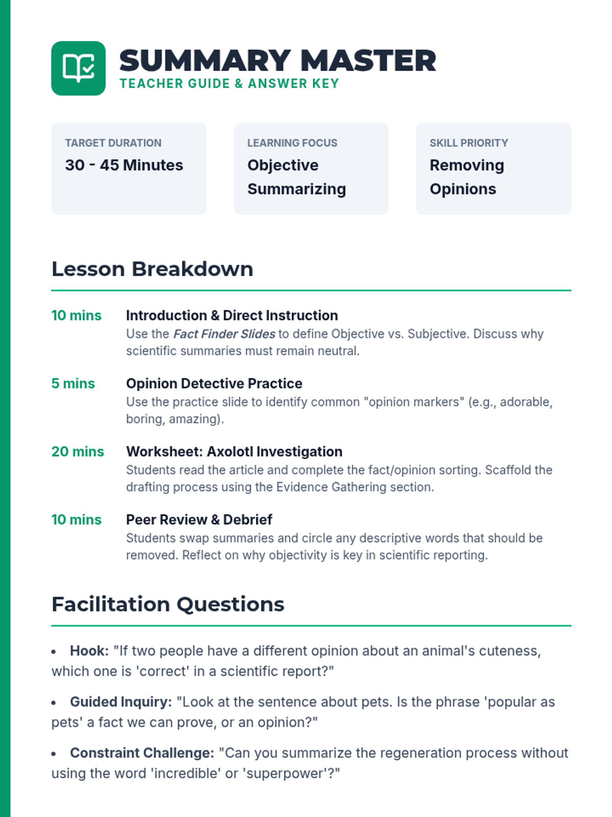 A lesson focused on writing objective summaries of non-fiction texts by distinguishing between facts and personal opinions using an animal-themed article.