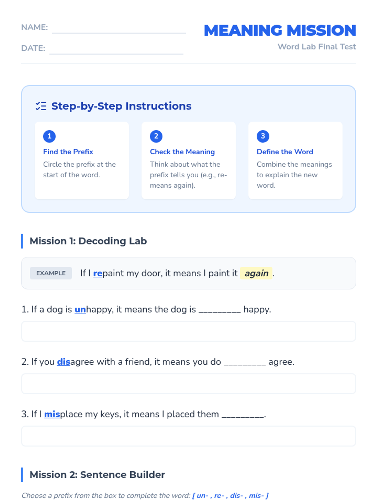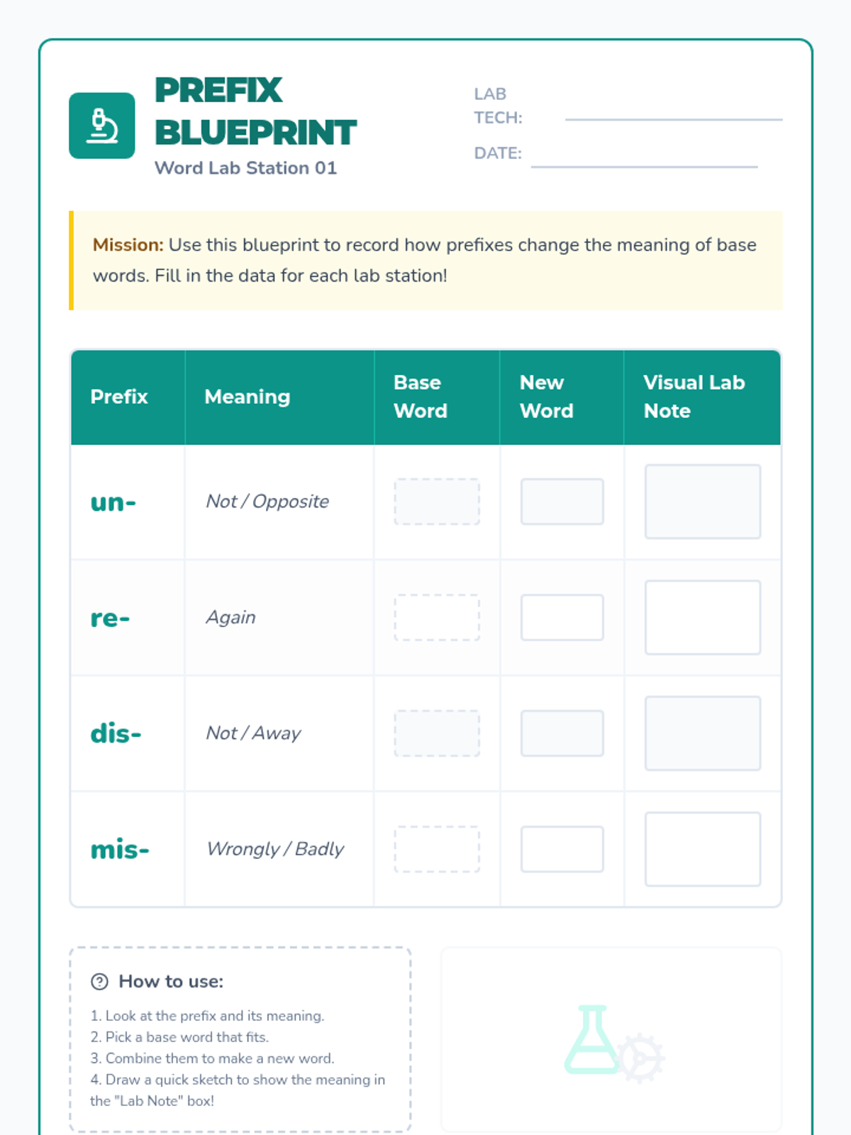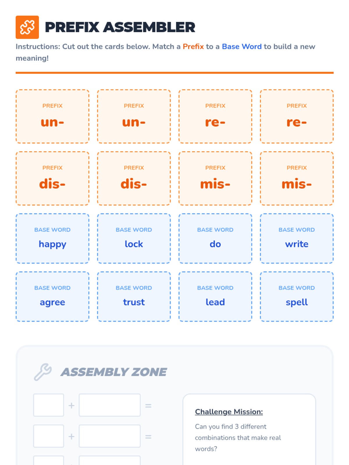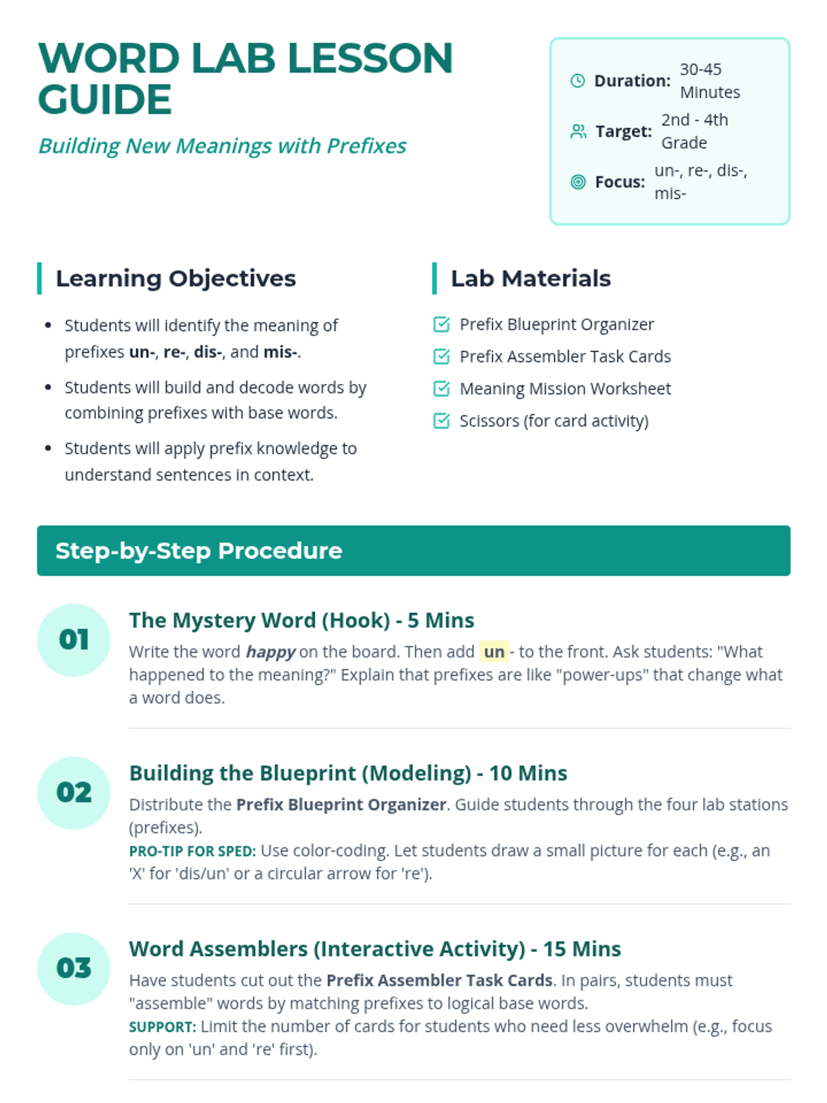 A scaffolded introductory lesson on using common prefixes (un-, re-, dis-, mis-) to decode word meanings, featuring hands-on sorting activities and visual organizers.