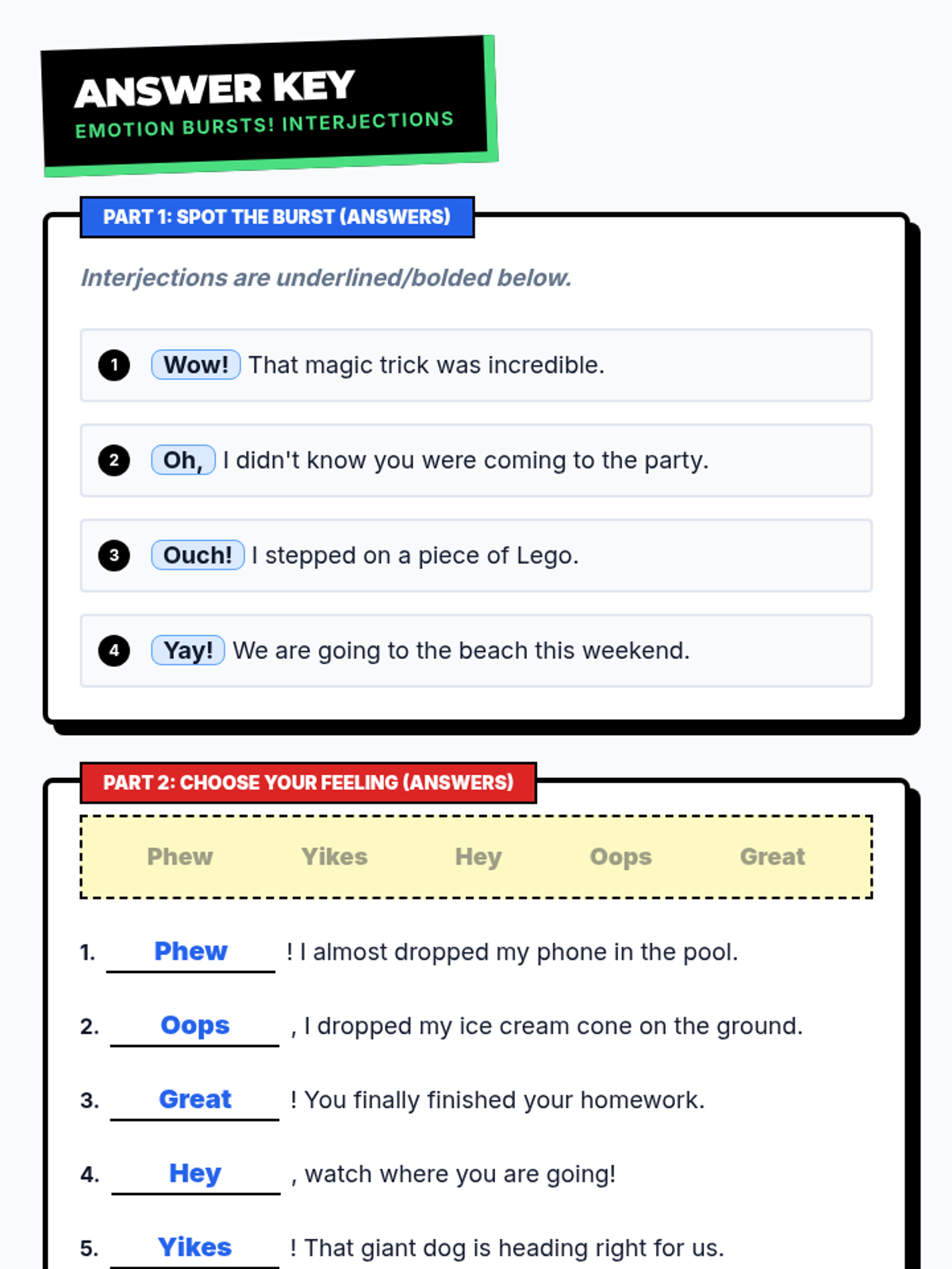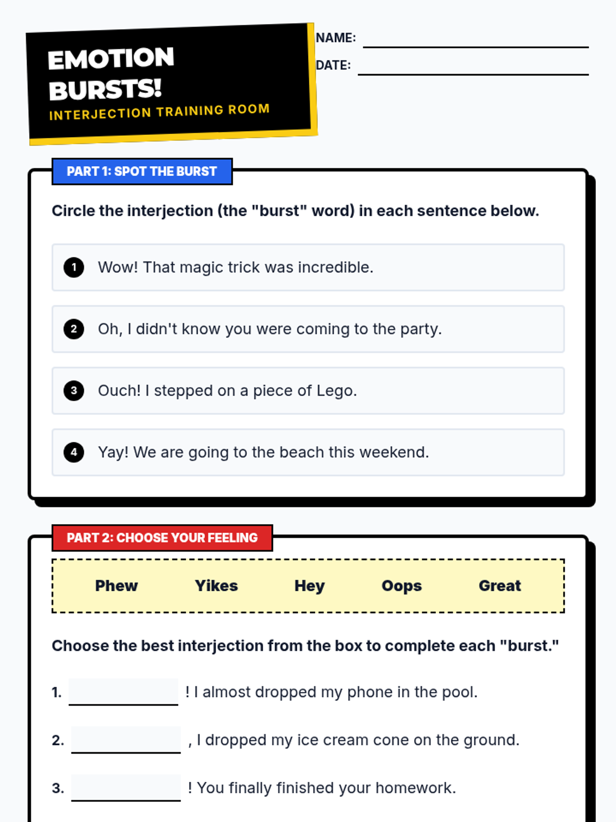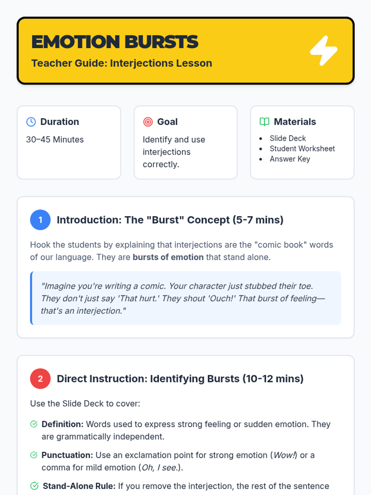 A lesson introducing interjections as expressive 'bursts' of emotion that stand alone from the rest of the sentence. Students will learn to identify common interjections and use them correctly with appropriate punctuation in a comic-book-inspired format.