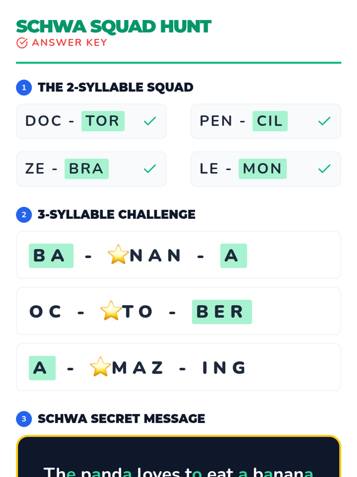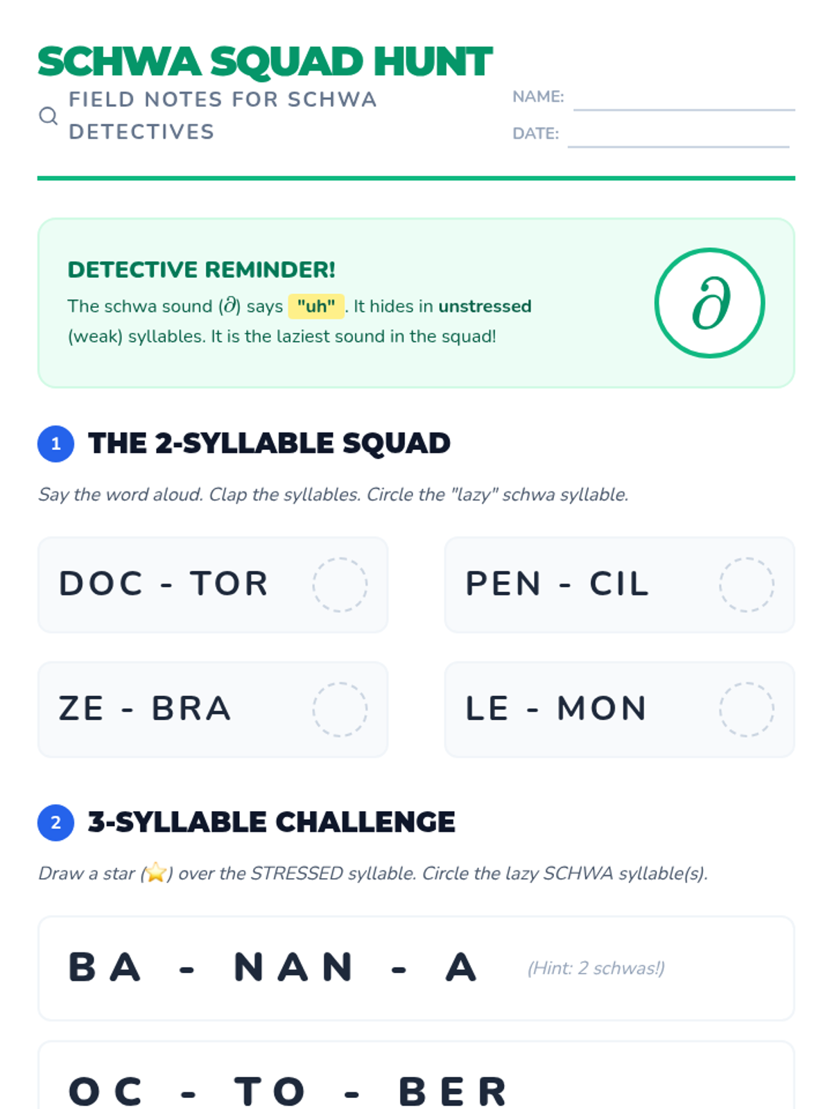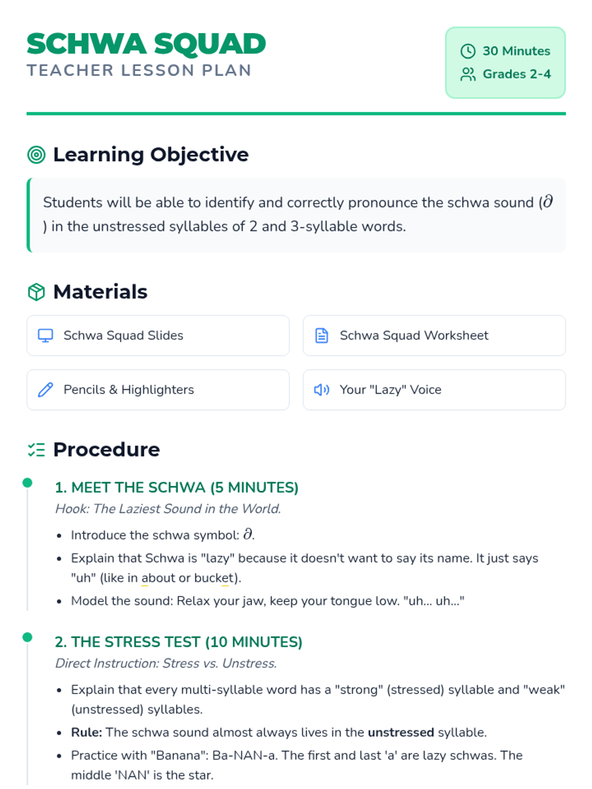 A 30-minute introductory lesson on identifying and pronouncing the schwa sound in 2-3 syllable words, focusing on its 'lazy' nature in unstressed syllables.