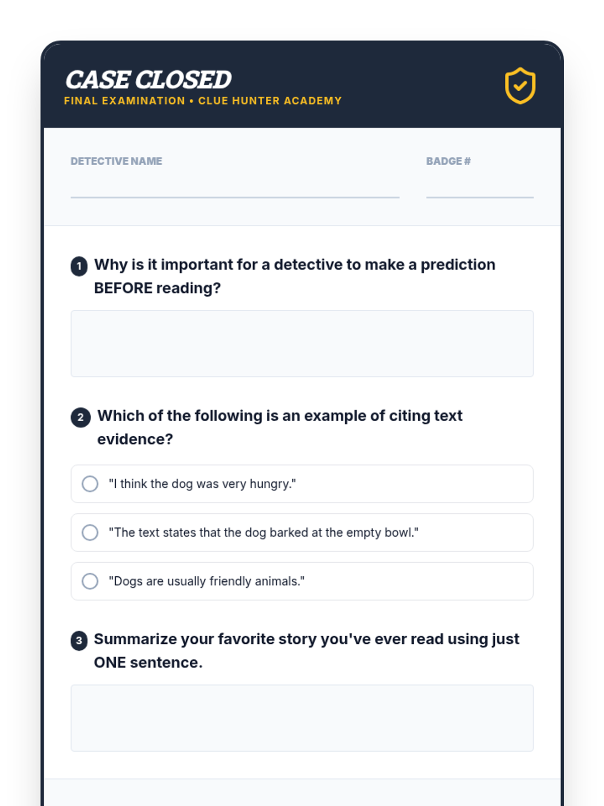 A detective-themed lesson teaching 3rd-5th grade students how to use reading comprehension strategies like predicting, questioning, summarizing, and citing evidence to 'crack the case' of any text.