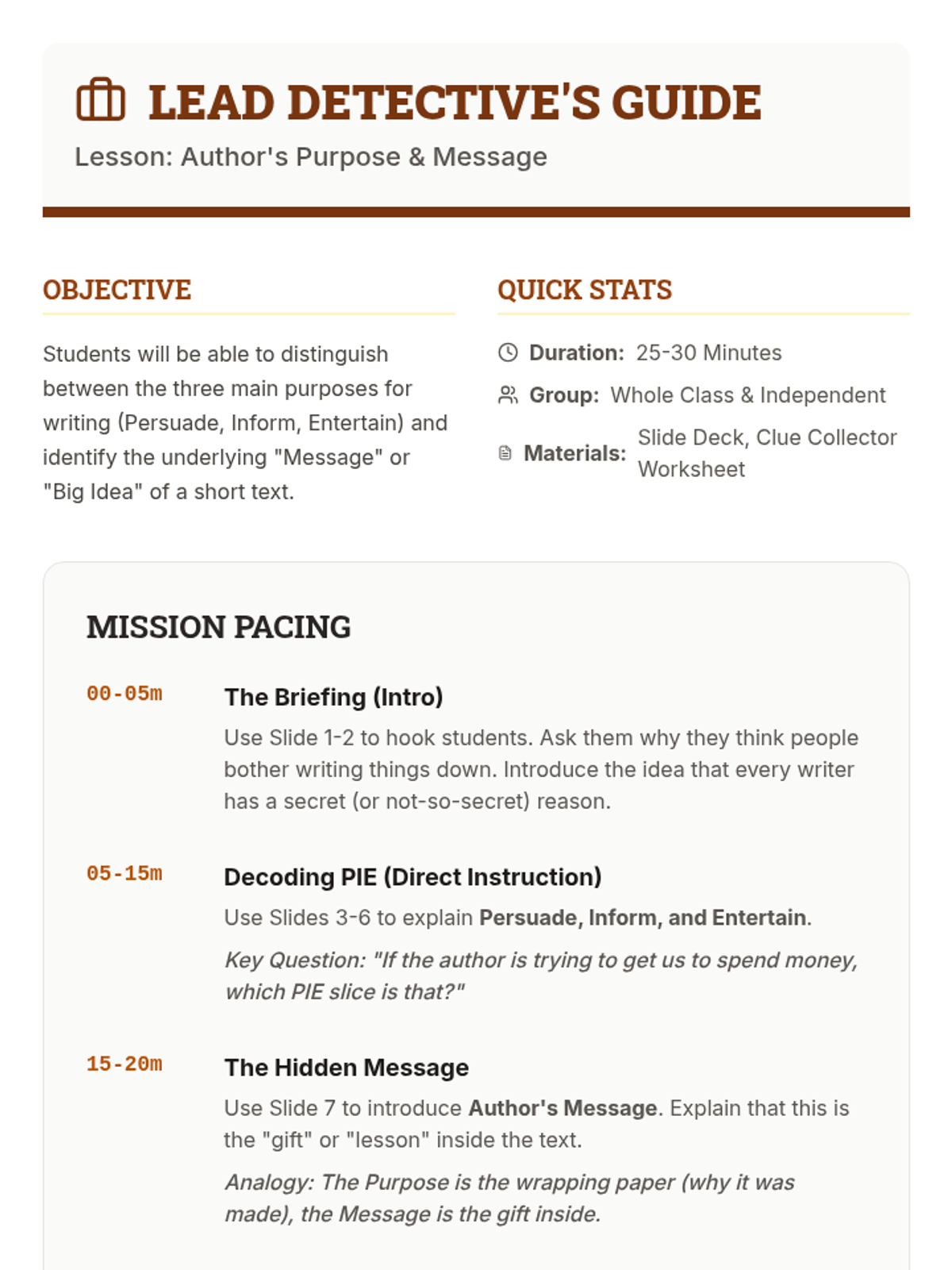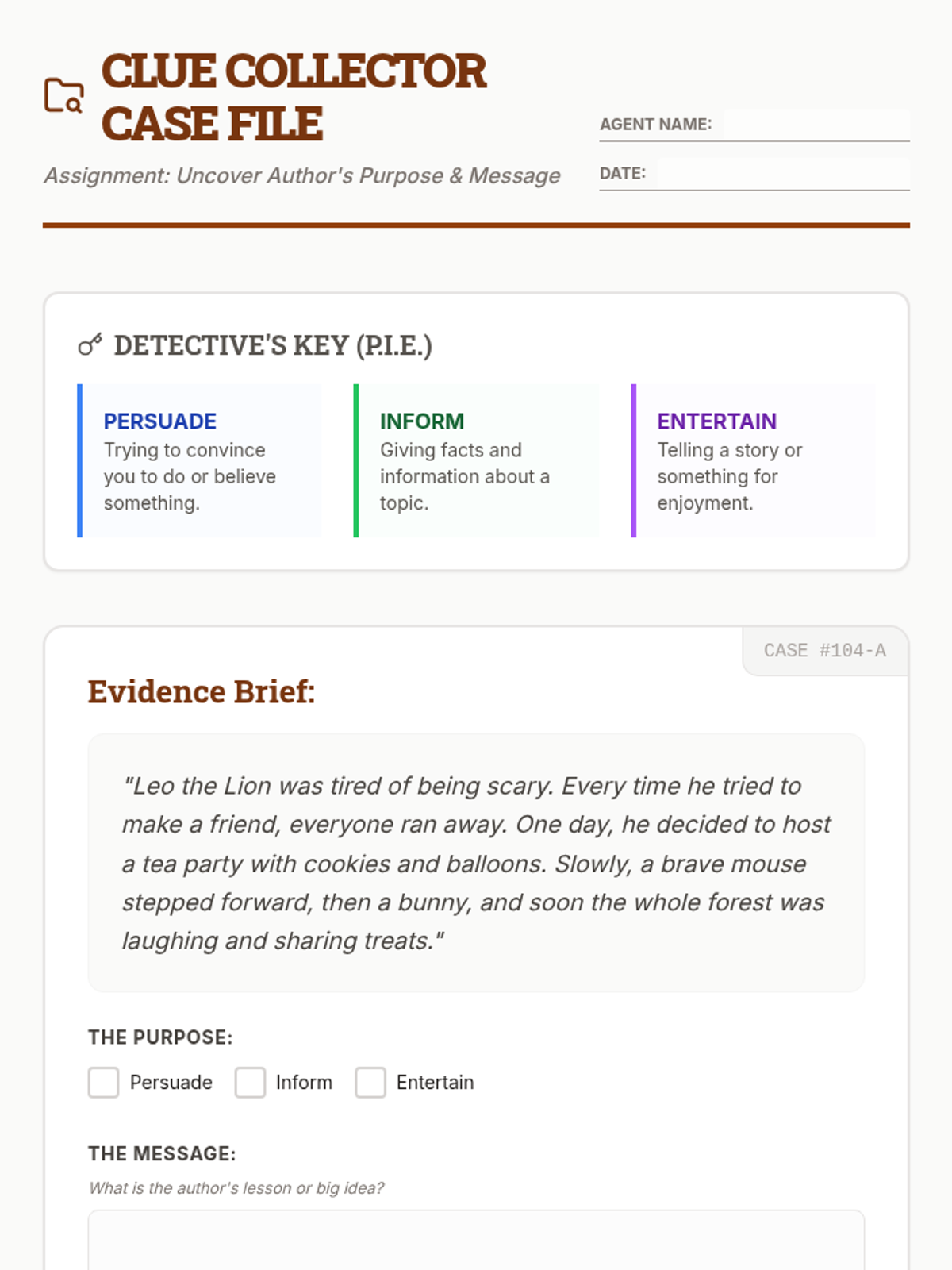 An introductory lesson on identifying Author's Purpose (Persuade, Inform, Entertain) and uncovering the deeper Author's Message through short text analysis.