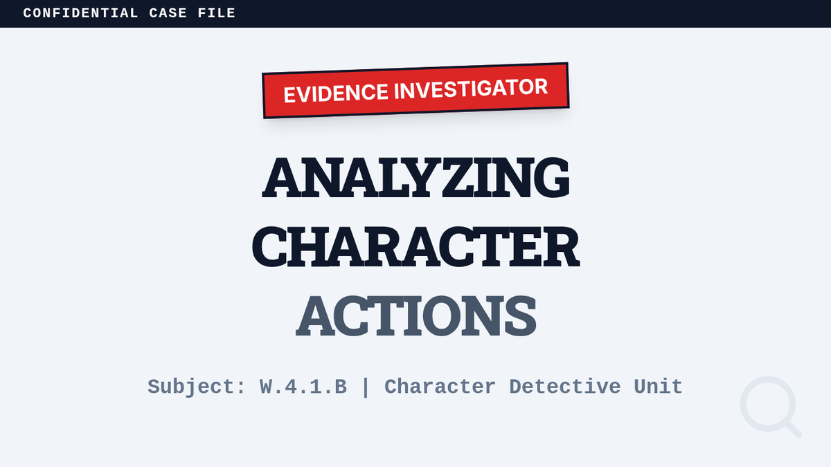 A 4th-grade ELA lesson focused on analyzing character actions and supporting claims with text-based evidence and details. Students act as 'Character Detectives' to uncover what actions reveal about a character's personality.
