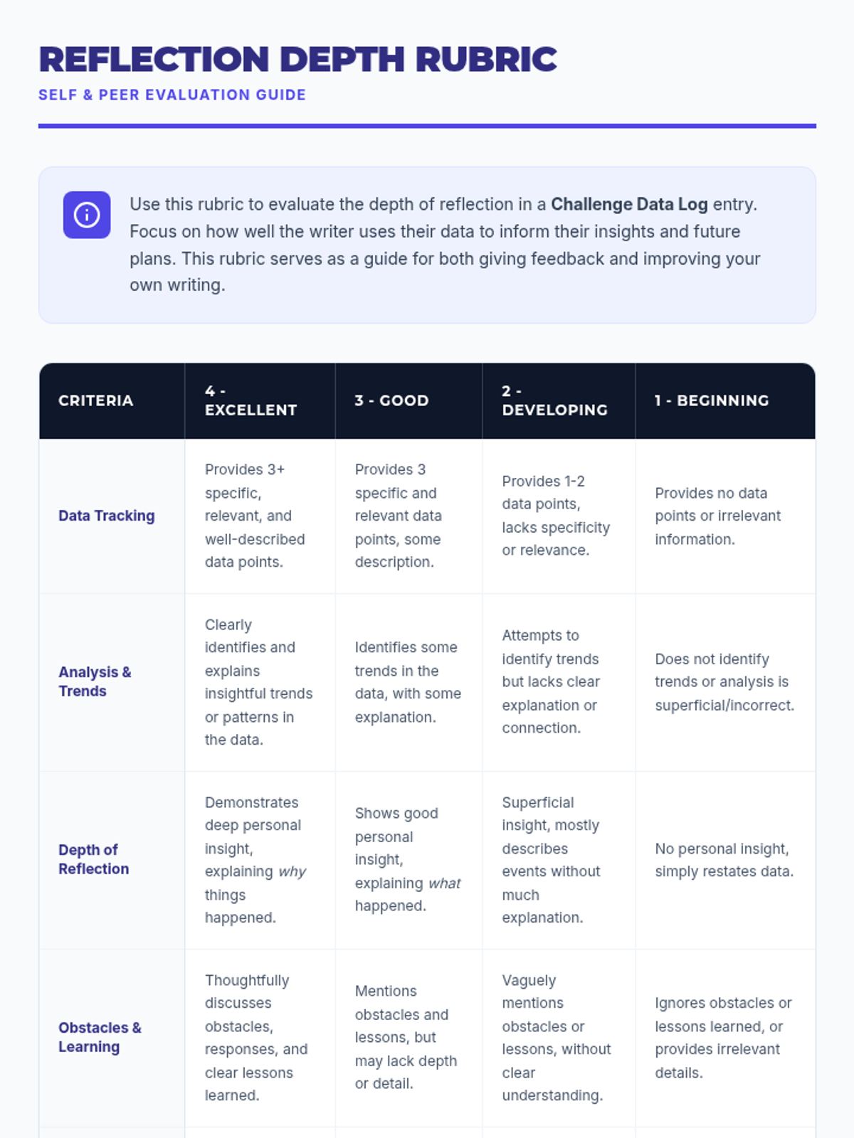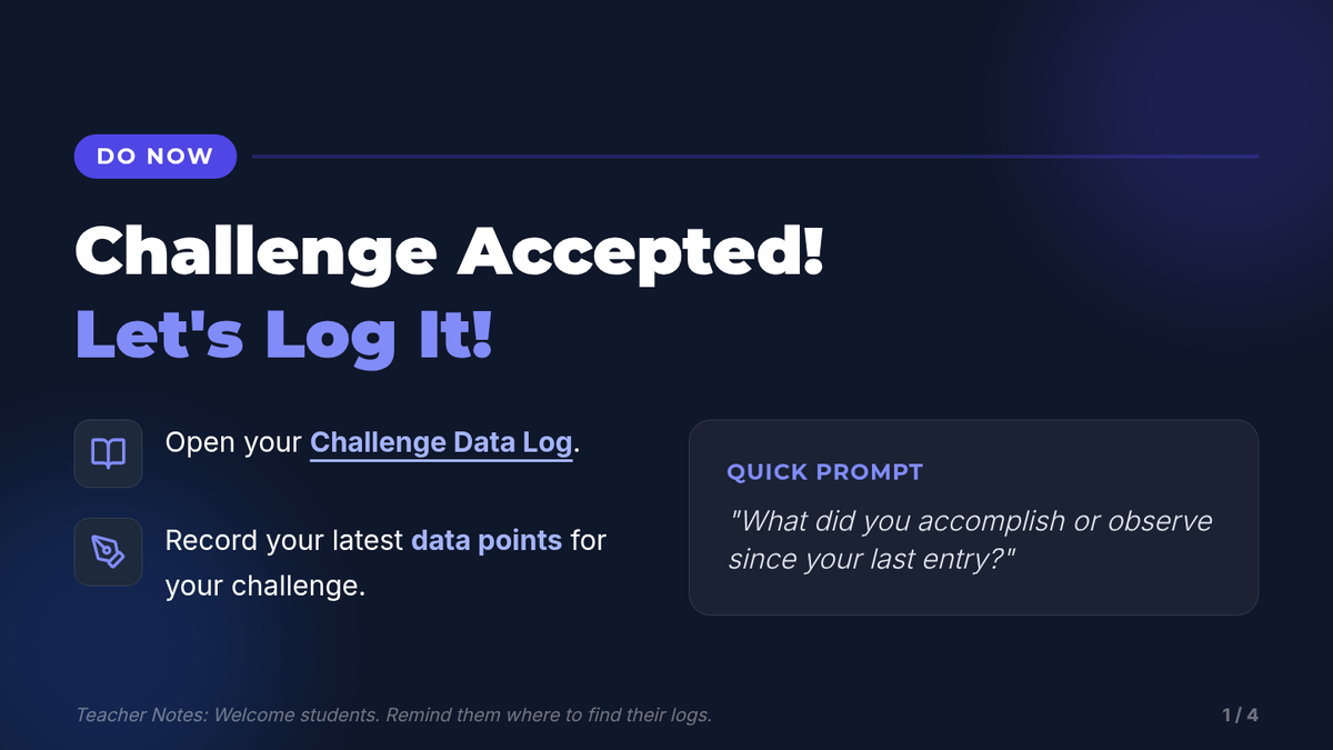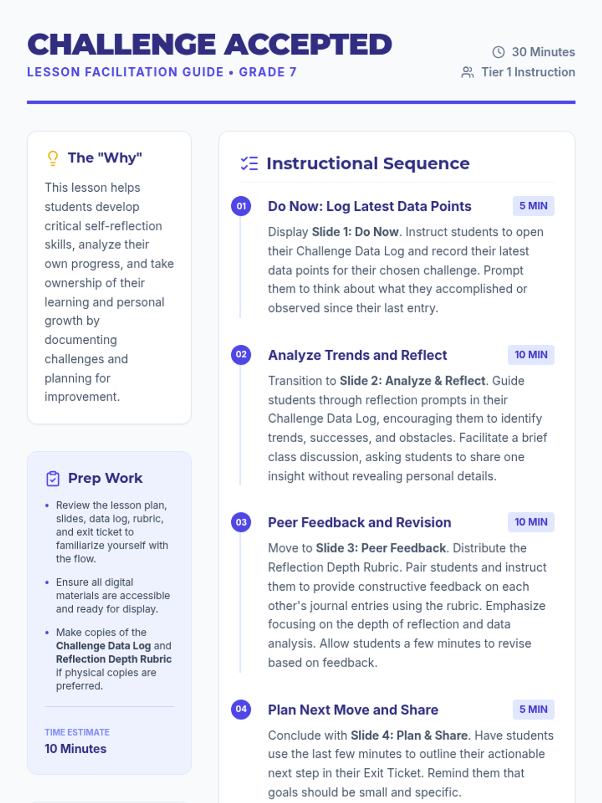 A 30-minute 7th-grade lesson where students track progress on a personal challenge, analyze data trends, and provide peer feedback to refine their growth plans.