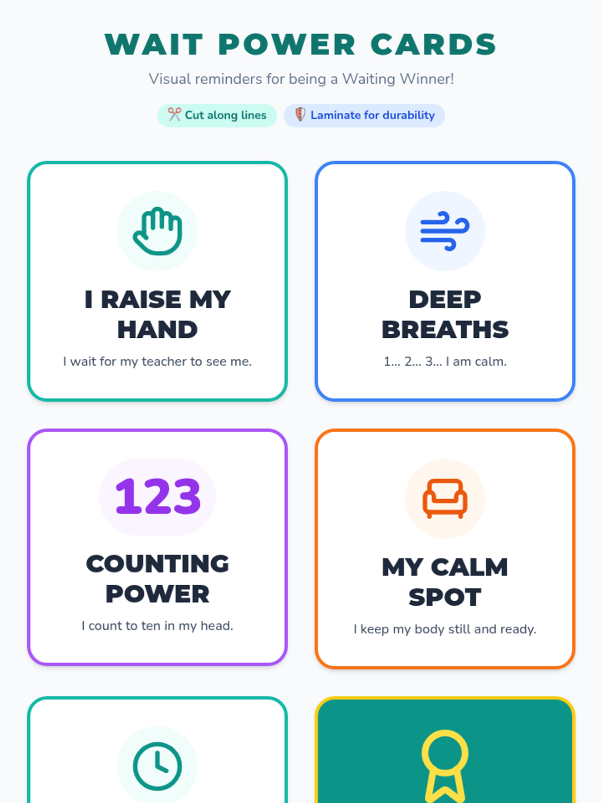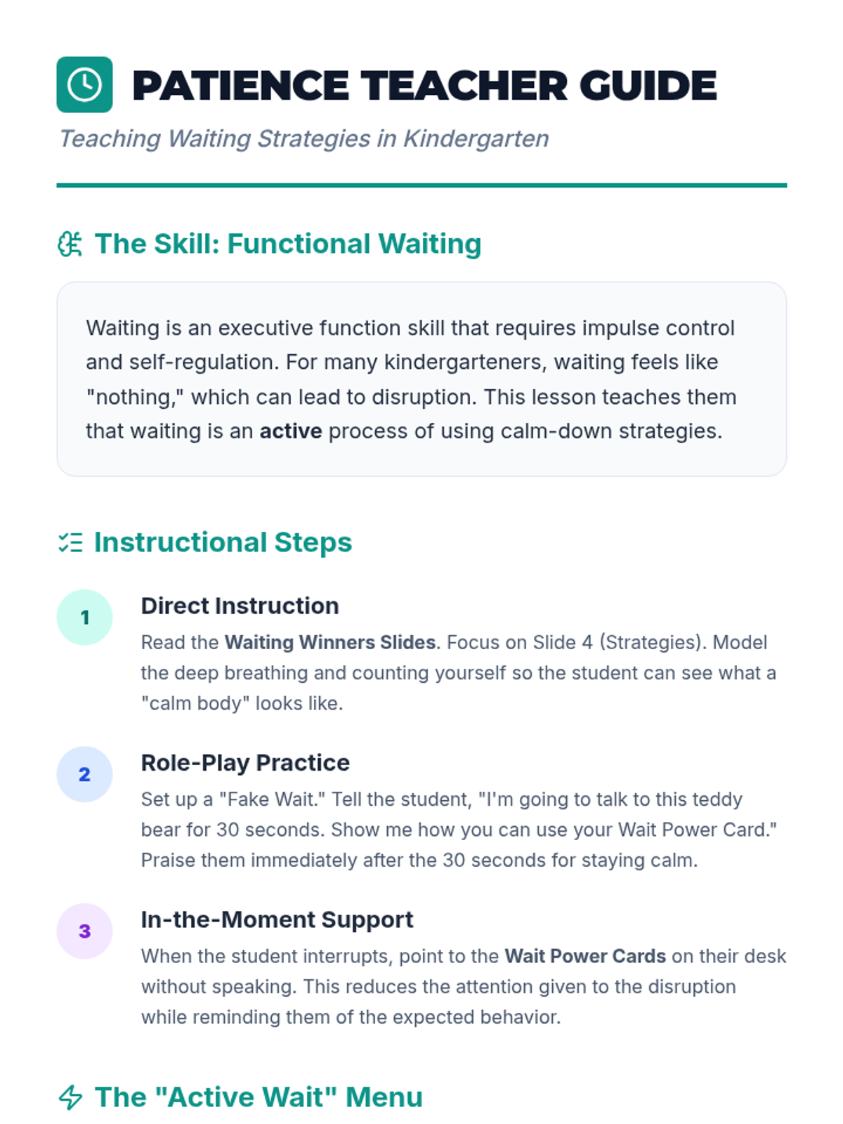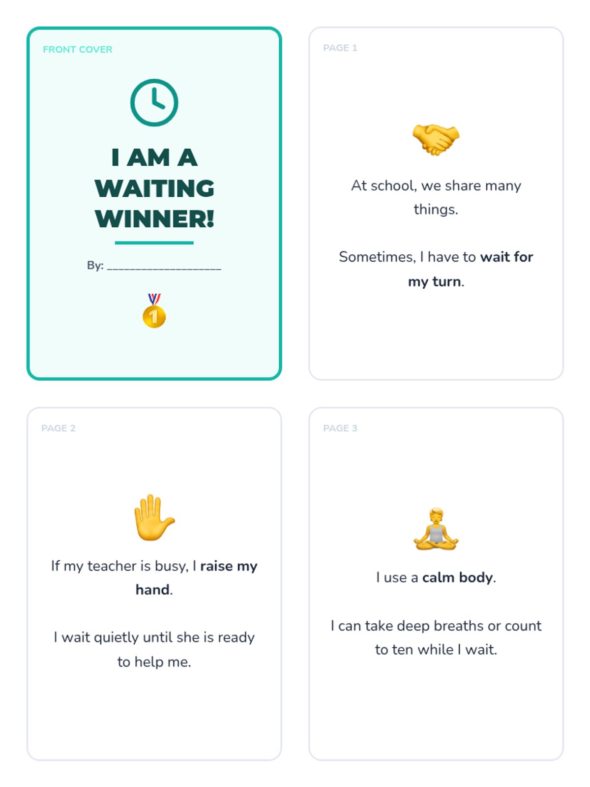 A focused social story and visual support set teaching kindergarteners how to wait patiently for their turn or for adult attention using calm body strategies.