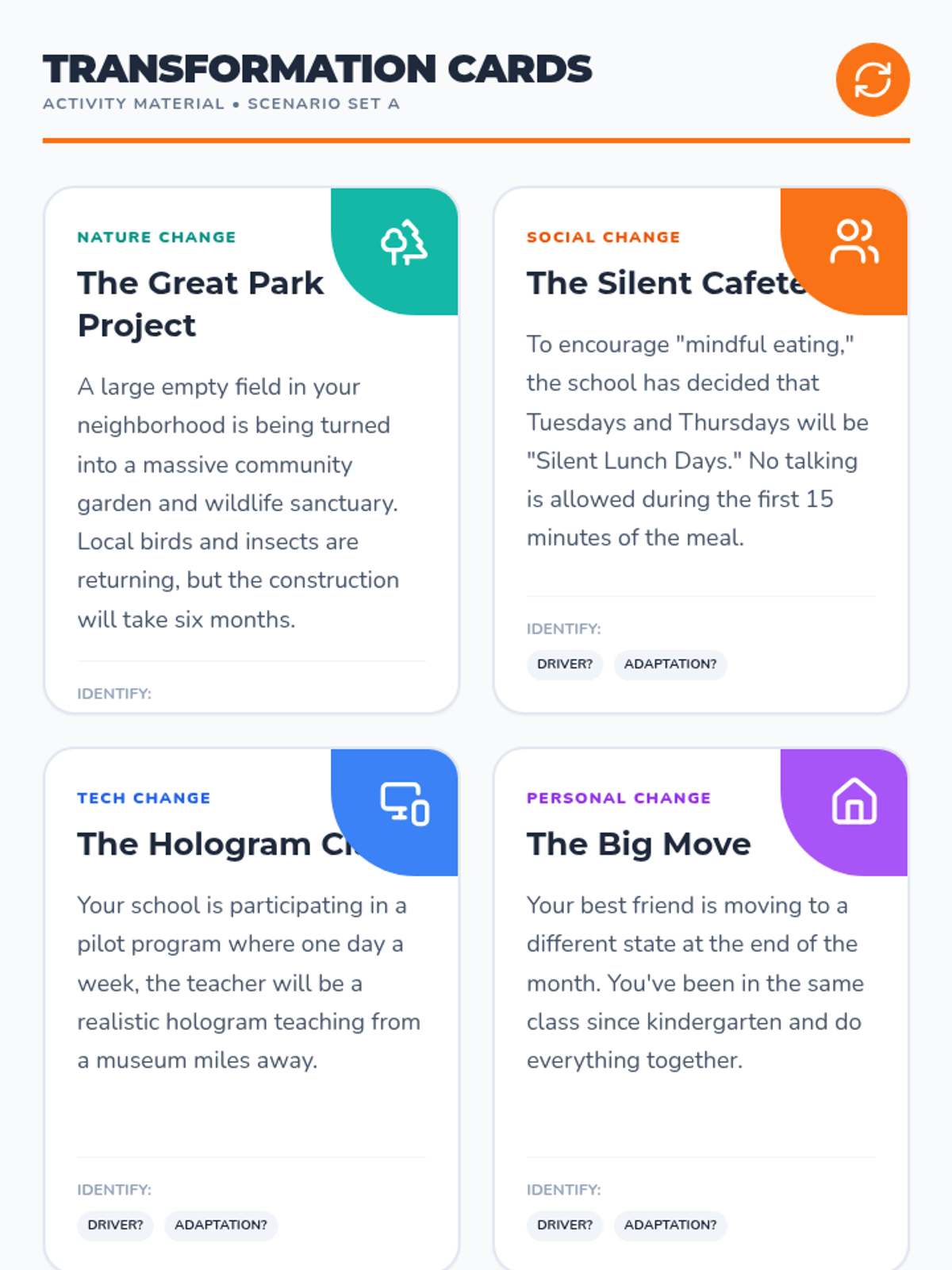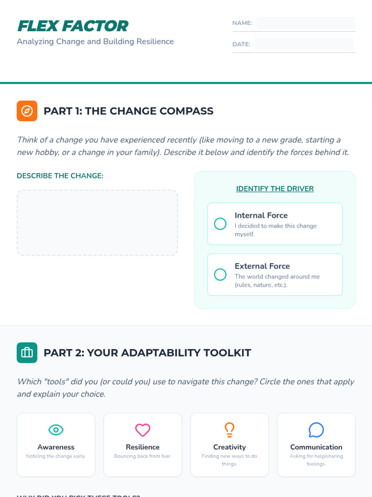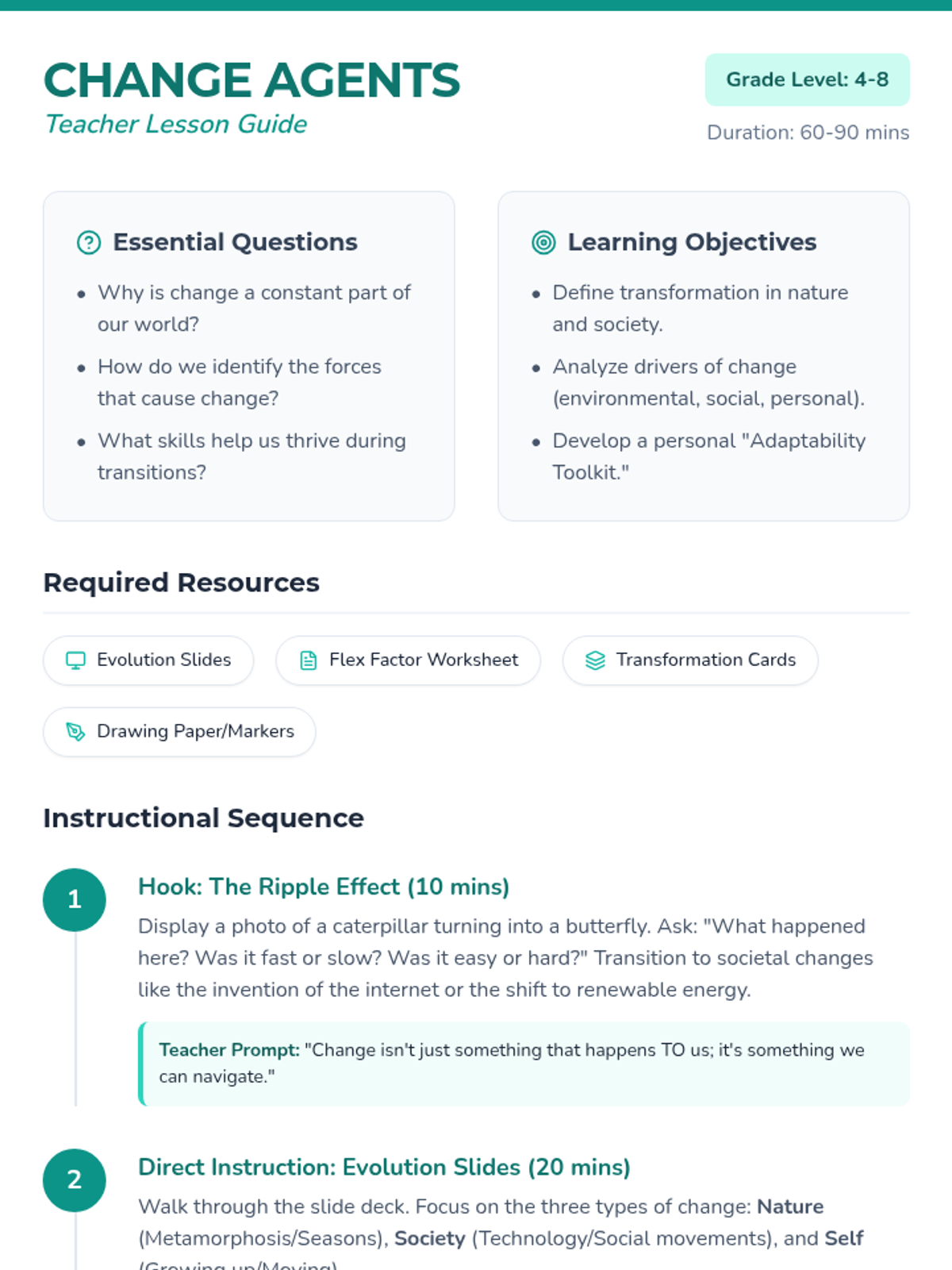 A comprehensive lesson exploring personal and societal transformation, identifying drivers of change, and building adaptability skills through nature and history examples.