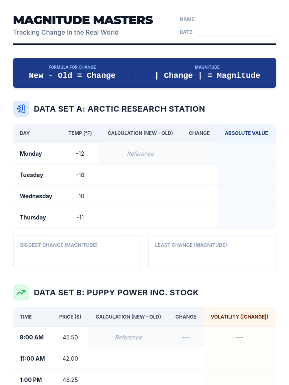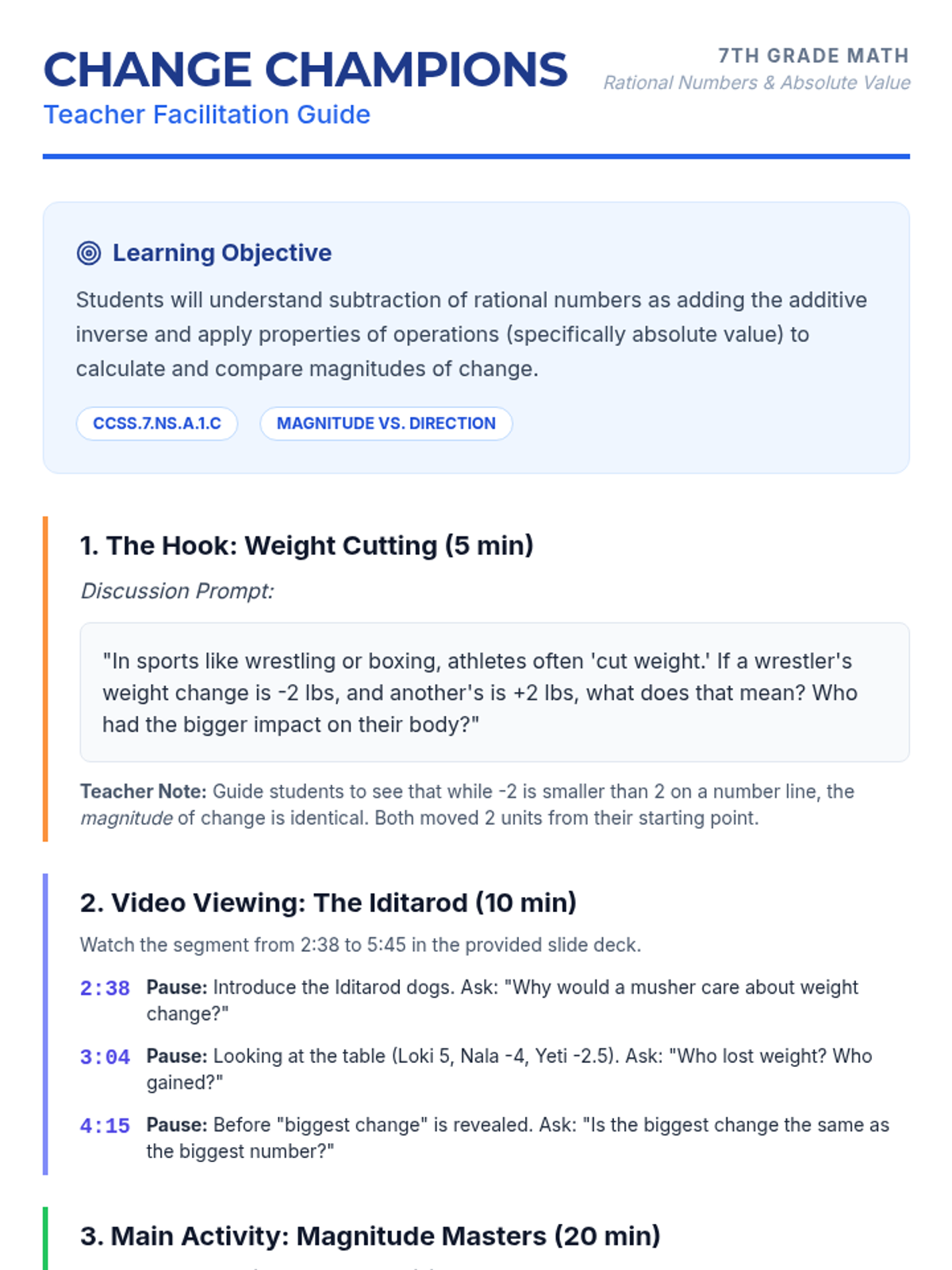 A 7th-grade math lesson focusing on absolute value, magnitude of change, and subtraction of rational numbers using real-world contexts like the Iditarod and the stock market.