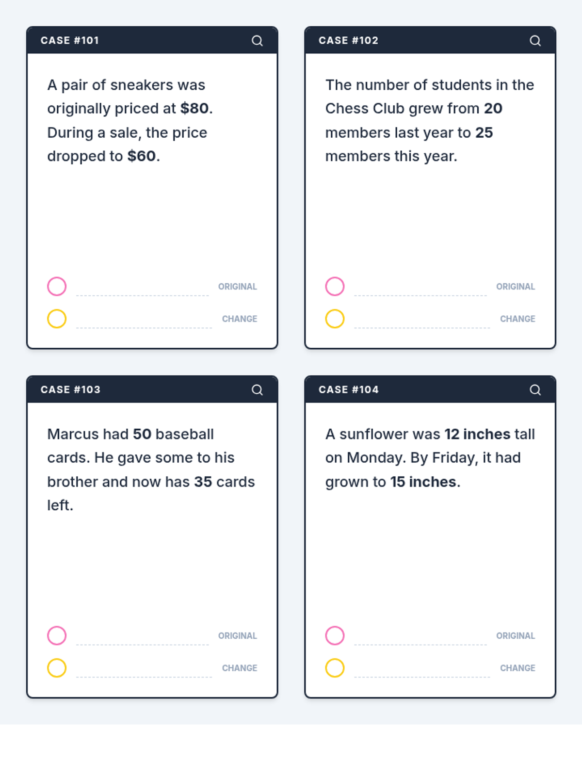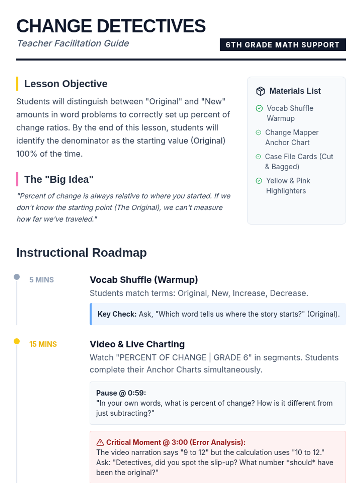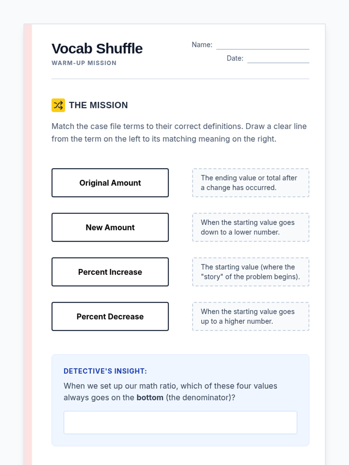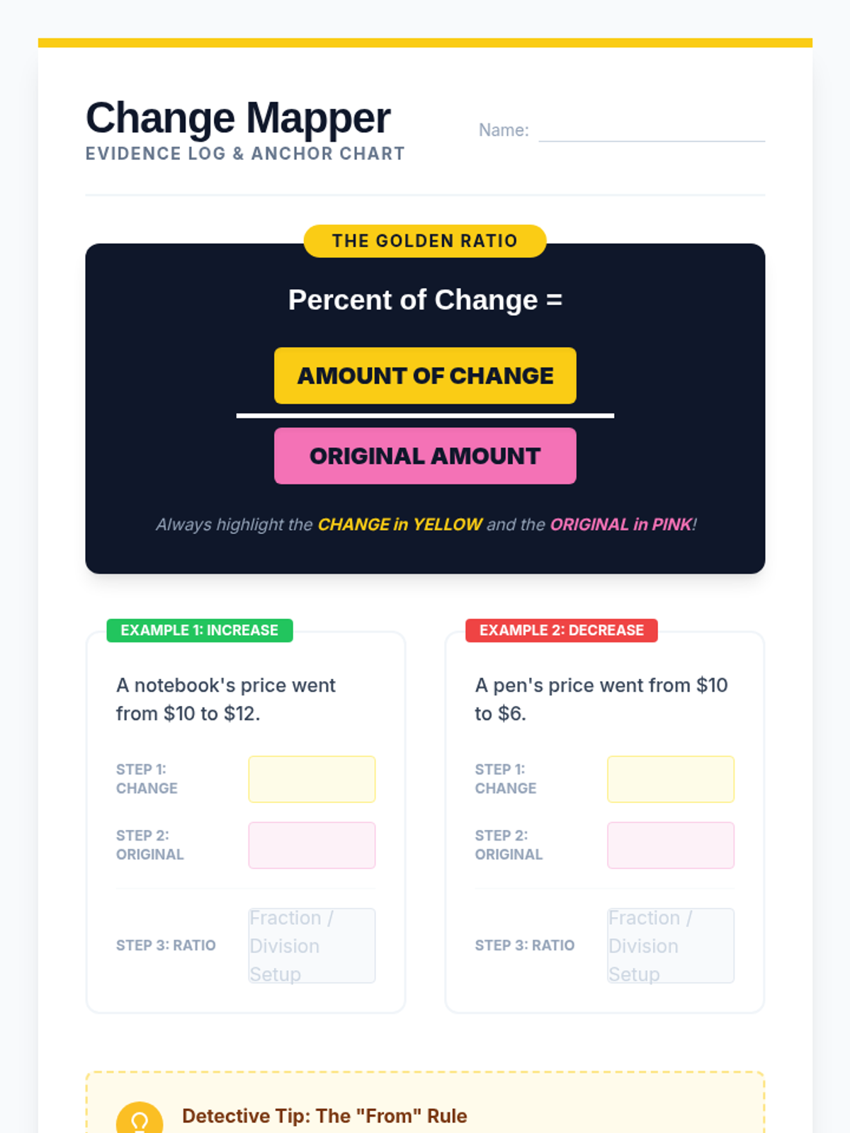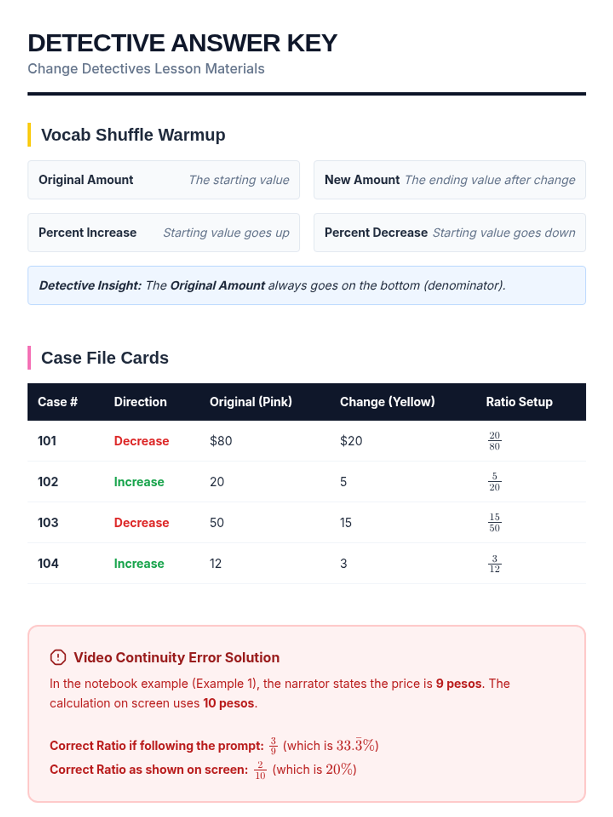 A targeted remediation lesson helping students identify original vs. new amounts and set up percent of change ratios using the 'Yellow for Change, Pink for Original' color-coding system. Includes a vocabulary warm-up, guided video analysis with error detection, and a hands-on card sorting activity.