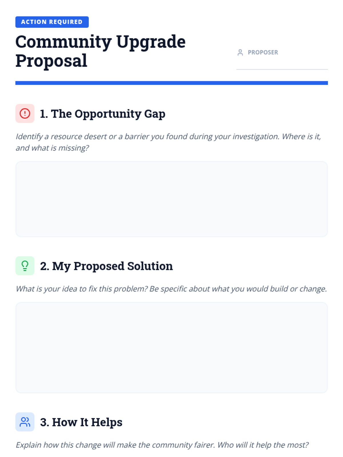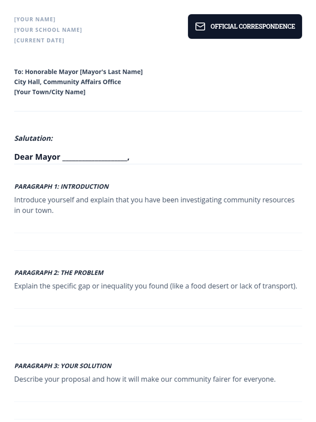 Students synthesize their learning by identifying a specific community gap and writing a formal proposal to a local leader for improvement.